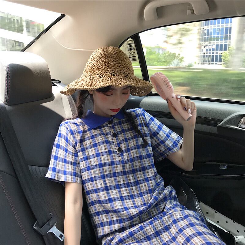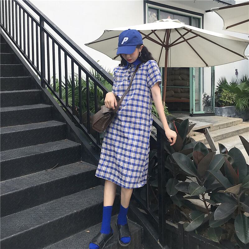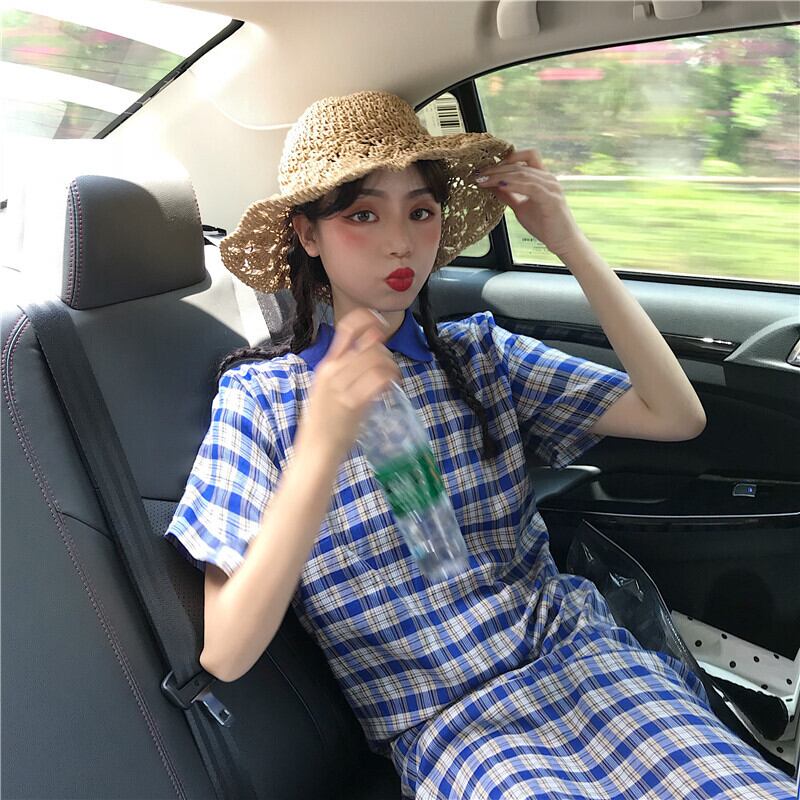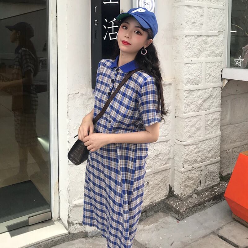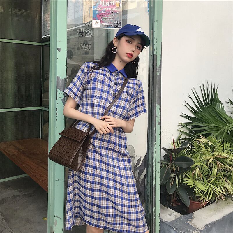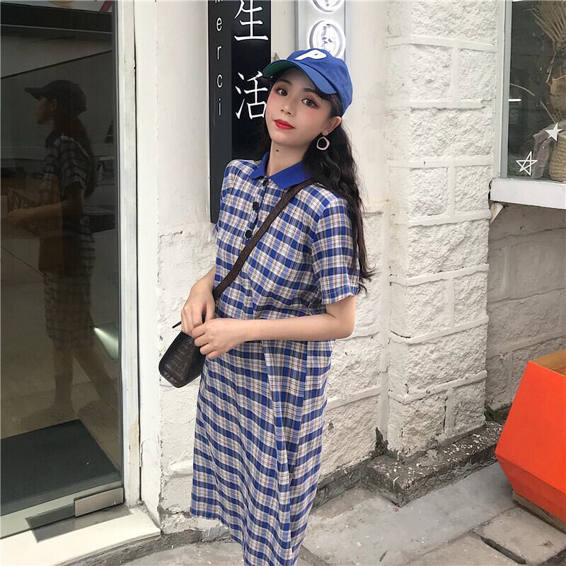 2020年夏の香港スタイルのポロカラーチェック柄半袖ドレス学生カジュアルTシャツロングスカートの新しい女性バージョン 1号婦人26414813566
