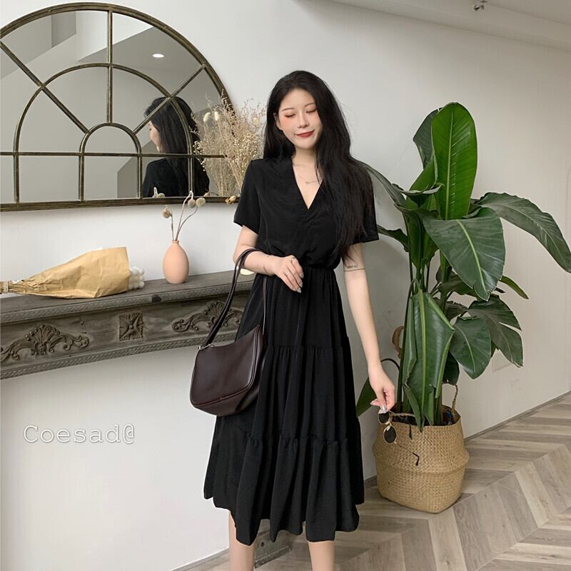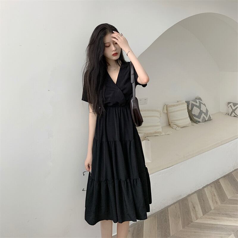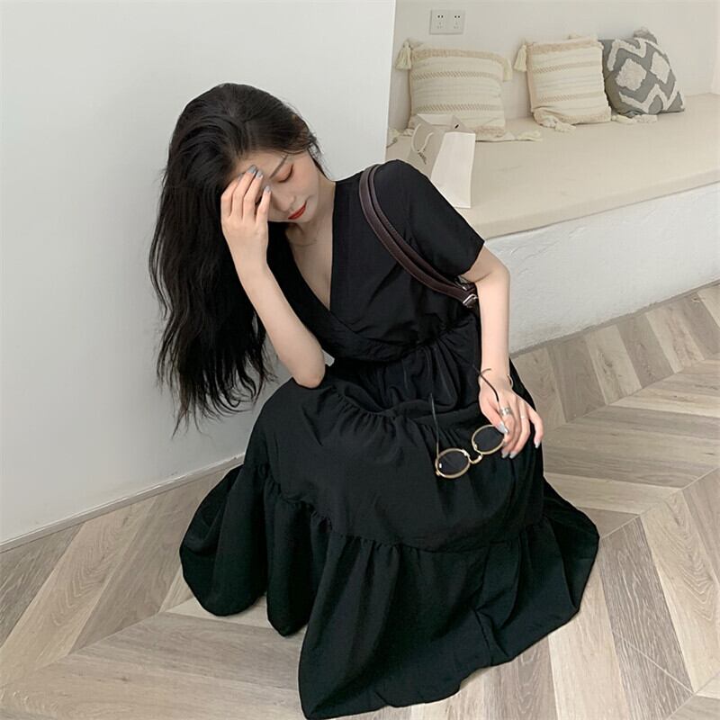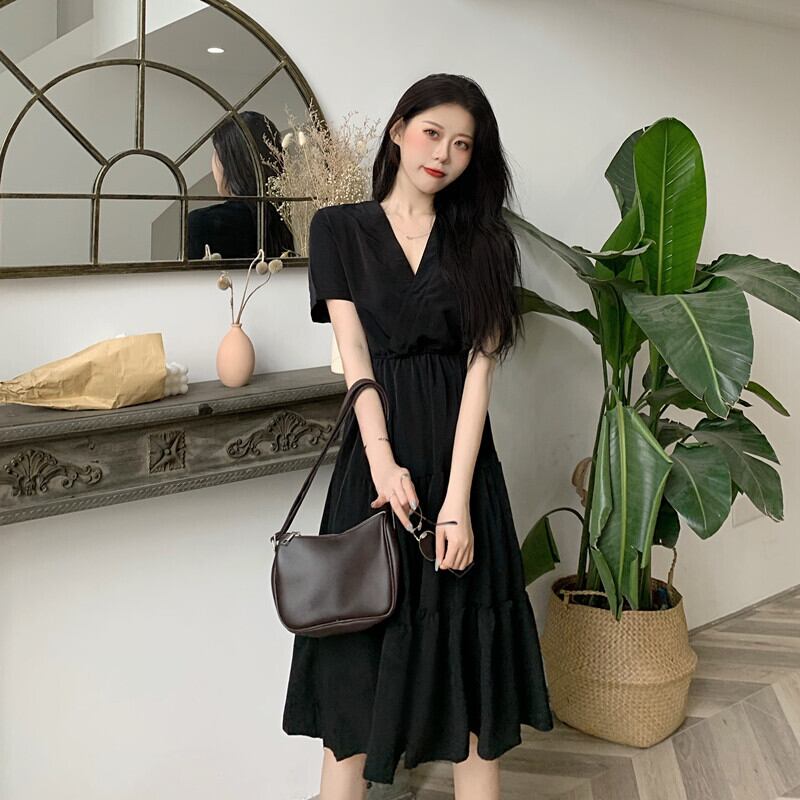 2020年夏の新しい女性のウエストウエストと薄い気質フレンチドレス半袖リトルブラックドレスAラインミドル丈スカート 1号婦人69644297548