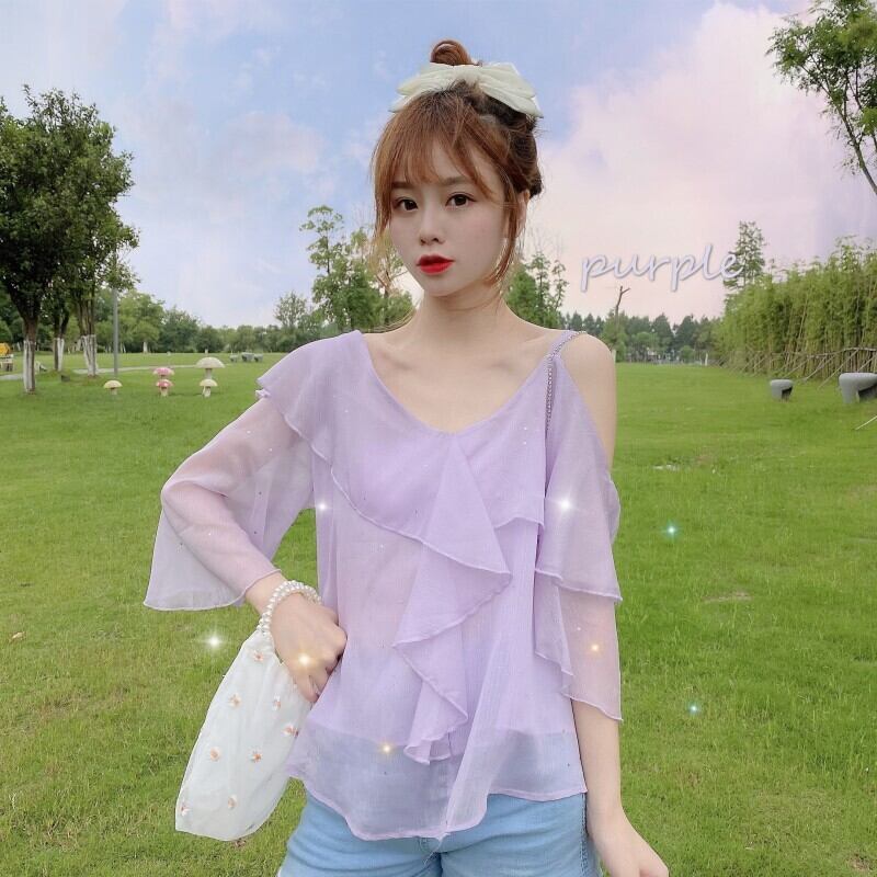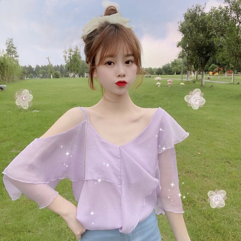 夏の女性の2020年の新しい甘いフリルオフショルダーVネックフェアリーチーオールマッチホーン半袖シフォンシャツ 1号婦人30507327736