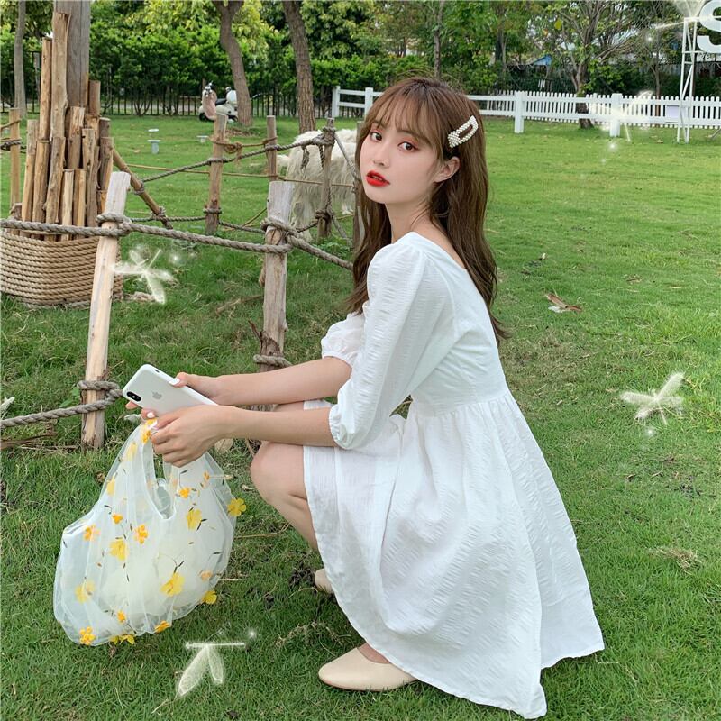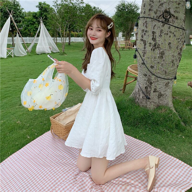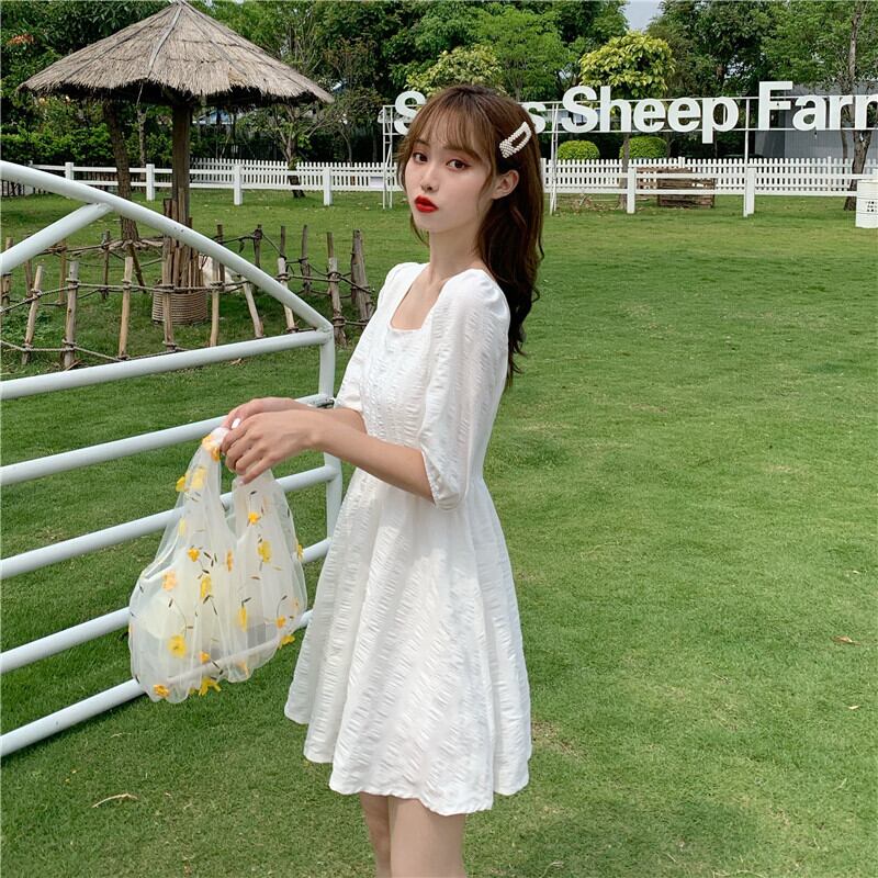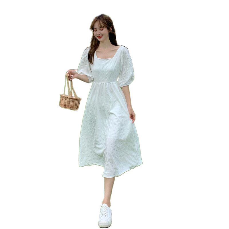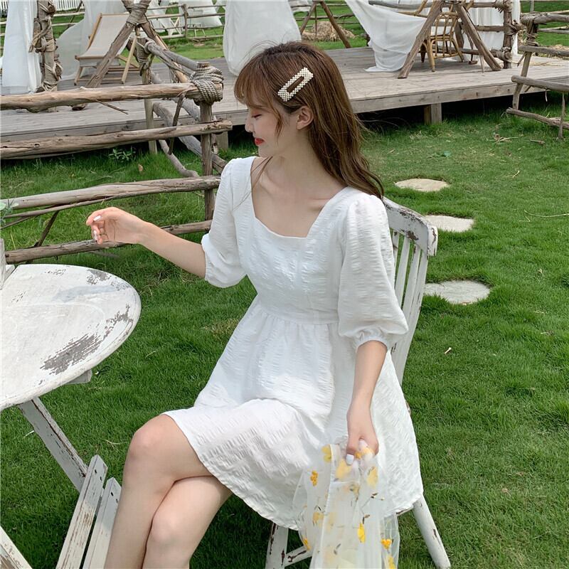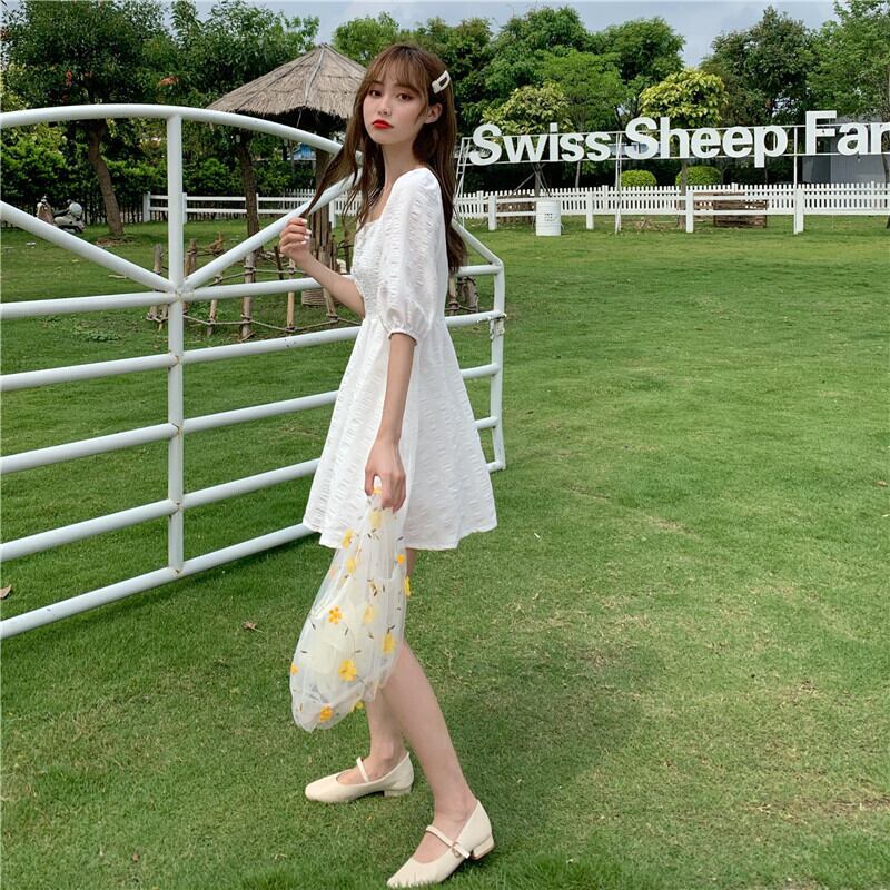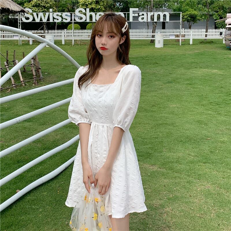 2020年夏のスウィートウエストAラインスカートの新バージョンは薄くて気質のあるスクエアネックパフスリーブホワイトドレス女性 1号婦人28886429266