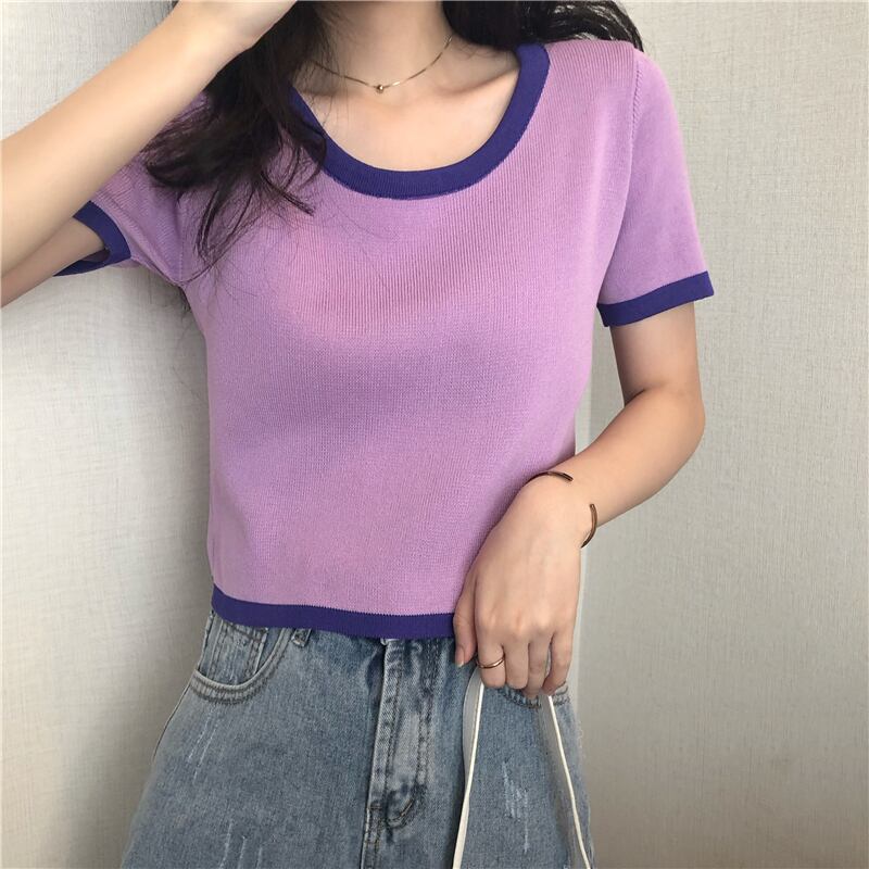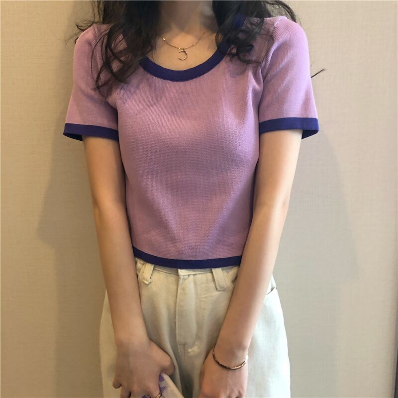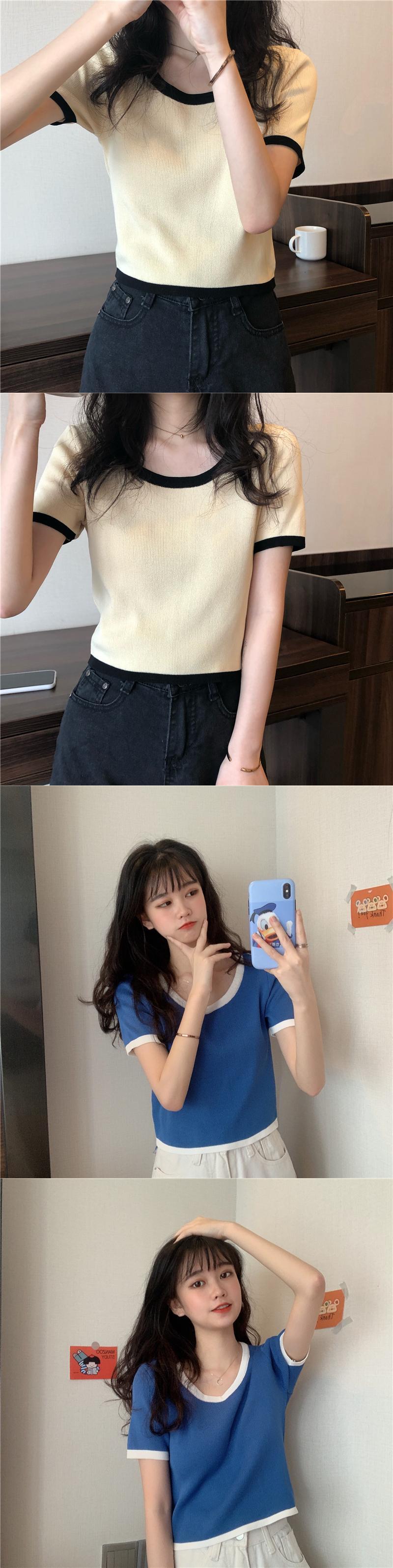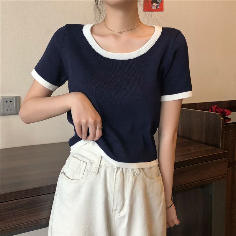 2020年夏のコントラストカラーの新作レディースバージョンスリム半袖ワイルドショートニットTシャツトップボトミングシャツトレンド 1号婦人30030201279