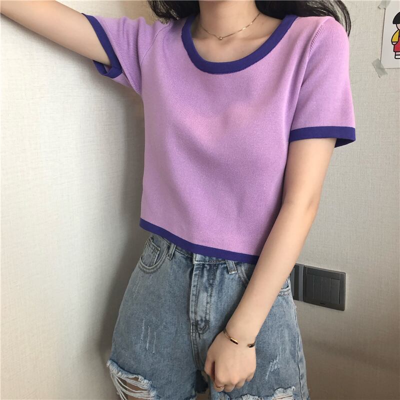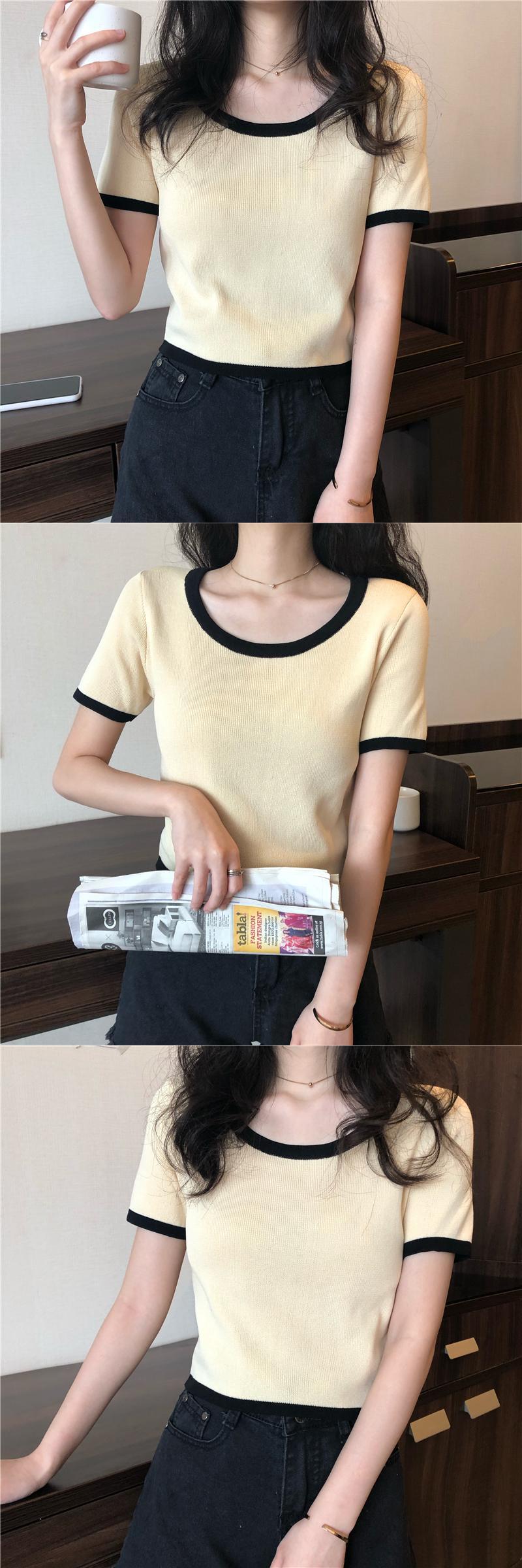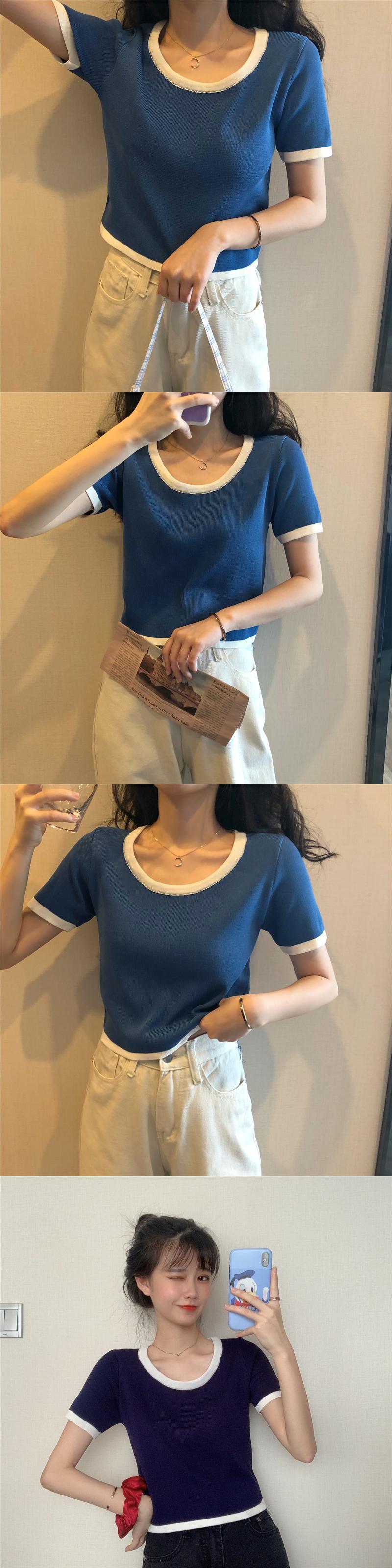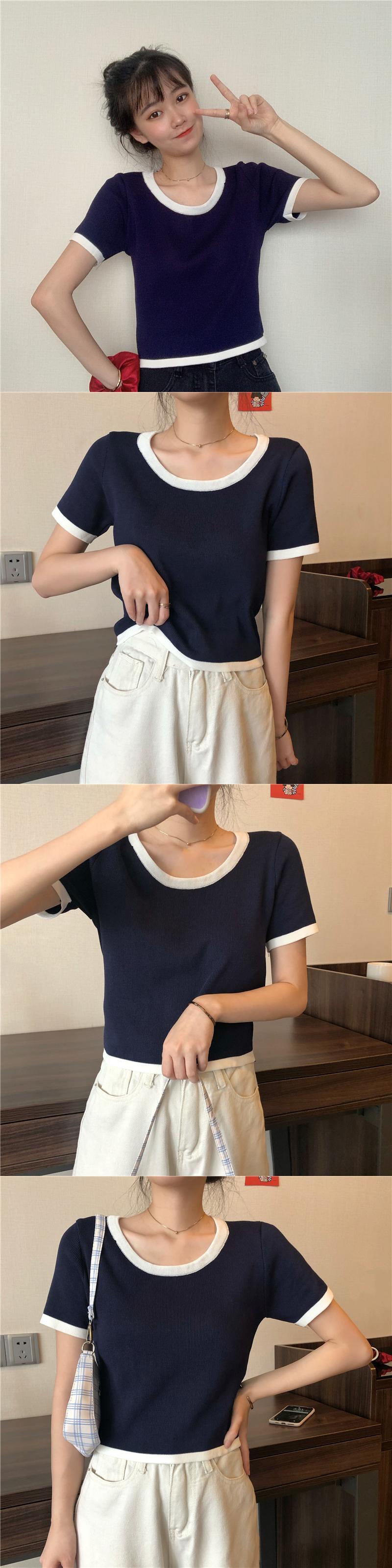2020年夏のコントラストカラーの新作レディースバージョンスリム半袖ワイルドショートニットTシャツトップボトミングシャツトレンド 1号婦人30030201279