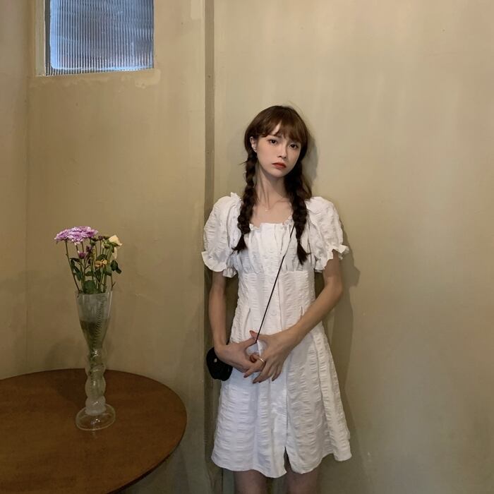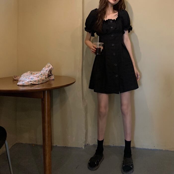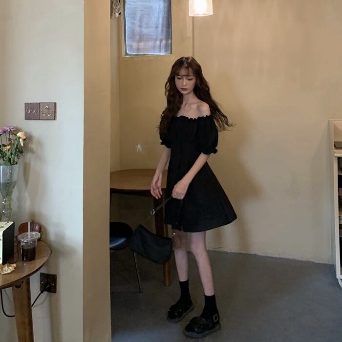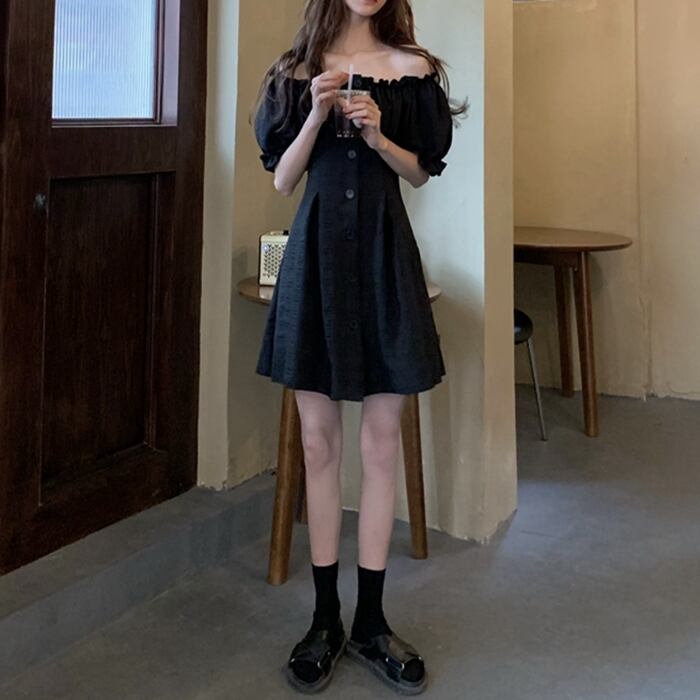 2020年夏の新しいレトロなヘップバーンスタイルのドレス女性の気質ウエストパフスリーブワンショルダーブラックAラインスカート 1号婦人88345390523