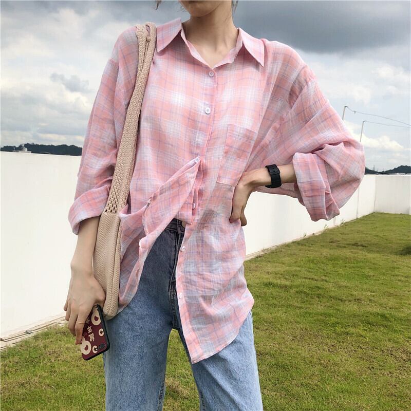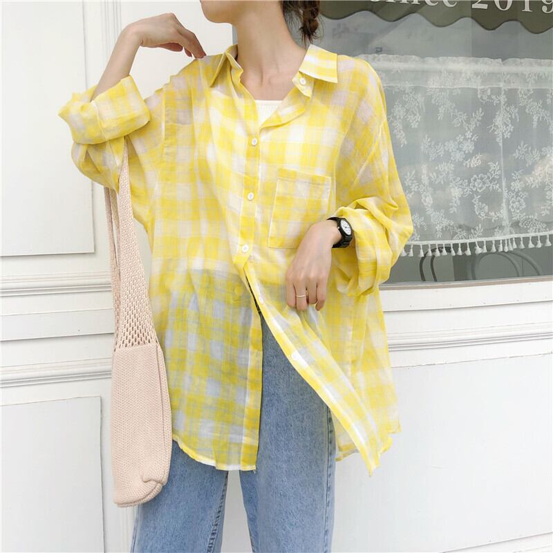 女性の2020年夏の新しいルーズで用途の広いミドル丈の日焼け止めシャツ学生カジュアルパープルチェック柄トップ薄手のコート 1号婦人92331572250