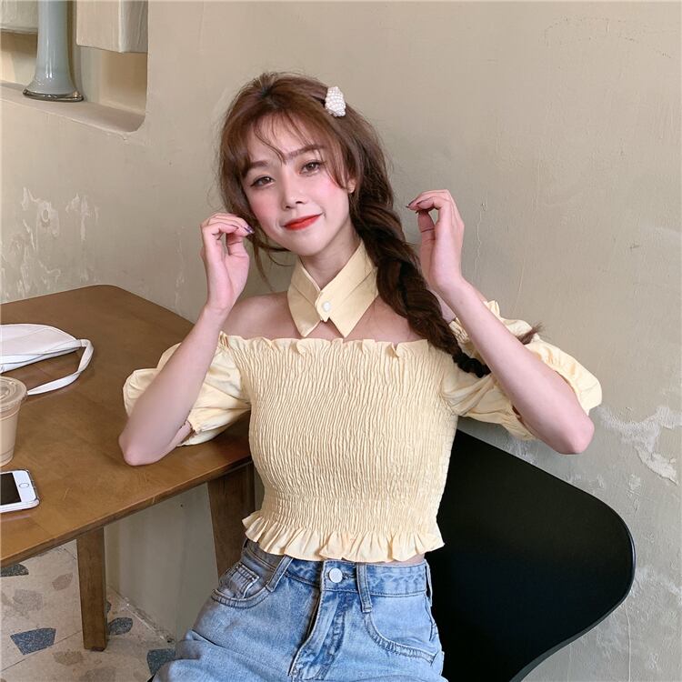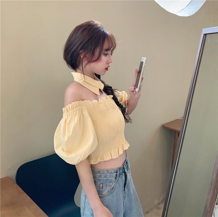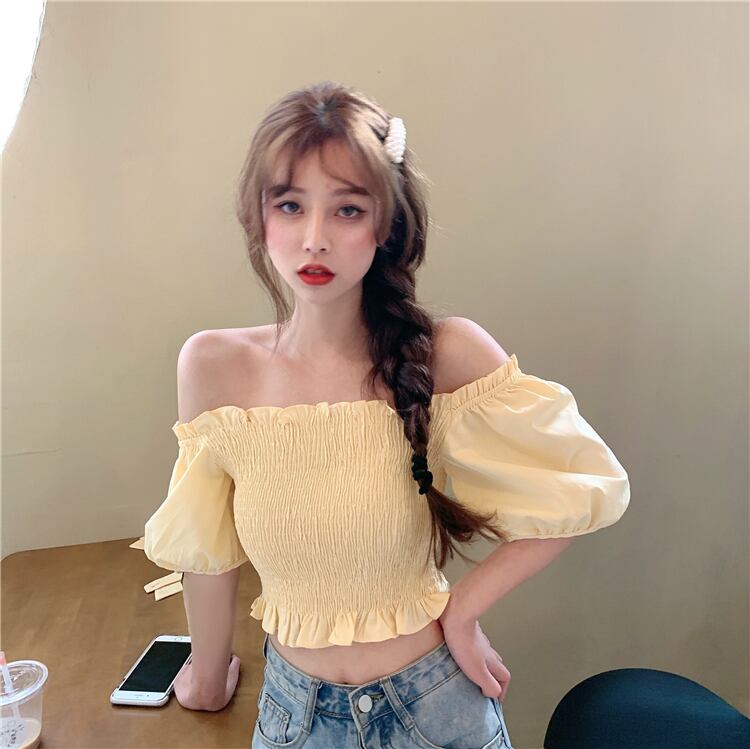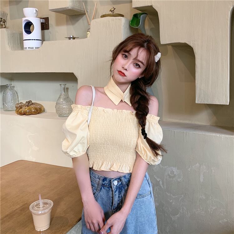 センスニッチシャツレディース2020夏新バージョンのセクシーなワンラインカラーオフショルダーパフスリーブホワイトトップ 1号婦人68925802217