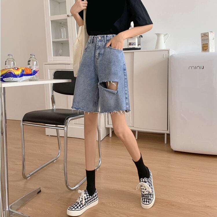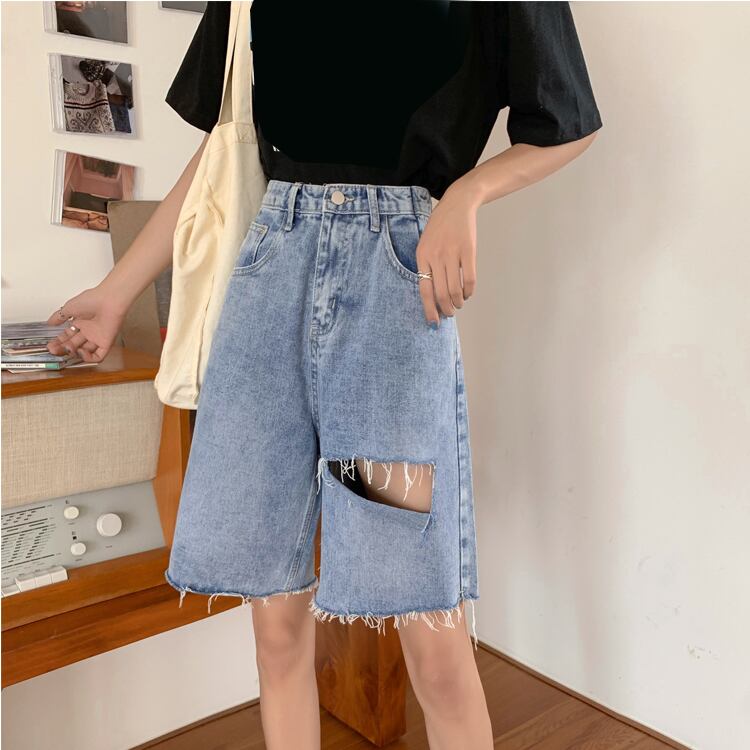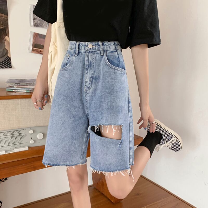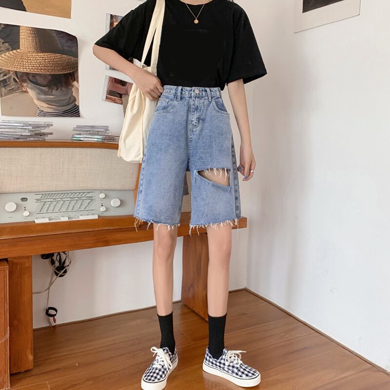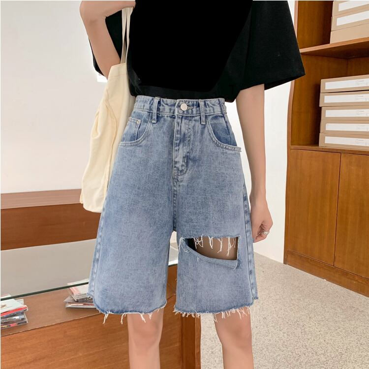 デニムショーツレディース2020新しいルーズストレートレッグ香港スタイルのハイウエストサマーシンセクションシンナーハーフホールパンツ 1号婦人7539297575