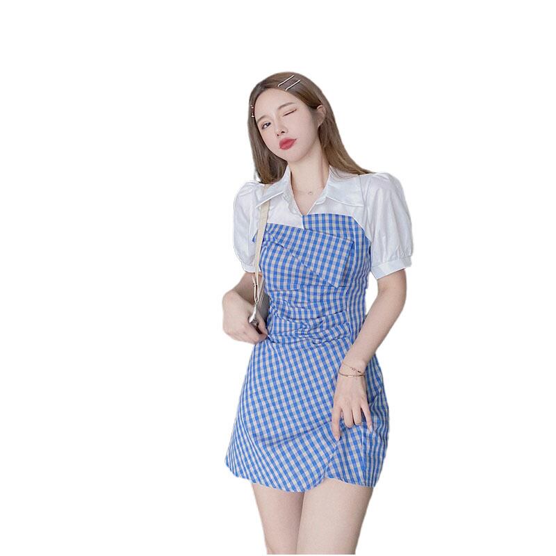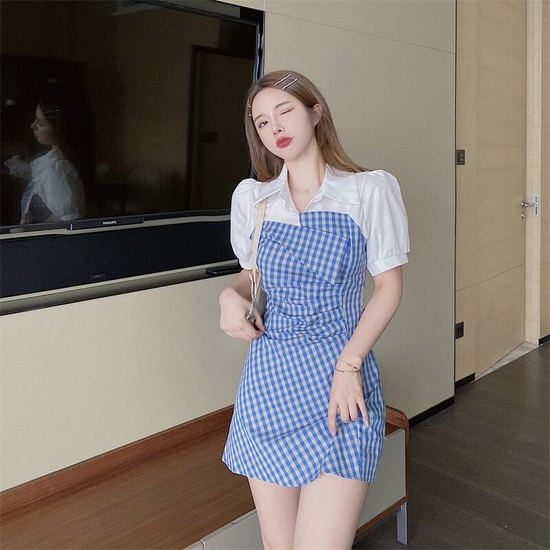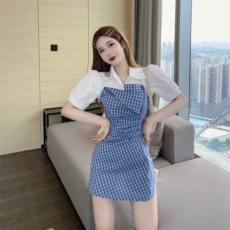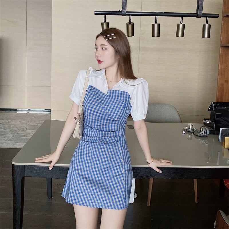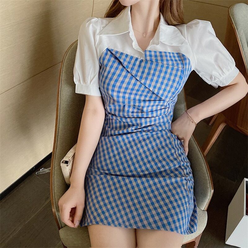気質ドレス女神ファン2020新夏チェック柄ステッチフェイクツーピースシャツスカートウエストショートスカート 1号婦人14633197616