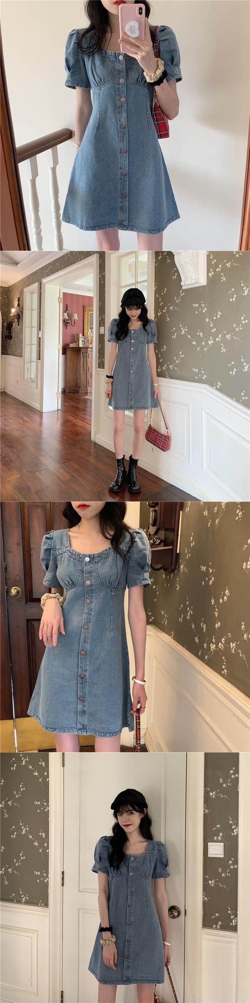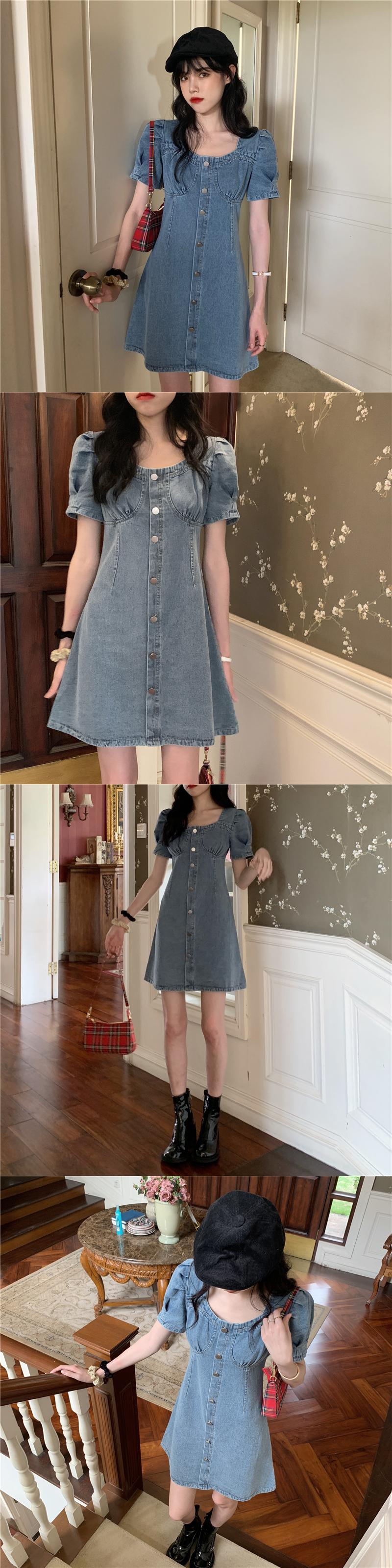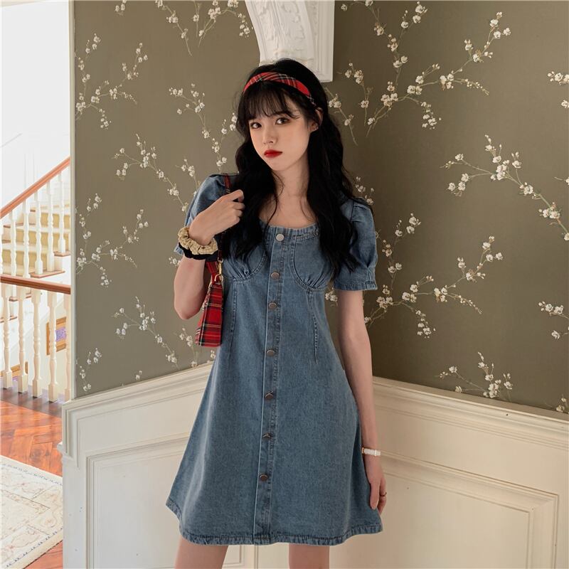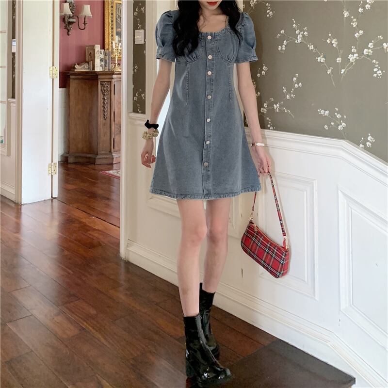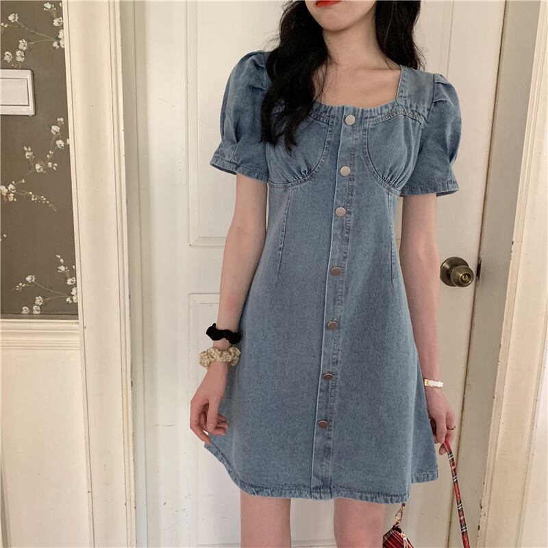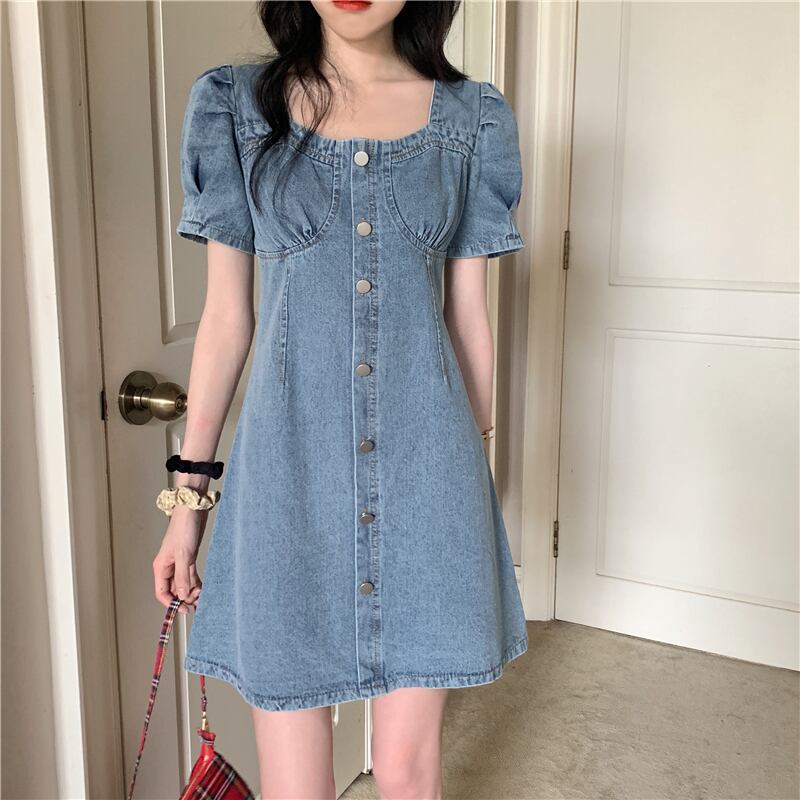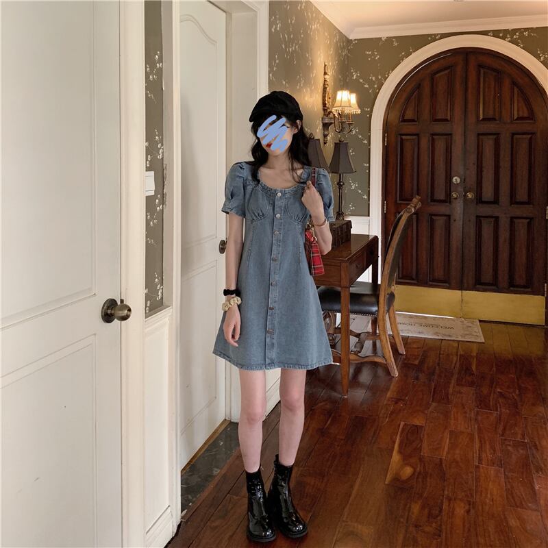 フレンチレトロパフスリーブワンピース2020年夏新作スクエアネック気質ウエストスリムデニムスカートメススカート 1号婦人96612317575