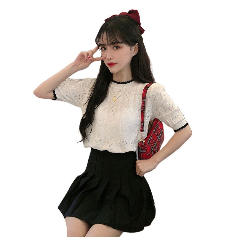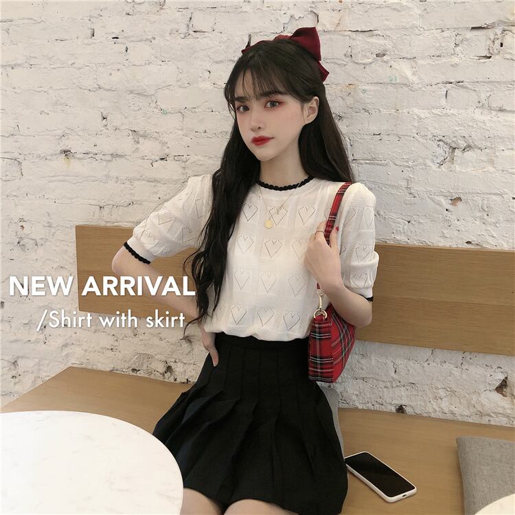 2020年夏ファッションツーピース女性ハーフスリーブラウンドネックセーター+ブラックハイウエストプリーツスカートスーツトレンド 1号婦人17659621629