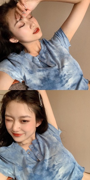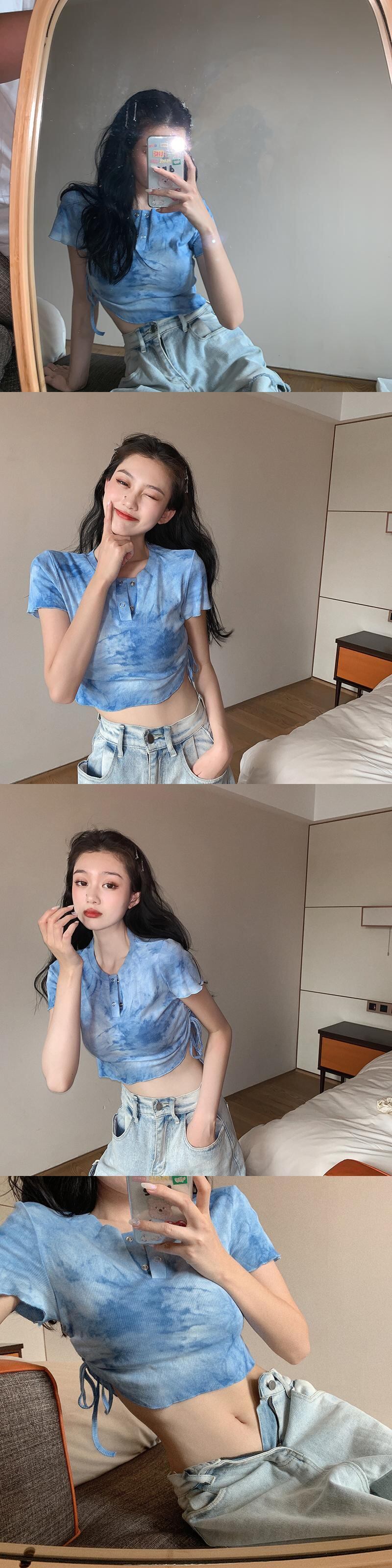夏の新しい個性青い絞り染め露出へそTシャツ女性の夏のレースはスリムな痩身ボトミングシャツトップを折ります 1号婦人41547484831