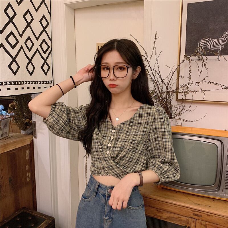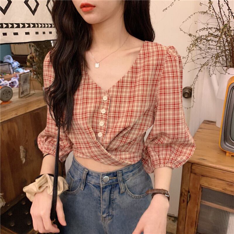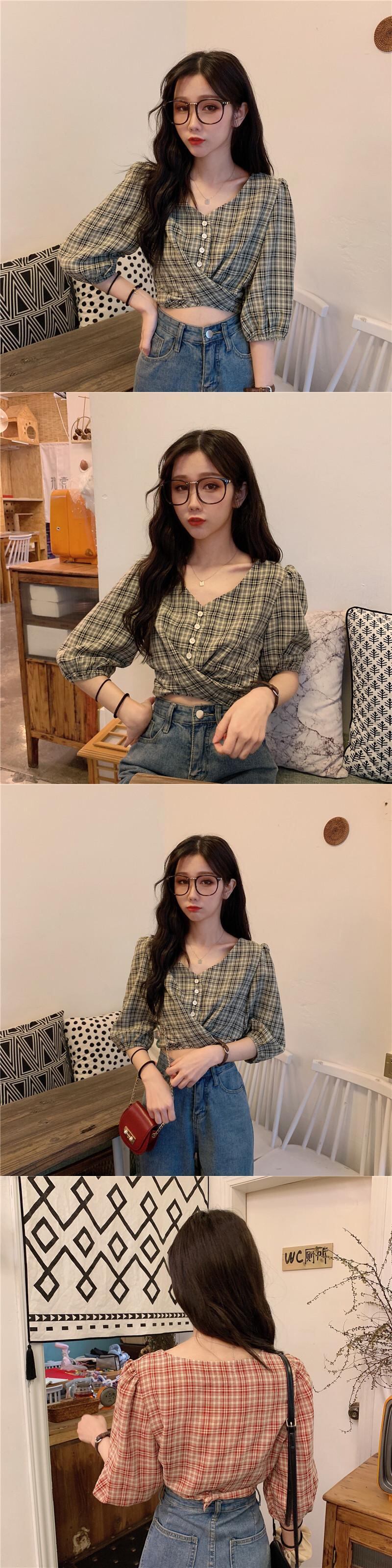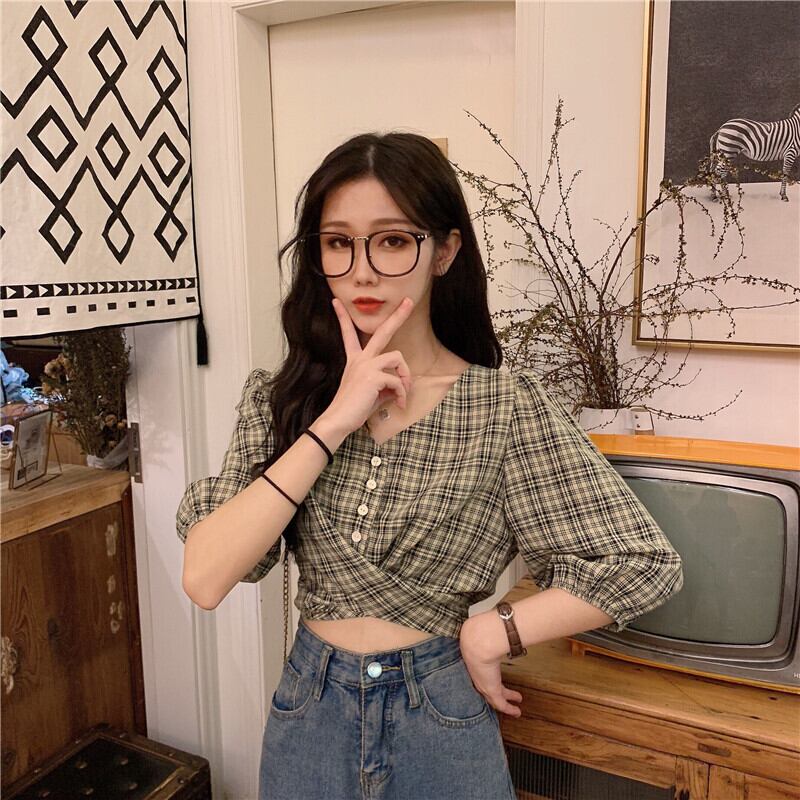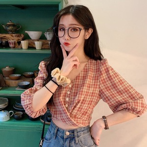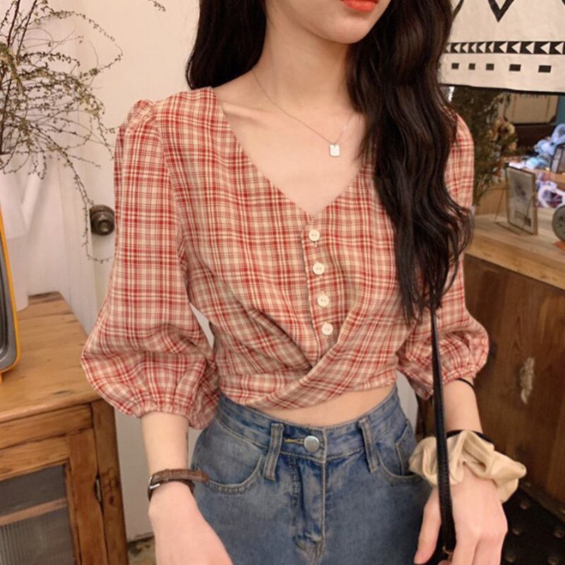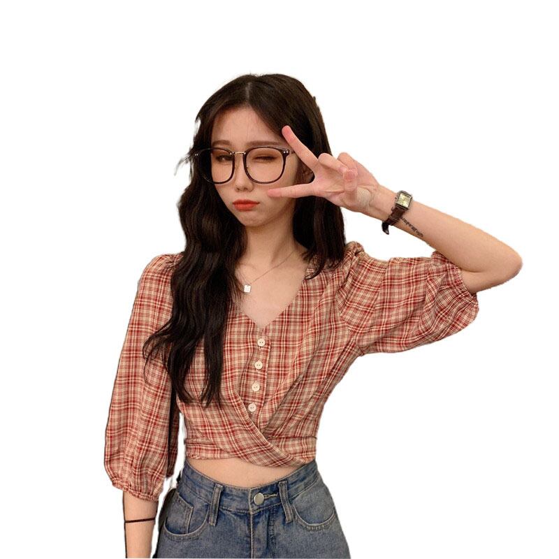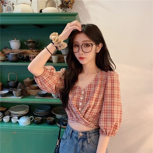 パフスリーブトップの新しい2020年夏の薄いレディースブラウスは薄くて通気性のあるVネックレトロショートスモールシャツです 1号婦人79203716857