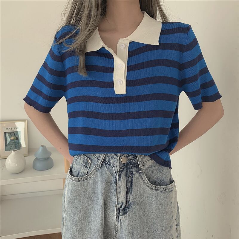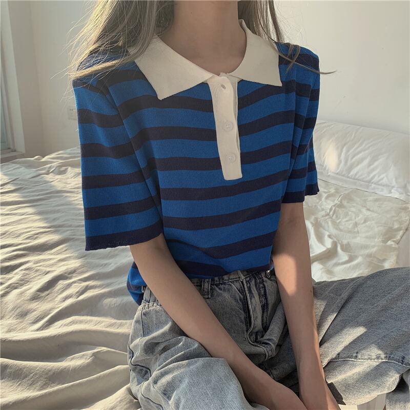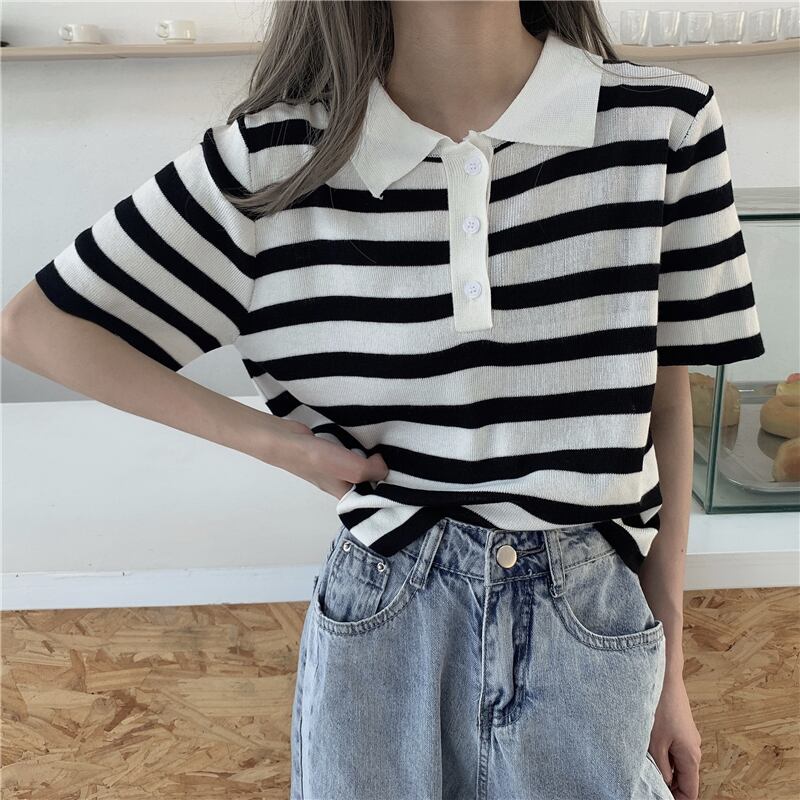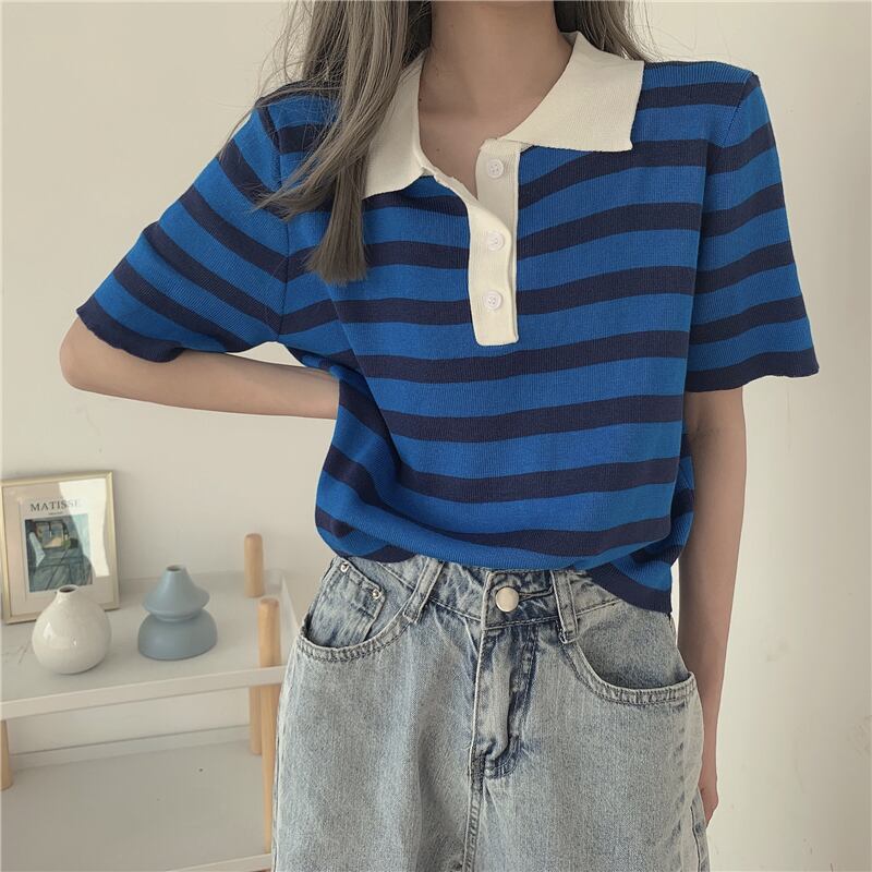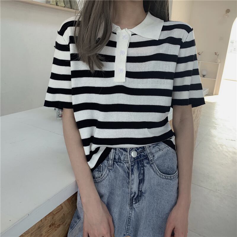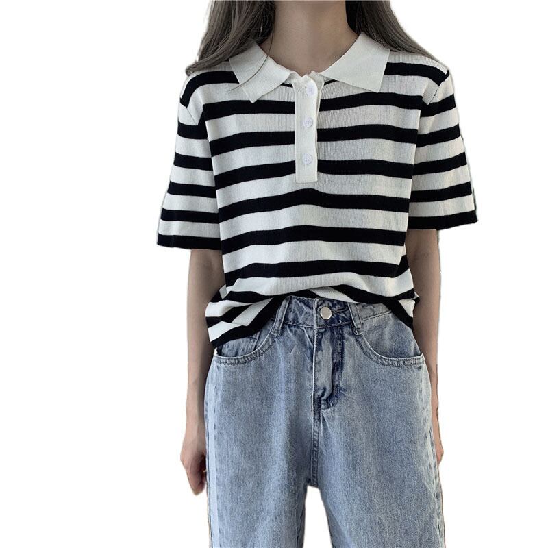 ボトムシャツタイド半袖2020年新夏レディースバージョンのポロカラーストライプセータールーズオールマッチブラウス 1号婦人51511178031