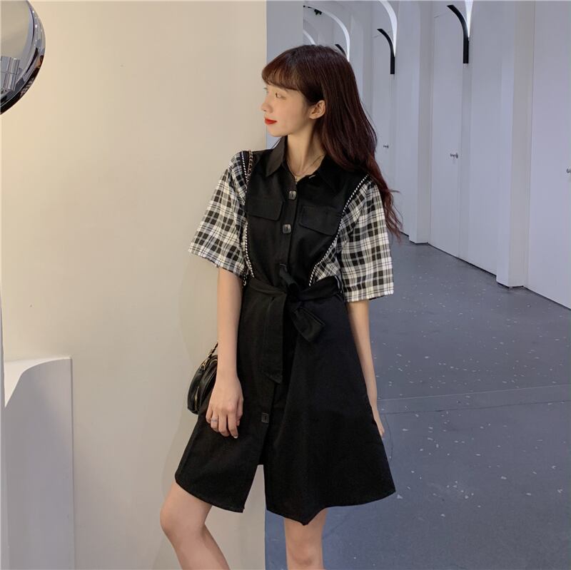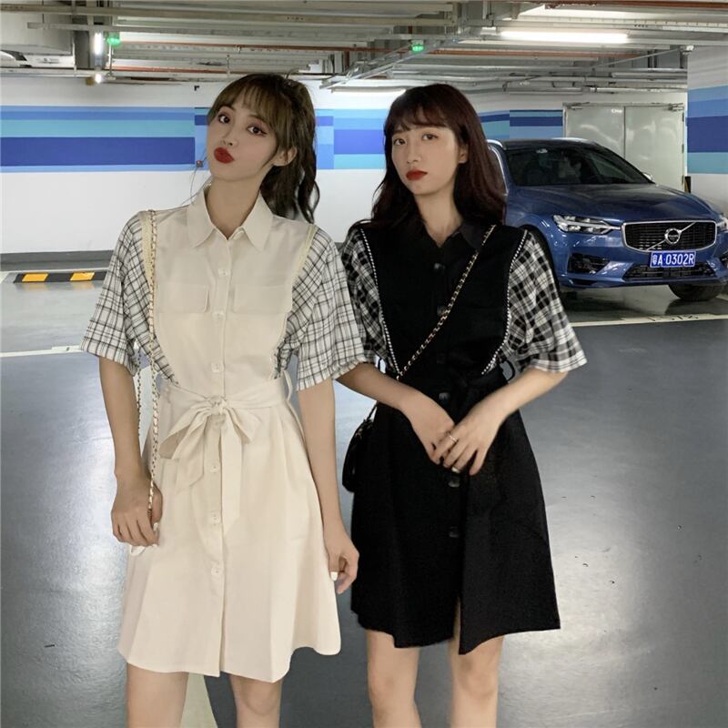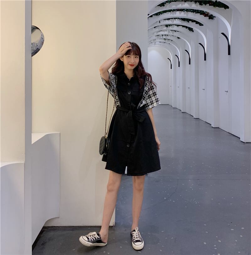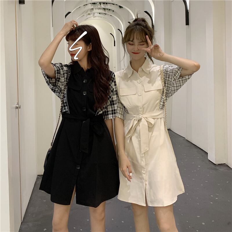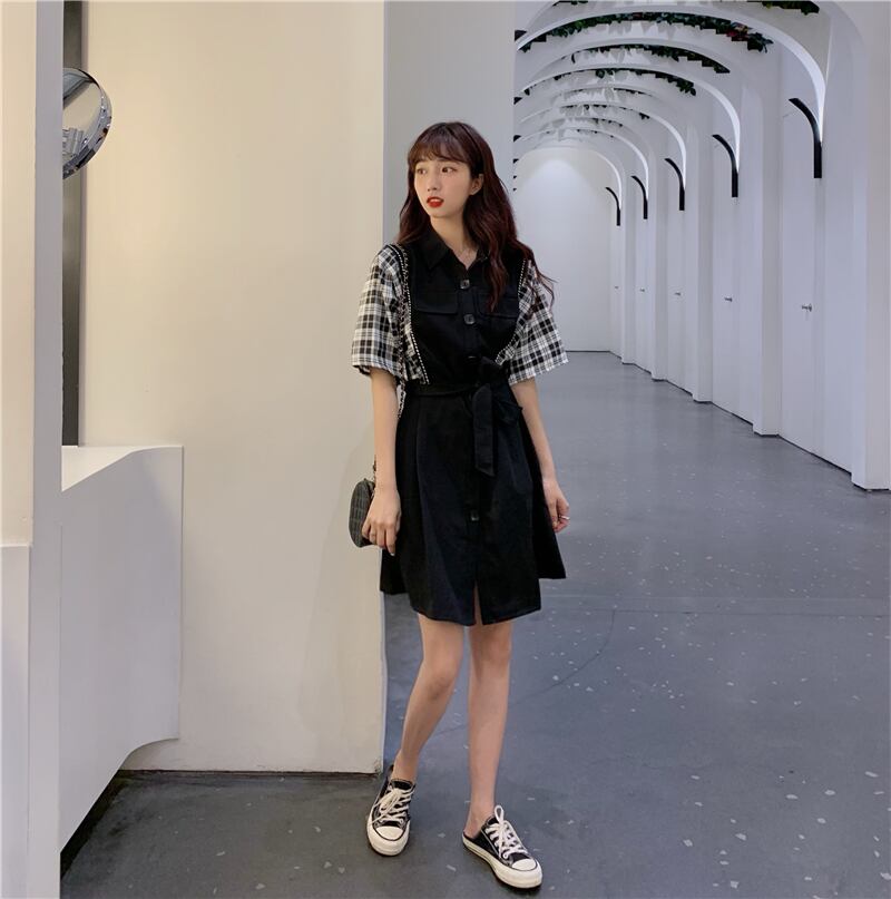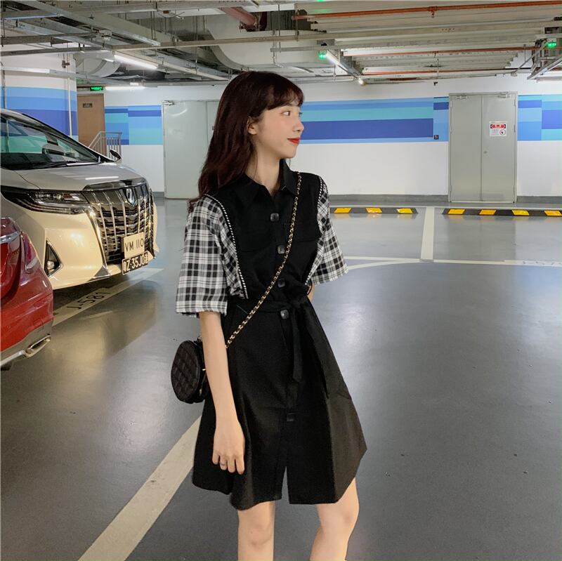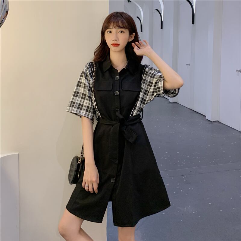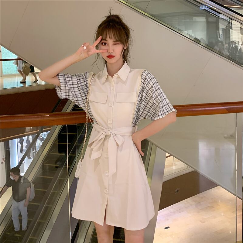 2020年夏の新しい女性の気質ウエストスリミングレトロチェック柄ステッチドレスフレンチラペルAラインスカート 1号婦人96186972156