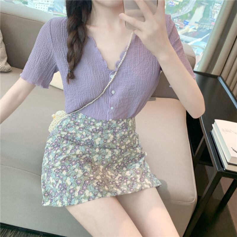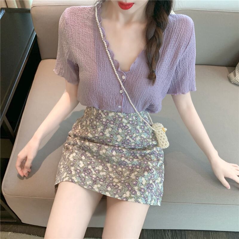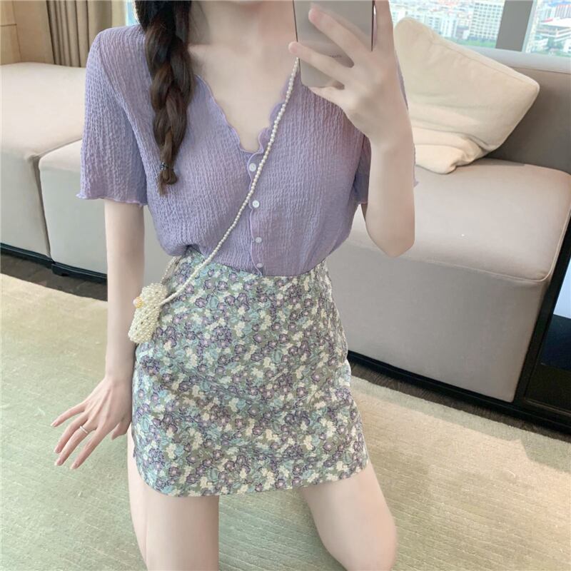 カジュアルスーツ女性夏折り気質Vネックシフォンシャツフローラルバッグヒップ細いAラインスカートツーピーススーツ 1号婦人45822061549