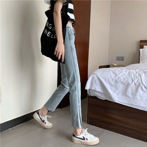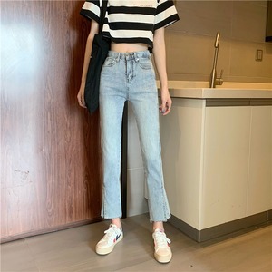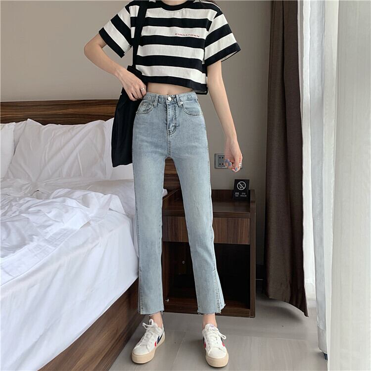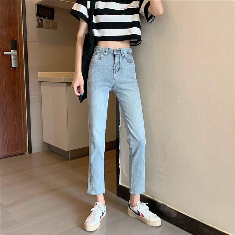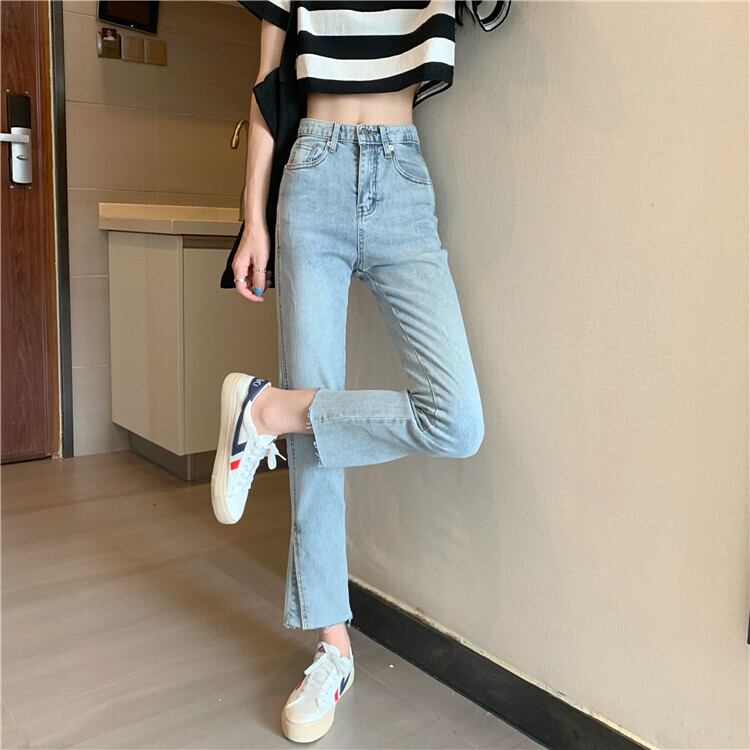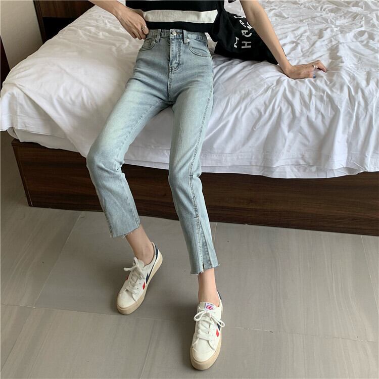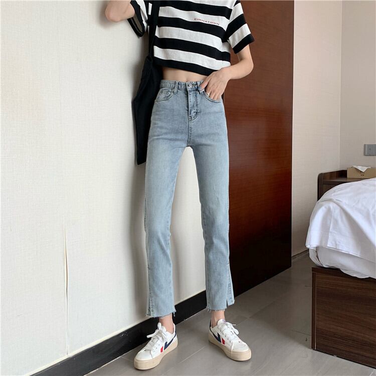 2020年夏の新作レディースバージョンのオールマッチハイウエストシンライトカラーストレートスプリットジーンズ、生のエッジ 1号婦人7477219198