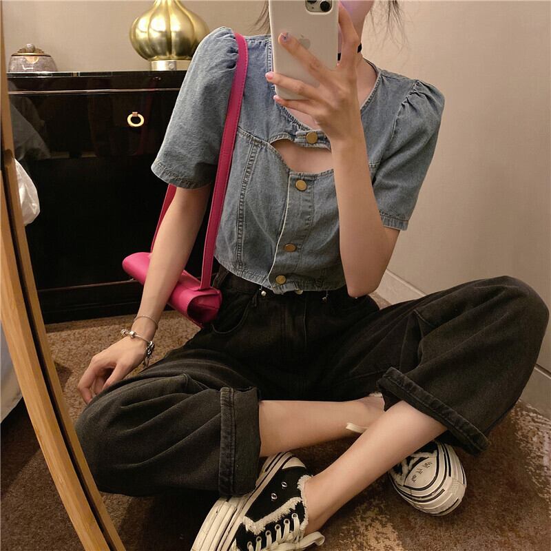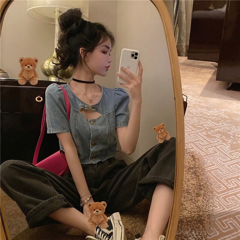 2020年新作夏デザインセンスニッチバブルスリーブショートシンデニムクロップド鎖骨半袖トップス 1号婦人9815782199