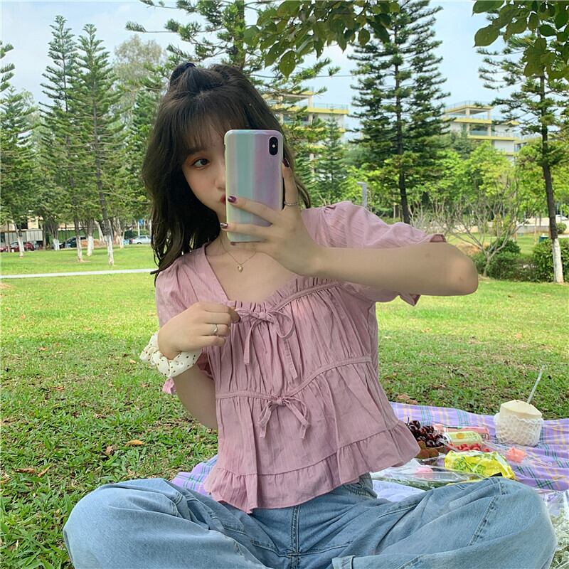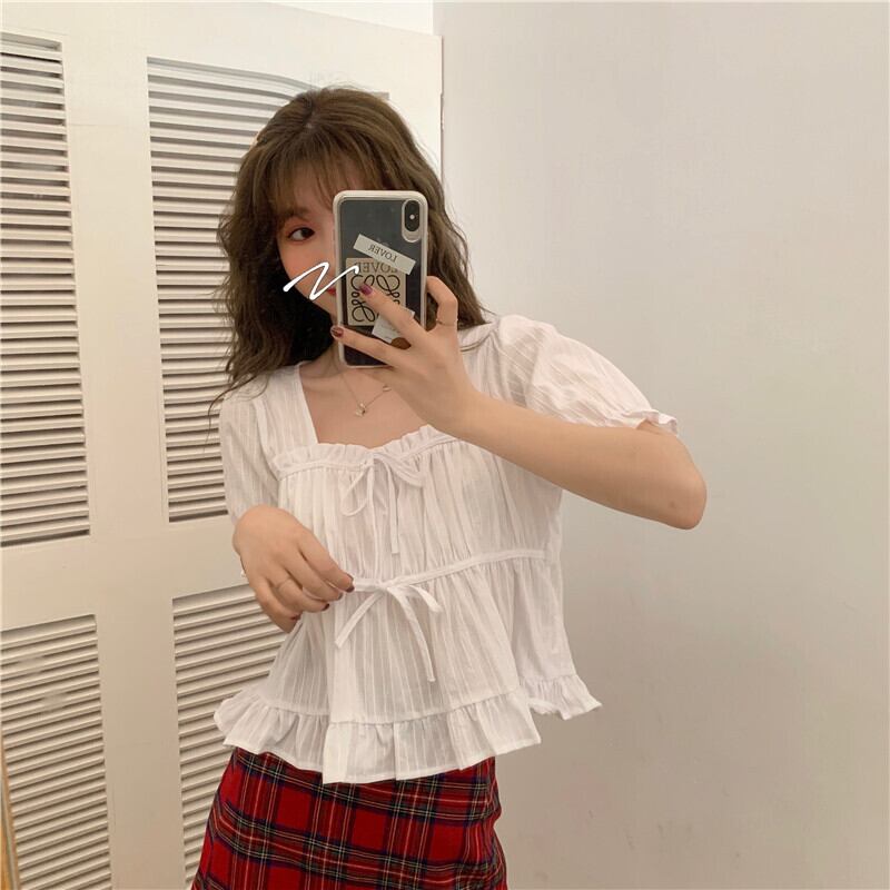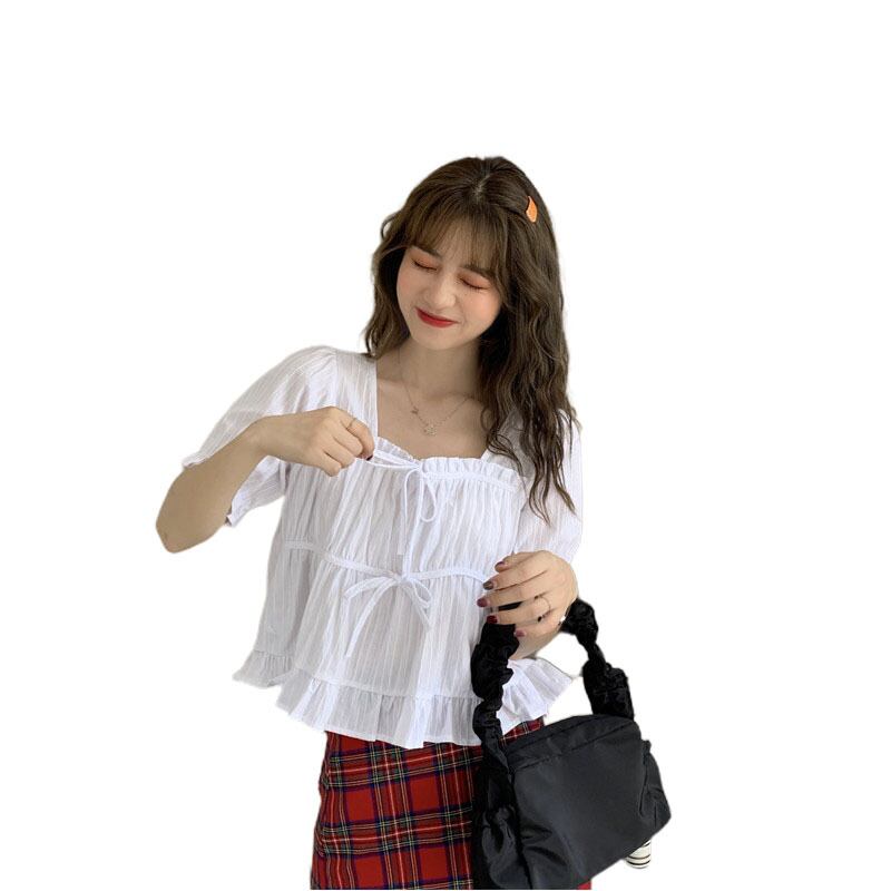 穏やかな風2020年夏新しいスタイルの真菌の正方形の襟は薄い短いレースアップ半袖ファッションシフォンシャツの女性です 1号婦人10419488886