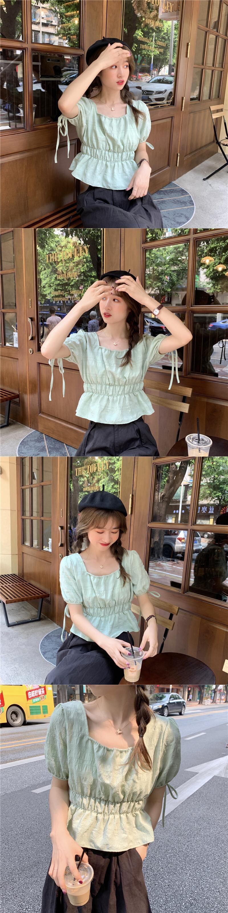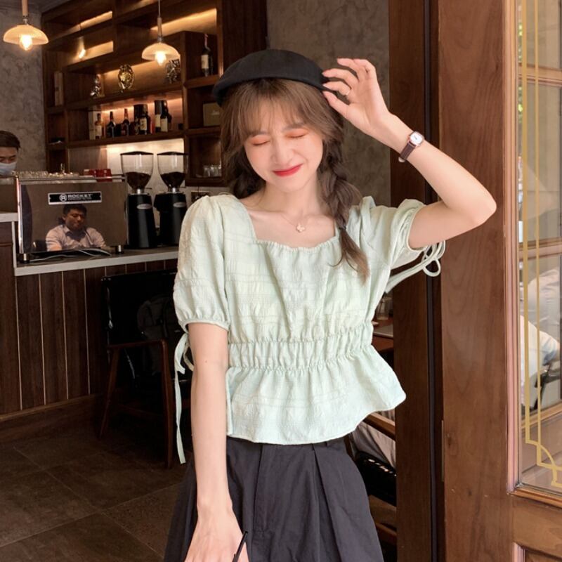2020年夏の新作女性デザインセンスパープルフォールドスクエアネック薄手の優しいスタイル半袖ウエストシャツトップ 1号婦人19253831300