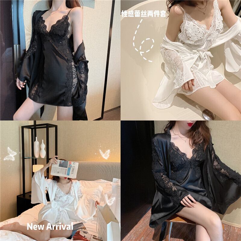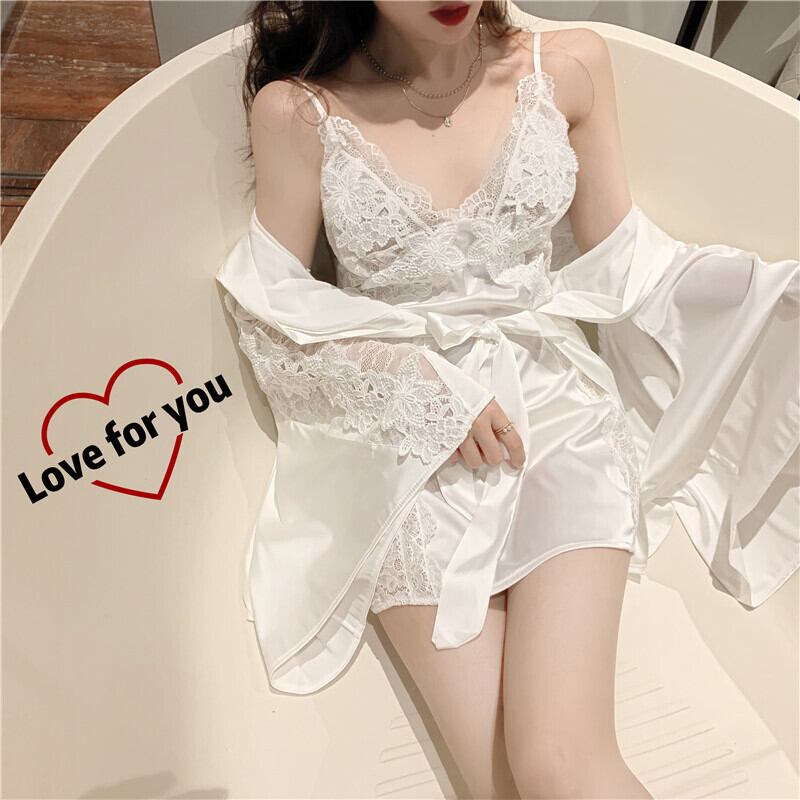 夏のホームウェアパジャマセットフェミニンなレースの中空Vネックスリングドレス+ナイトガウン 1号婦人62296542582