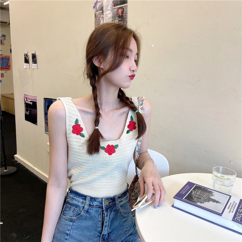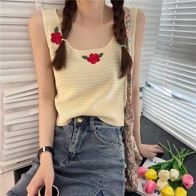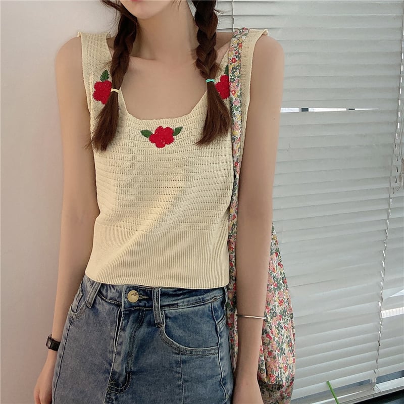サマーブラウス ノースリーブショートニット レッド 刺繍 夏物 フラワーデザイン 1号婦人45630037443