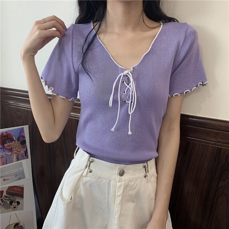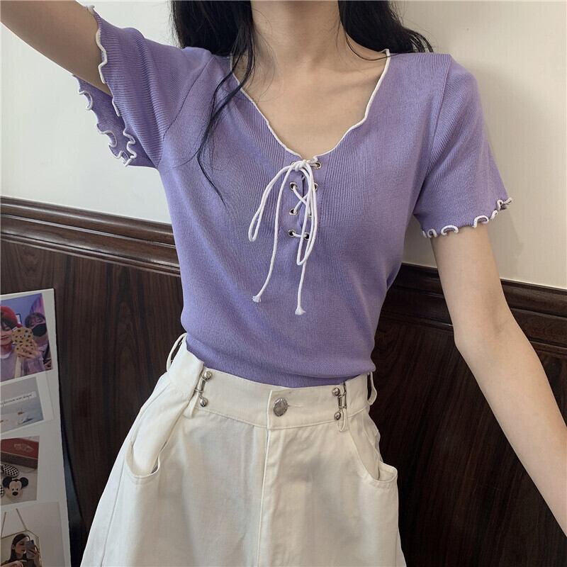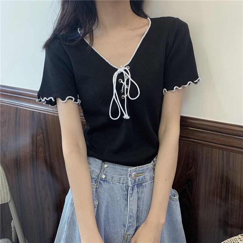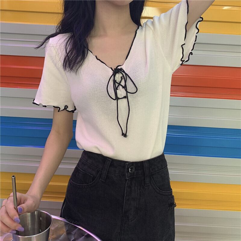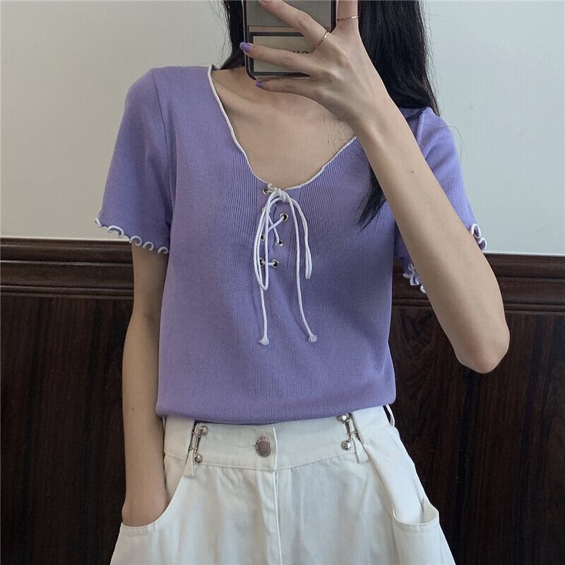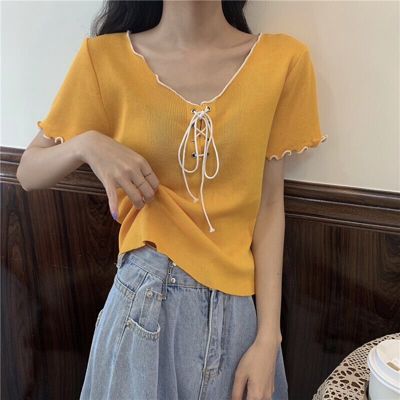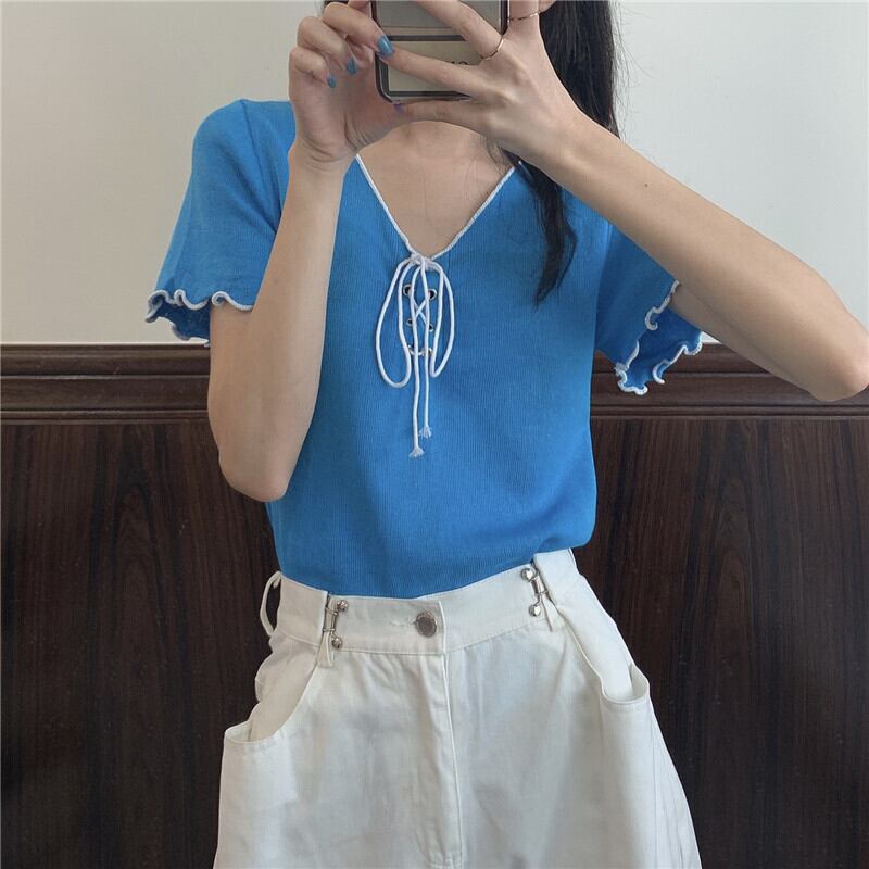 サマーVネックストラップ ニットセーター トップス レッドTシャツ 夏物 1号婦人93624564590