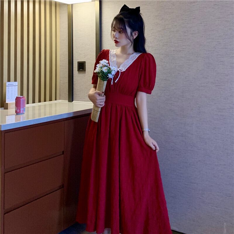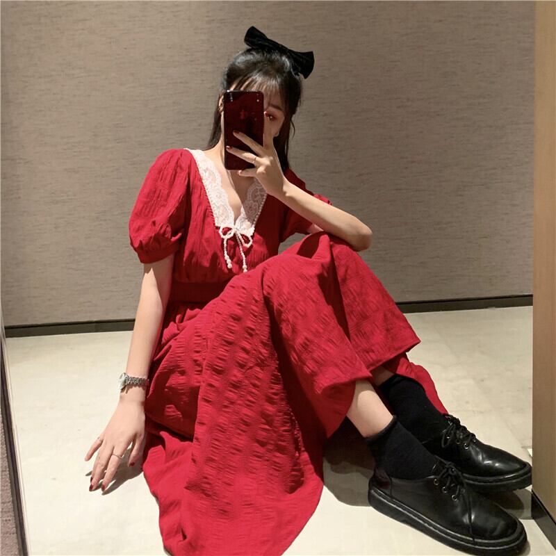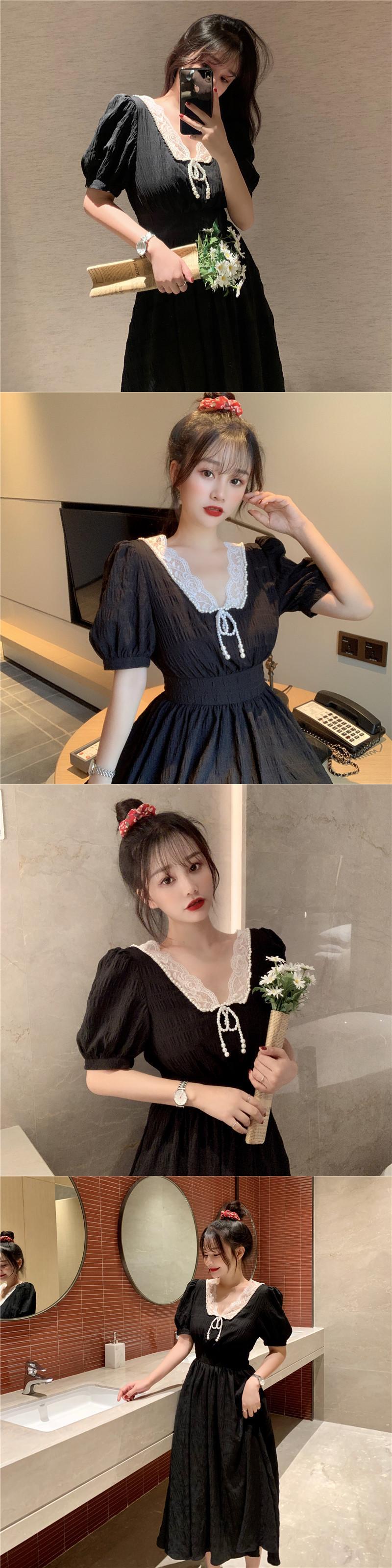 サマースタンダードレースVネックスリーブウェストドレス レトロ 夏物 1号婦人62059542914