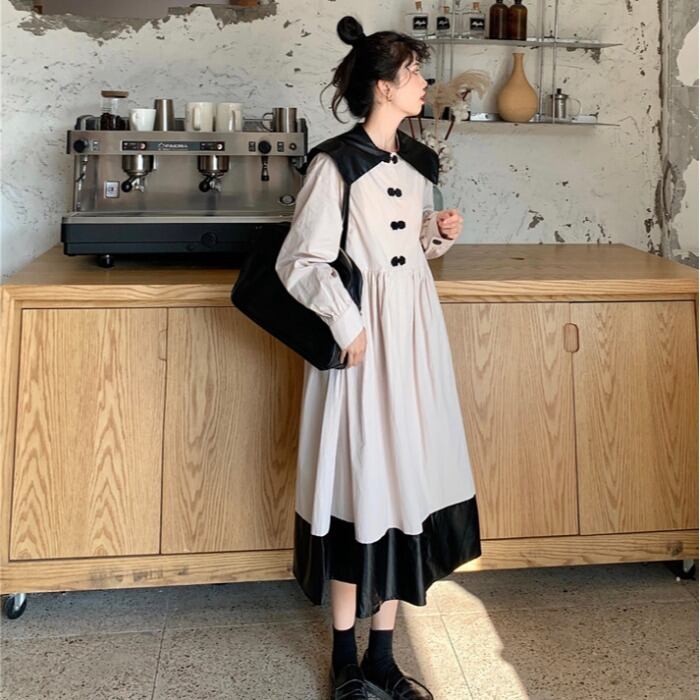 スプリングドレス ブラックホワイトカラーAラインスカート 春物 1号婦人39369802393