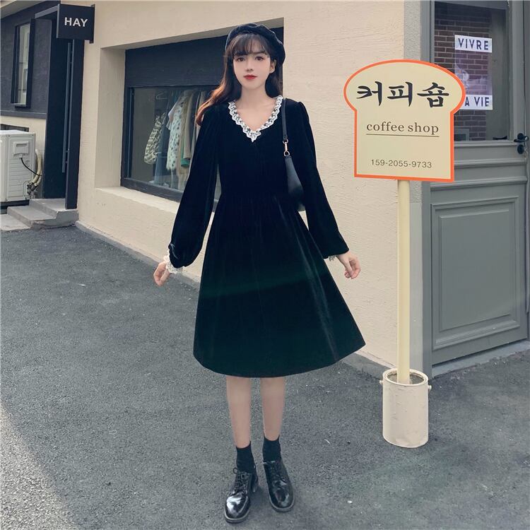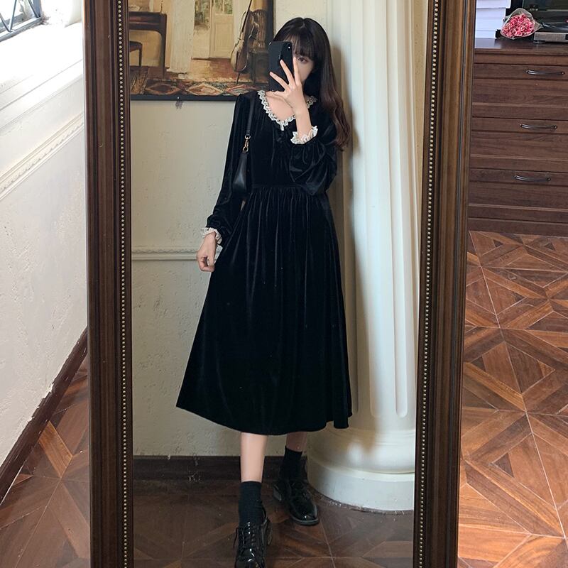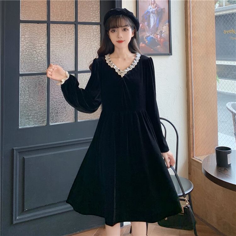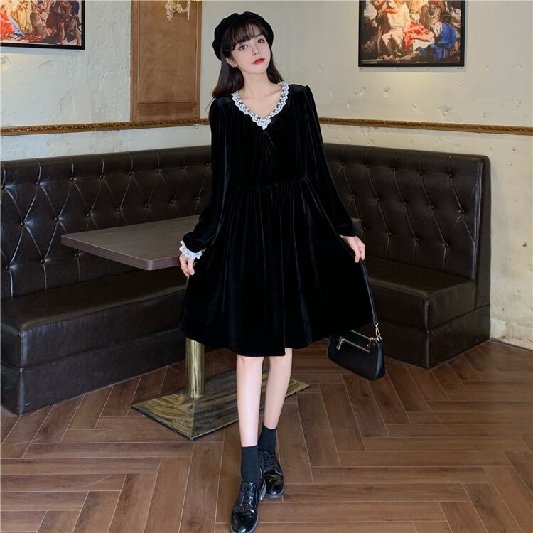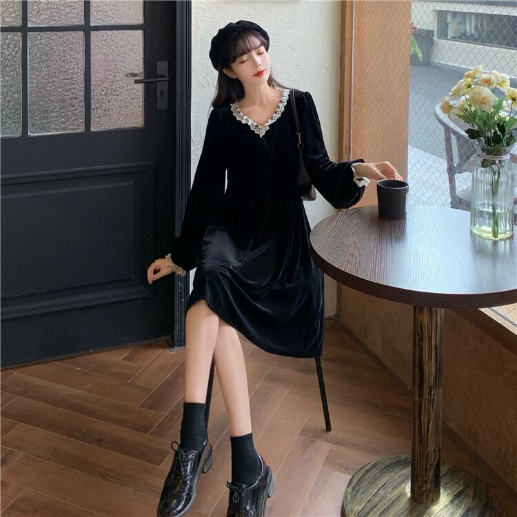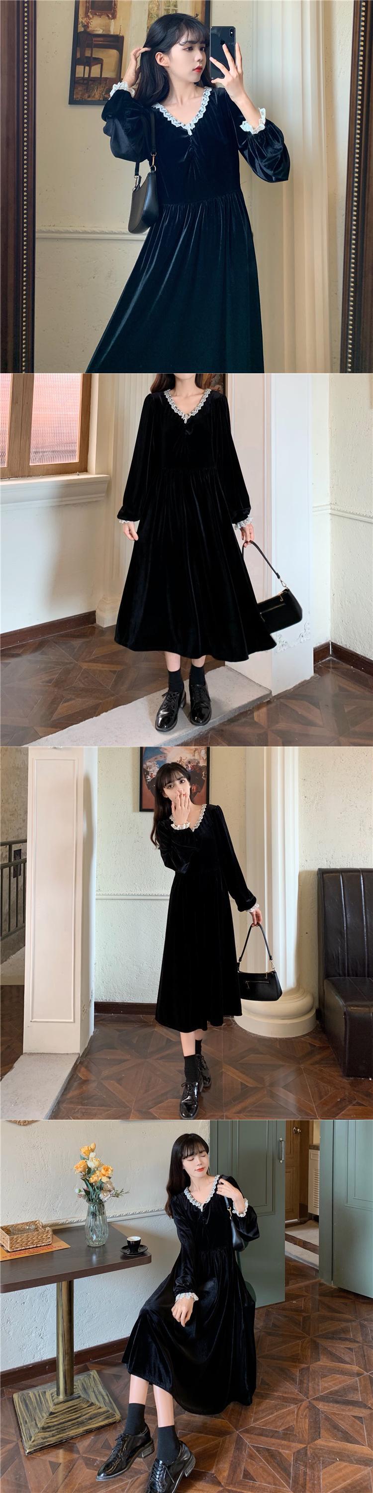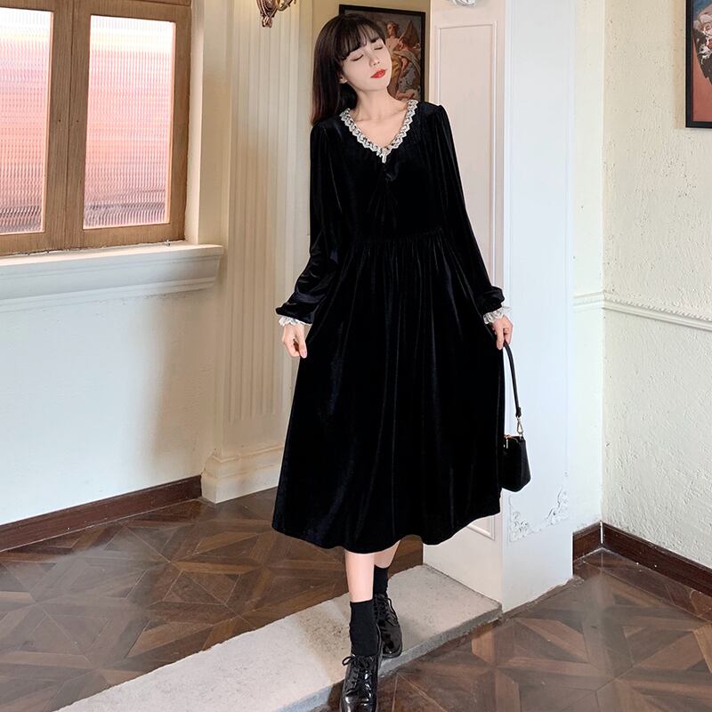 スプリングドレス ベルベットブラックVネックウェストAラインスカート ロング 春物 1号婦人6405542243