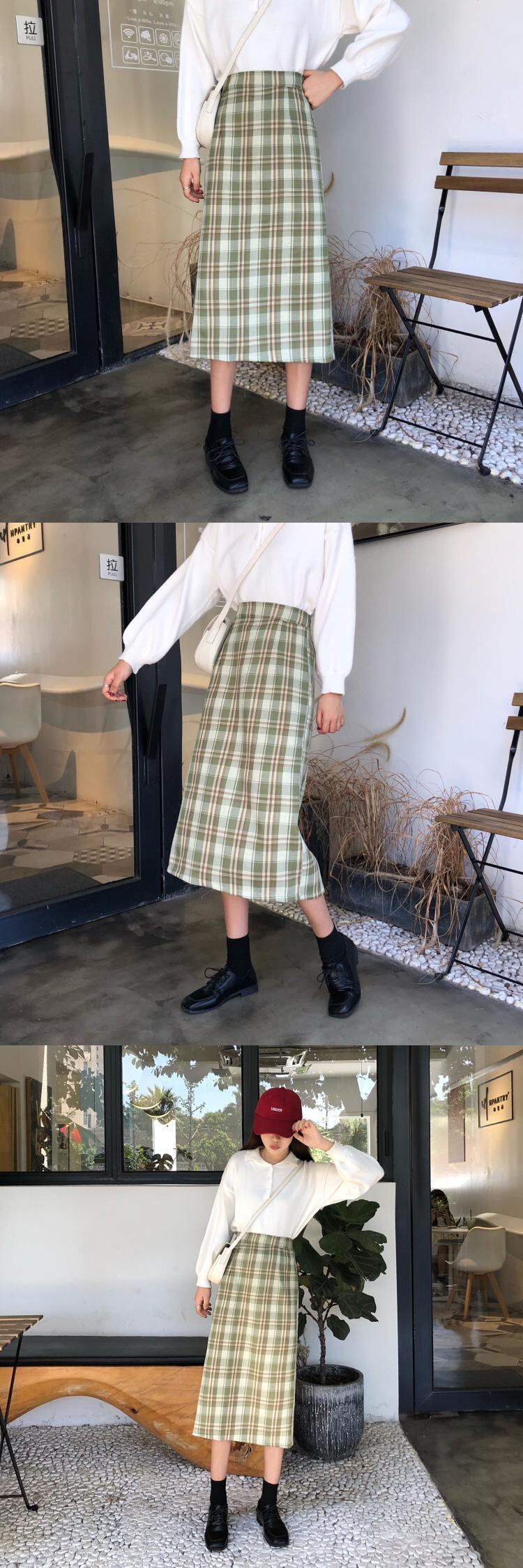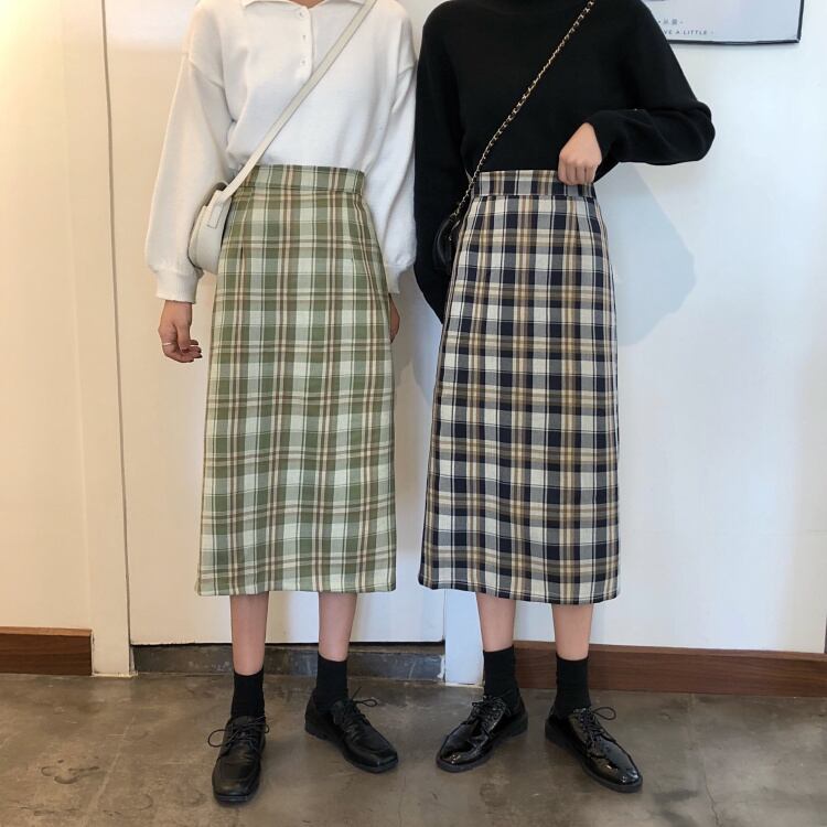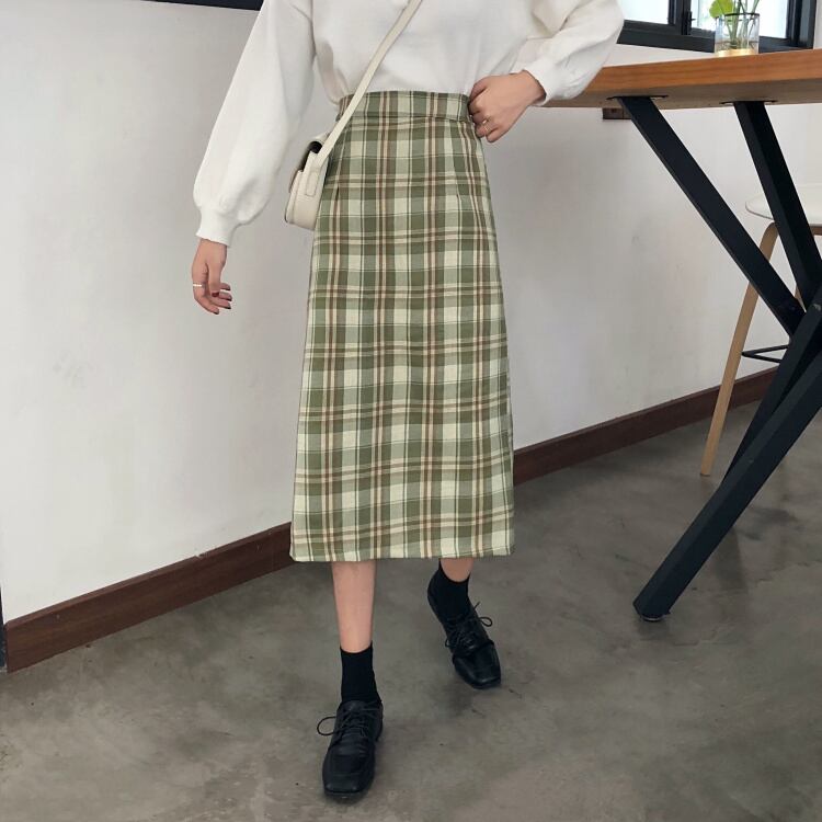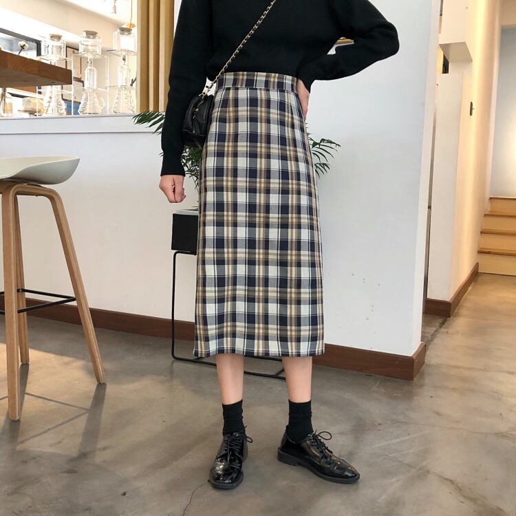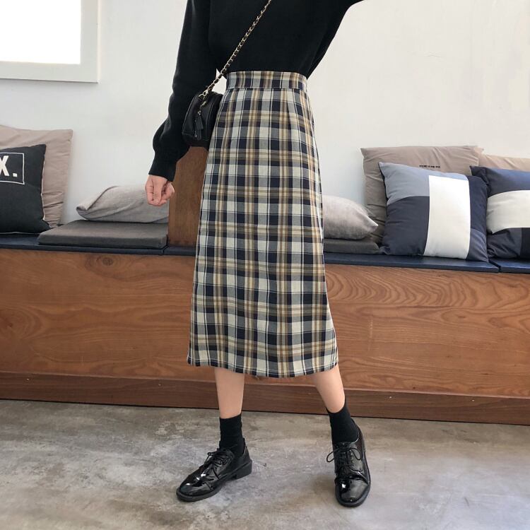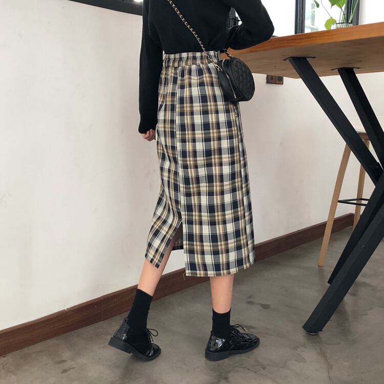 スタンダード格子柄Aラインスカート スプリングオータムハイウェストウェストスリム レトロ 春物 秋物 1号婦人61474658003