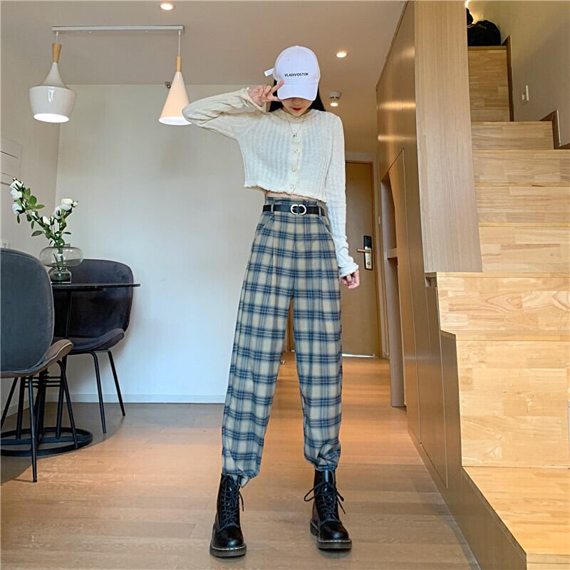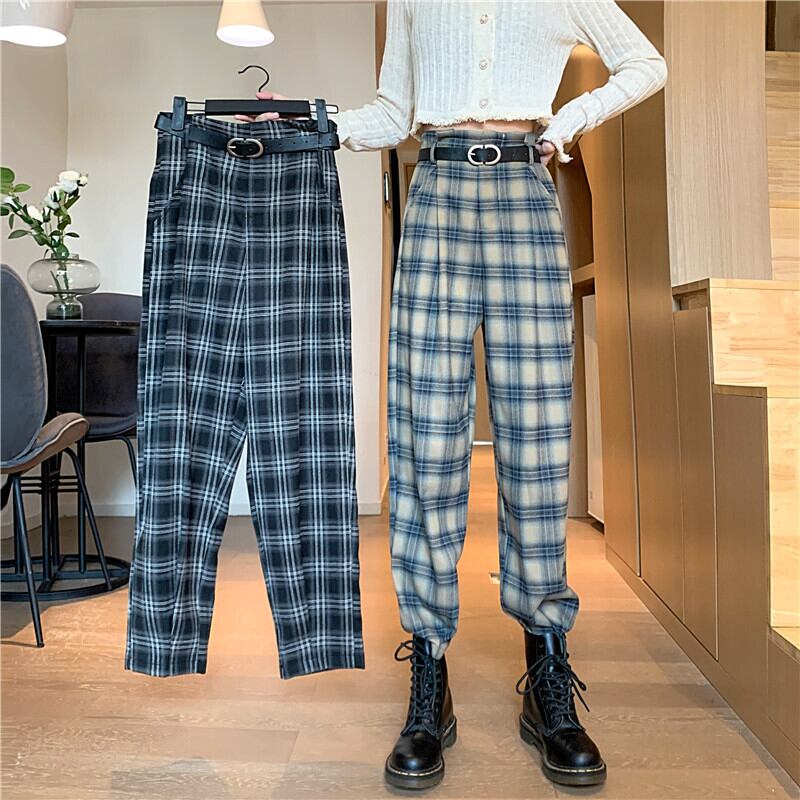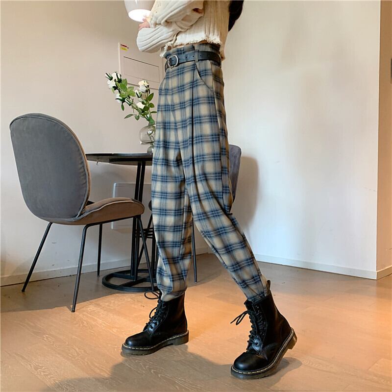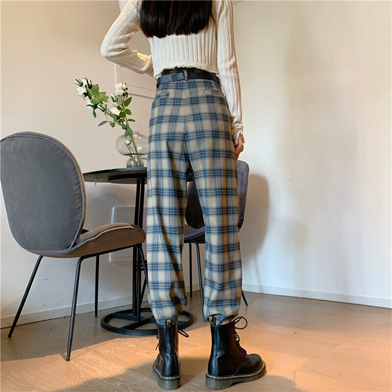 スタンダード格子柄パンツ スプリングオータムハイウェストウェストスリムカジュアル レトロ 春物 秋物 1号婦人13514415352
