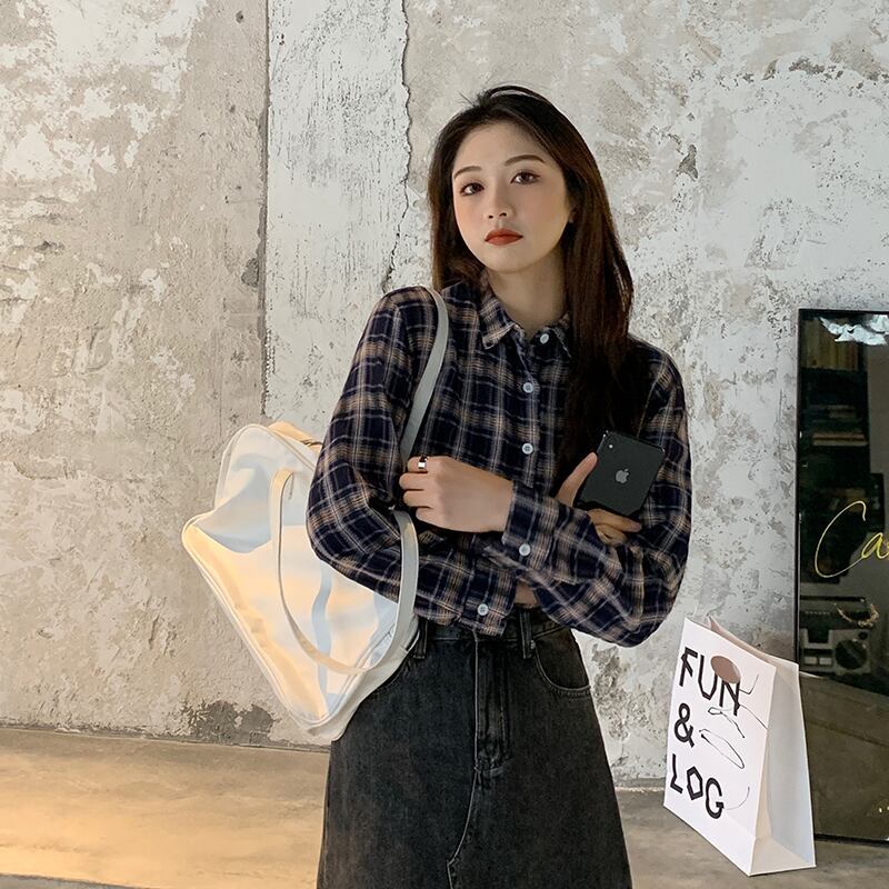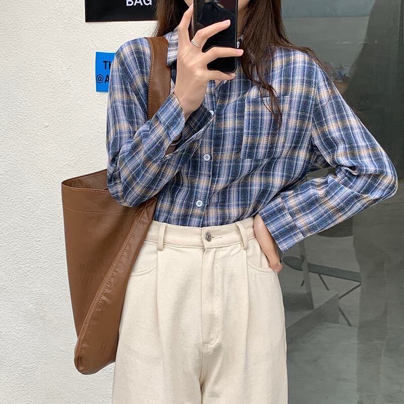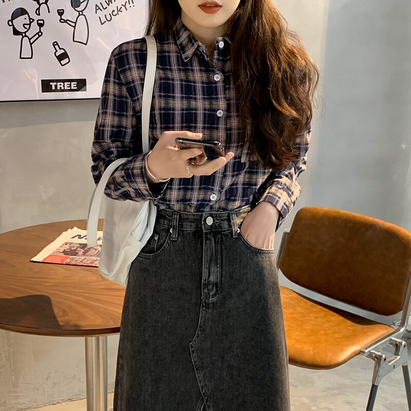 シャツ スプリングスタンダード格子柄ルーズトップス ロング レトロ 春物 1号婦人53064416714