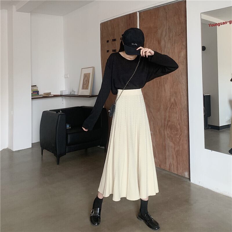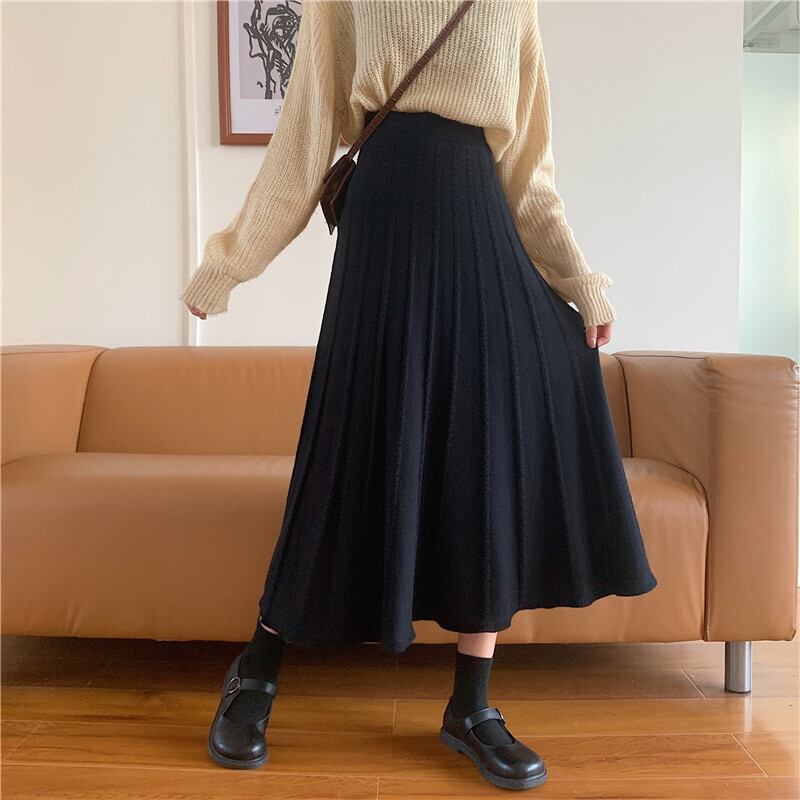 ニットスカート スプリングオータムハイウェスト薄手Aラインプリーツ 春物 秋物 1号婦人8928998190