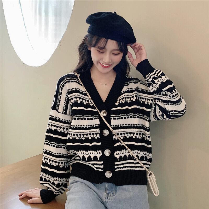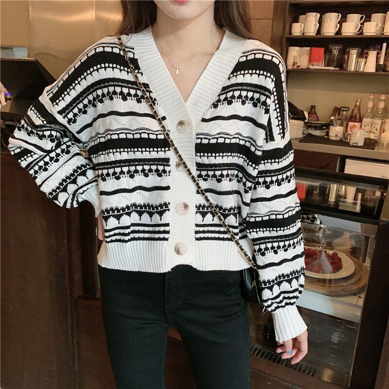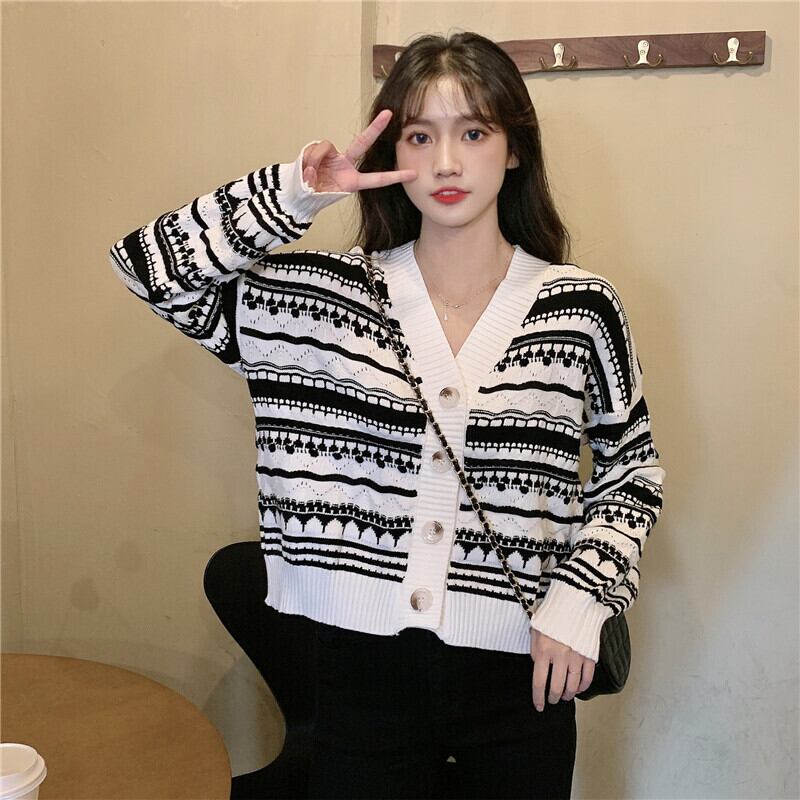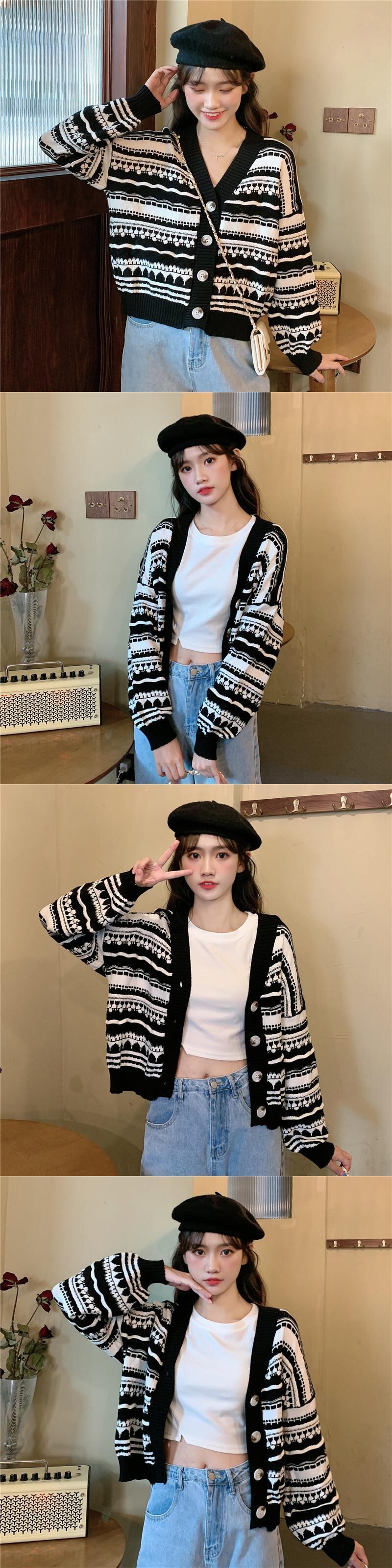 スプリングオータムストライプセーター ショートスタイルルーズニットカーディガン 春物 秋物 1号婦人34305626456