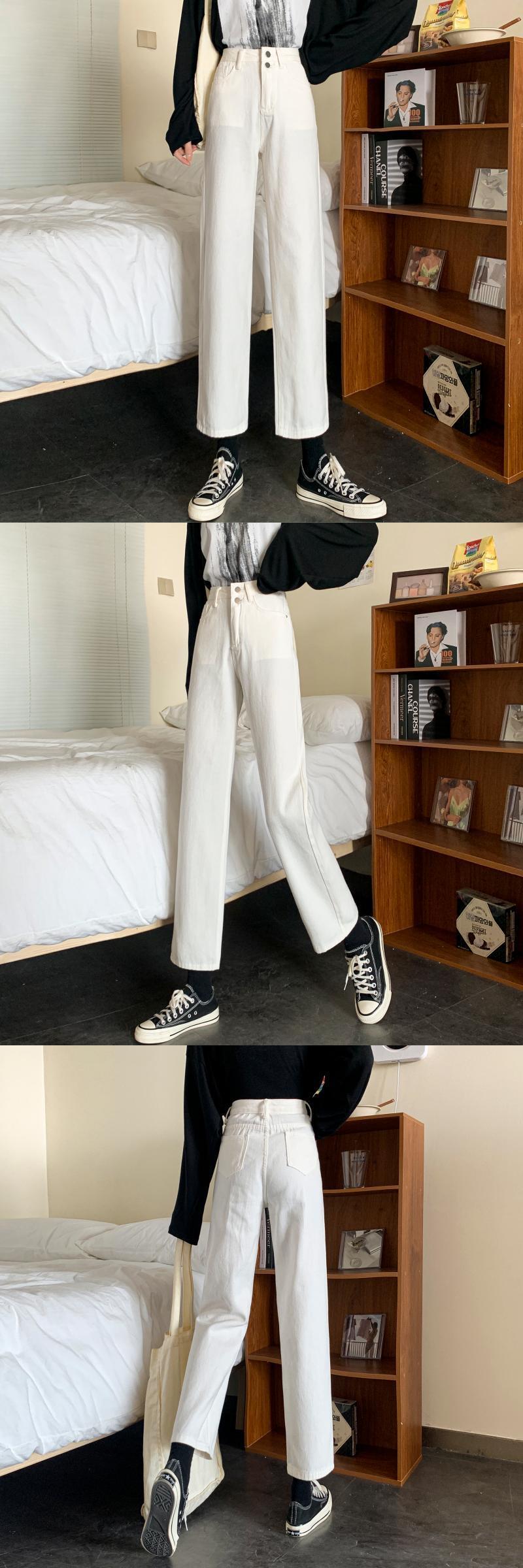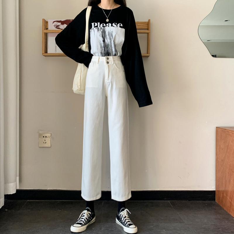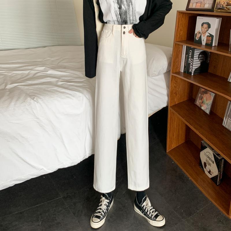 ジーンズ オータムウィンターハイウェストウェストスリムルーズパンツ ホワイト 秋物 冬物 1号婦人23551199056