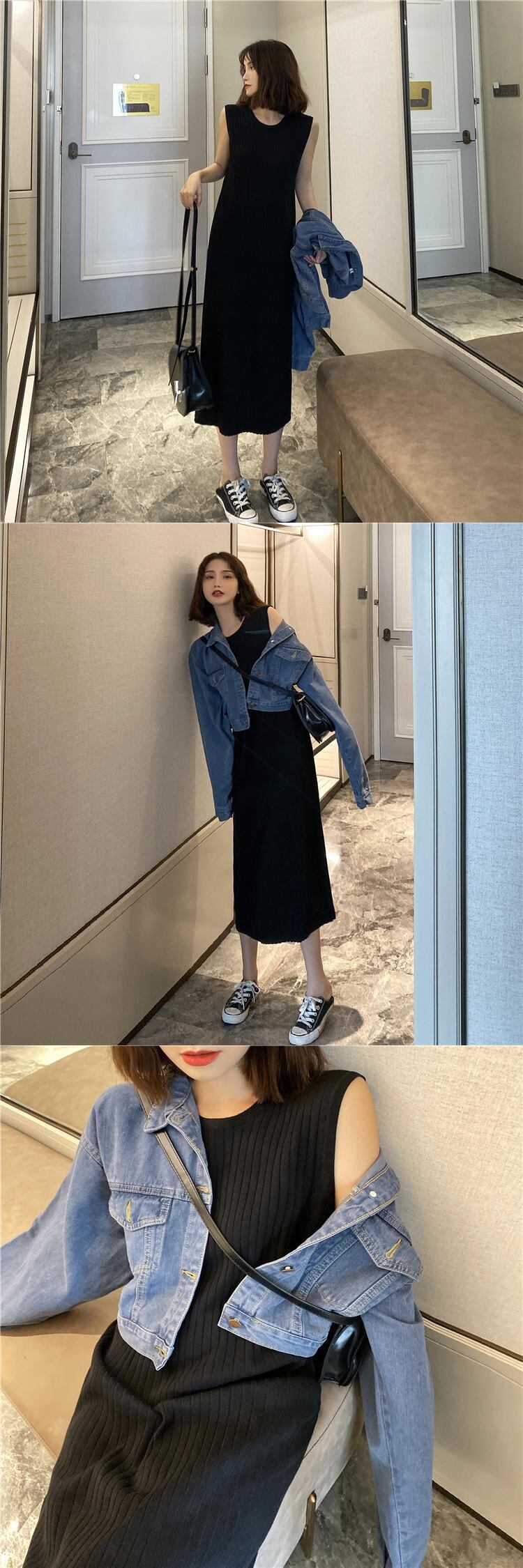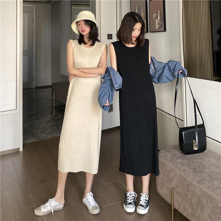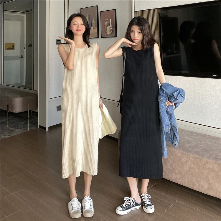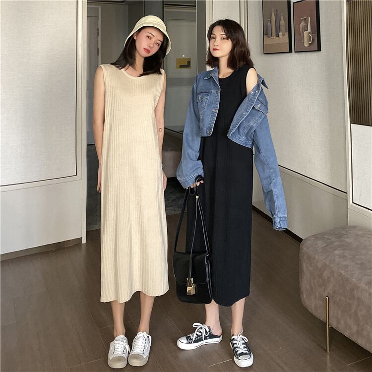 スプリングノースリーブドレス ルーズAラインスカート ニットブラック 春物 1号婦人79290230117