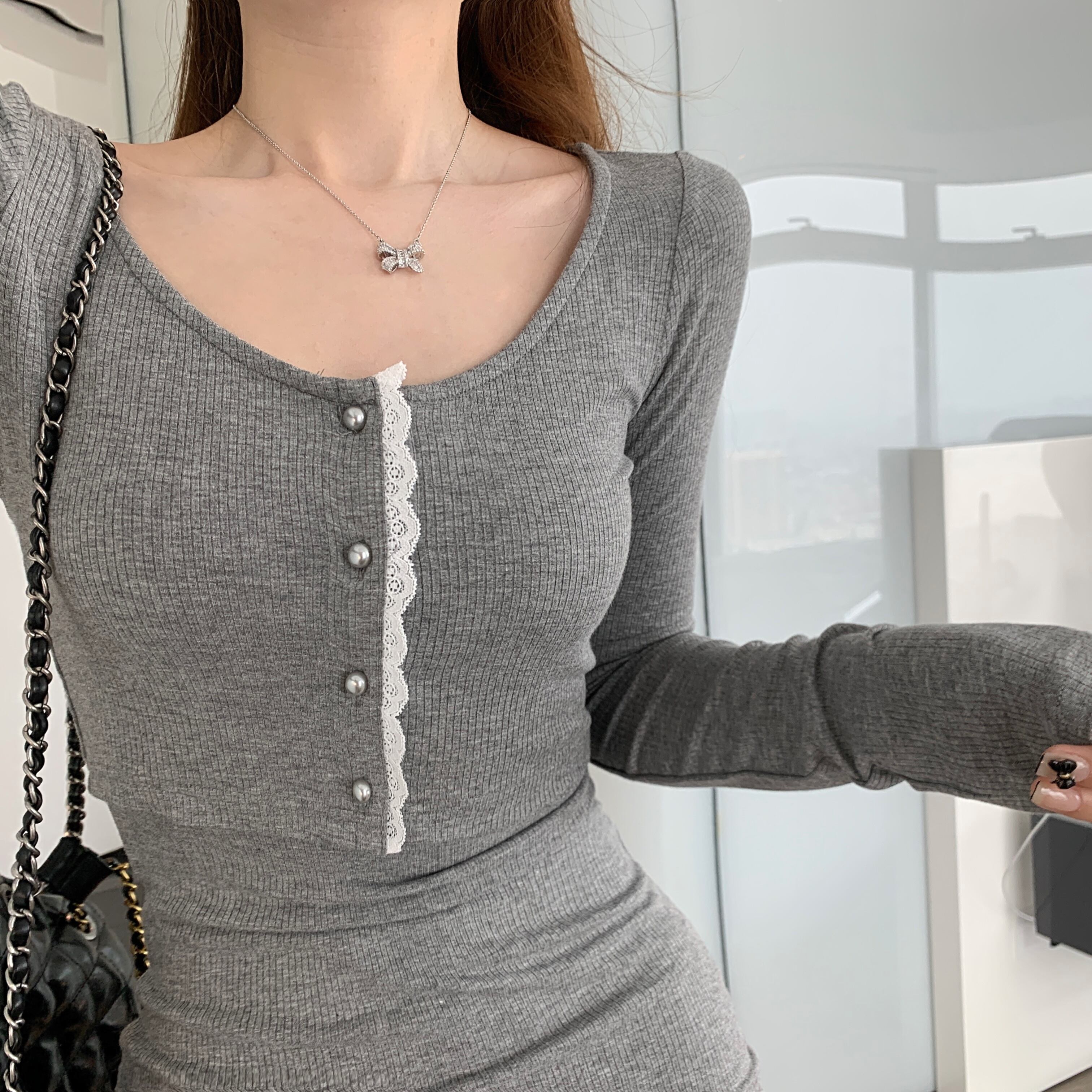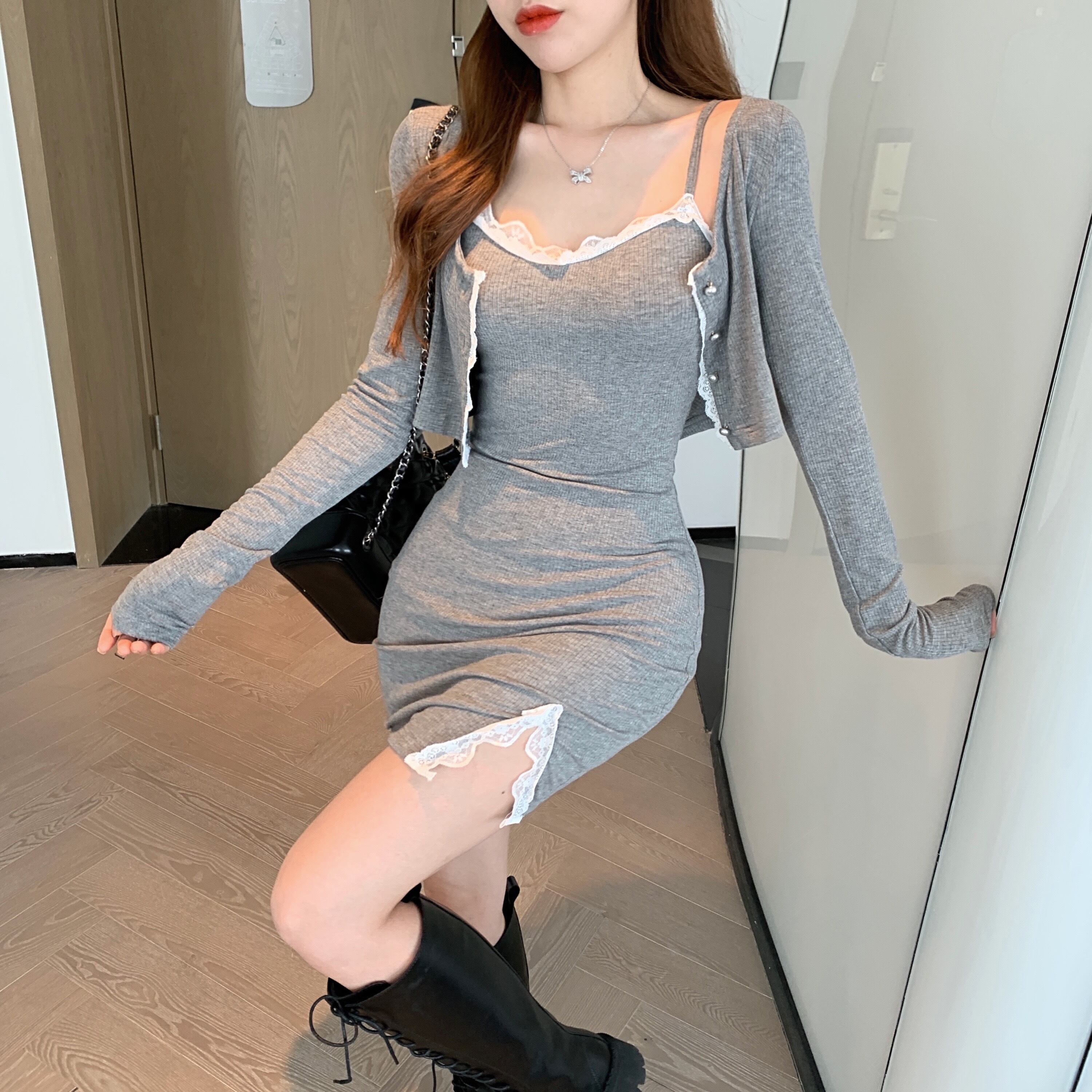 色:グレーレースカーディガンジャケット,グレーのレーストリムスカート,ブラックレーストリムスカート,ブラックレースカーディガンジャケット