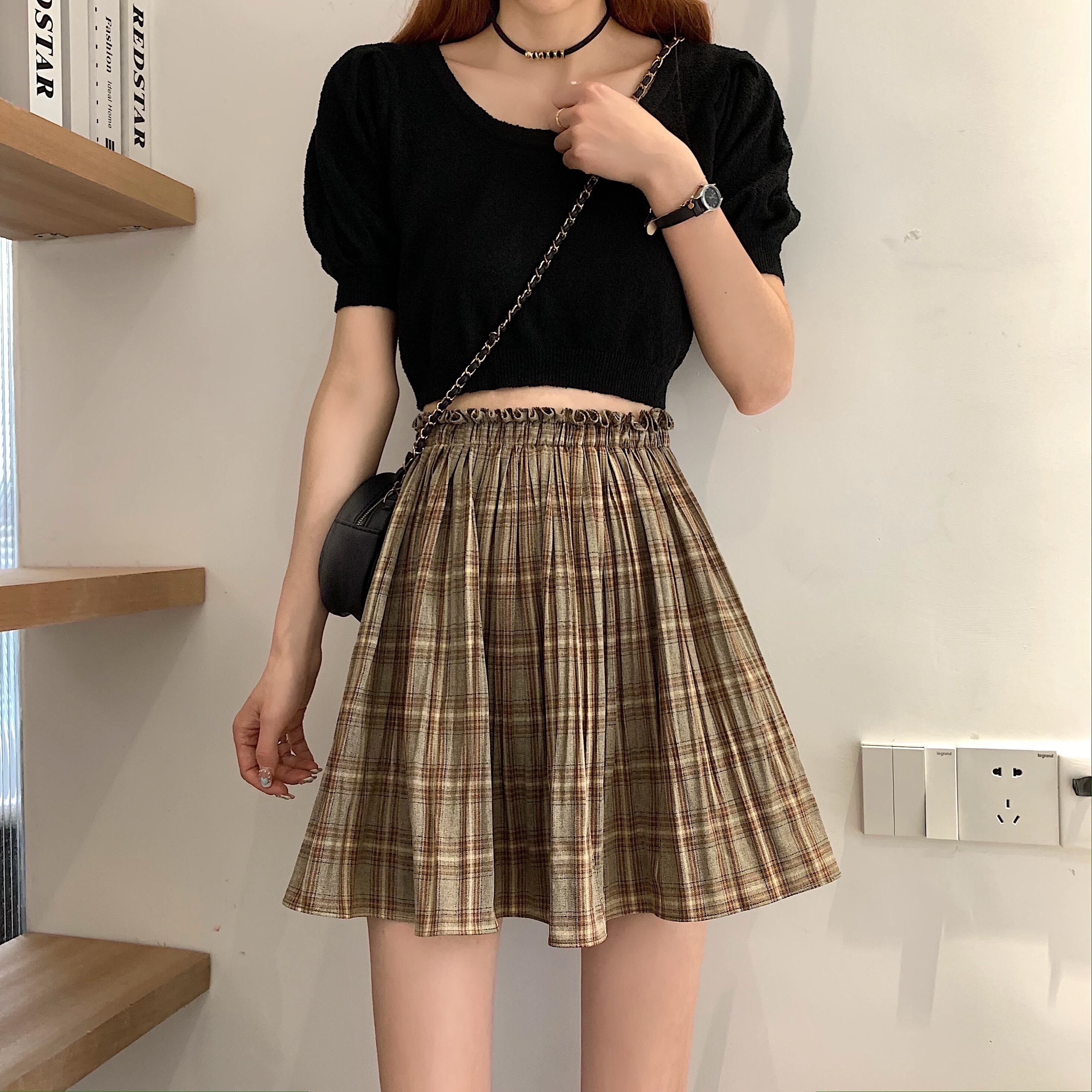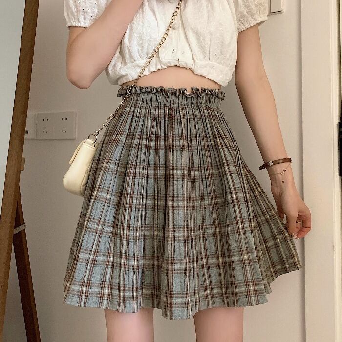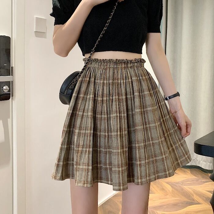 スプリングスカート Aライン薄手格子柄ストレッチウェストショート エラスティック 伸縮 春物 1号婦人34191001515