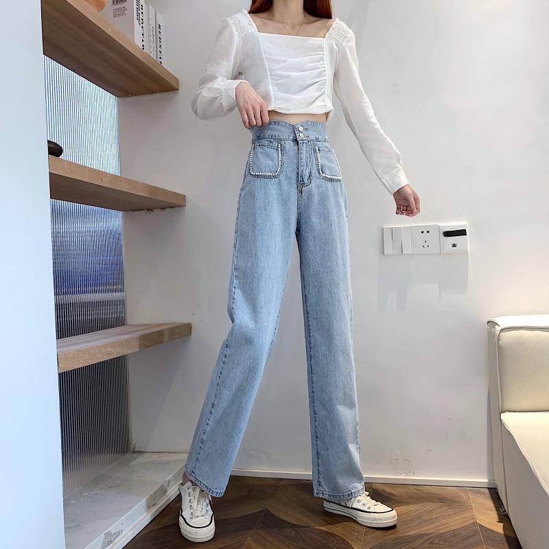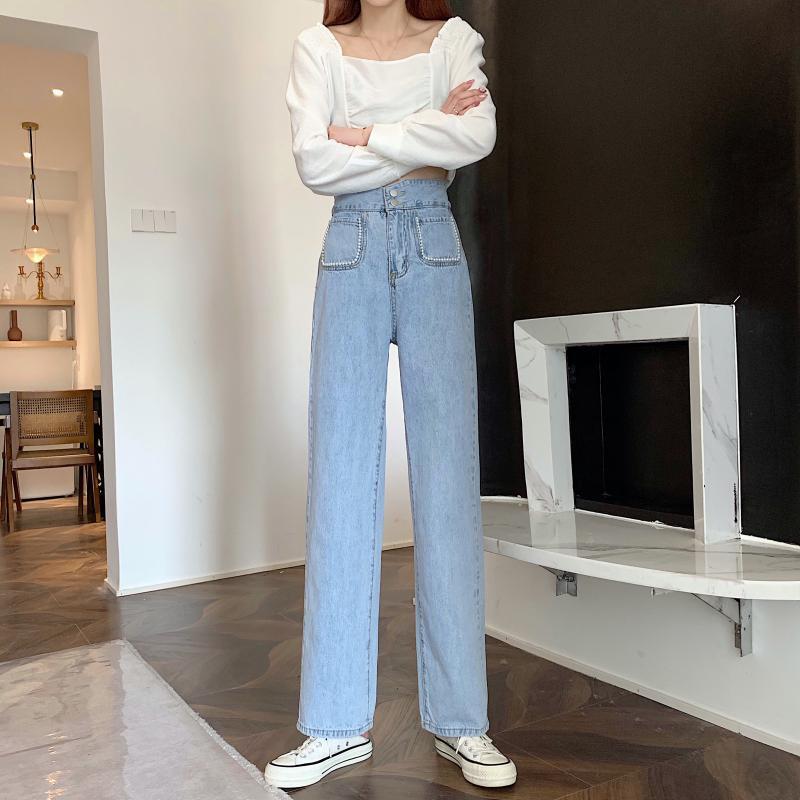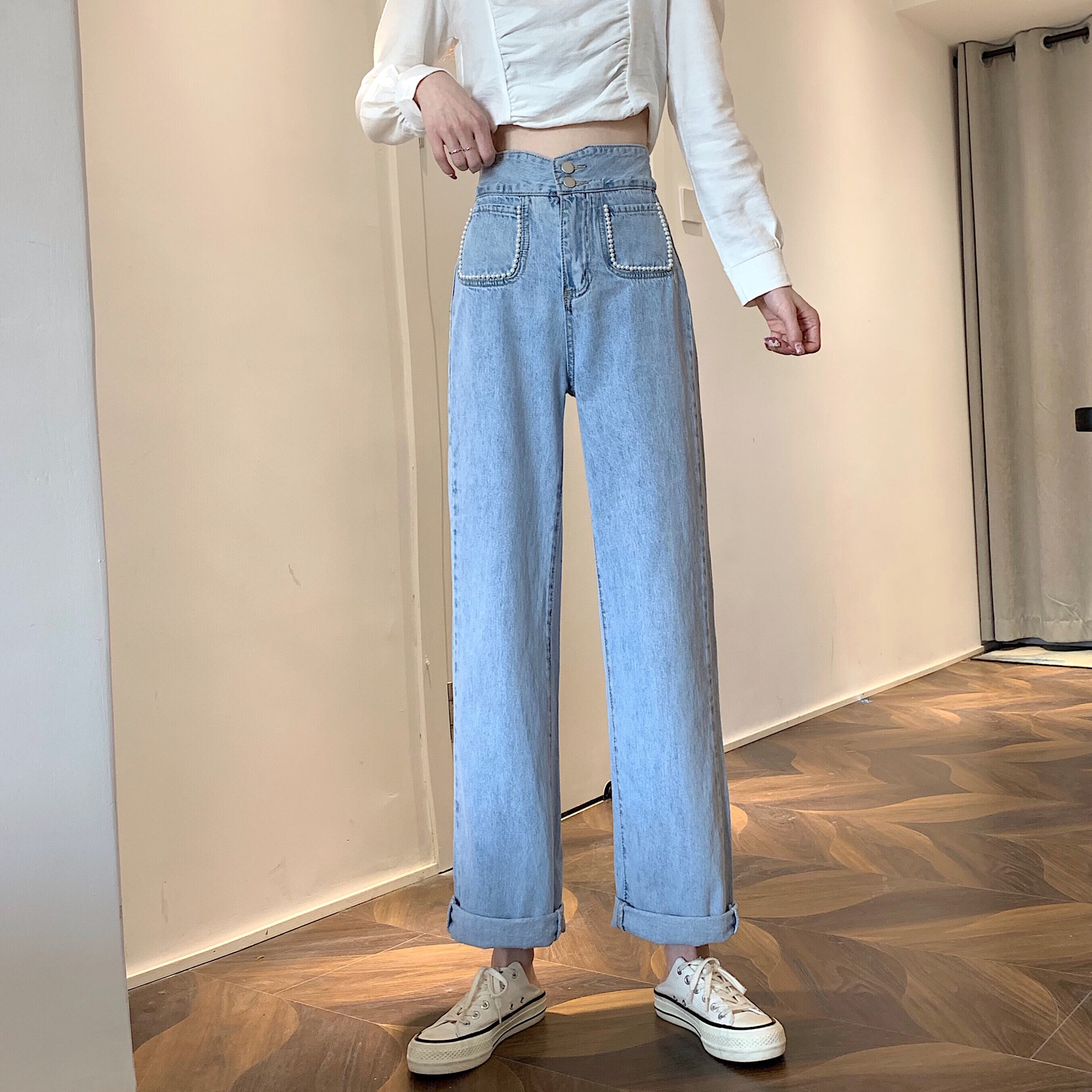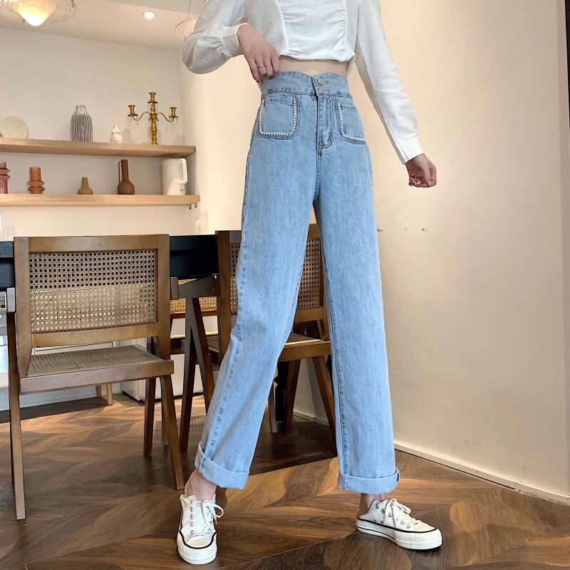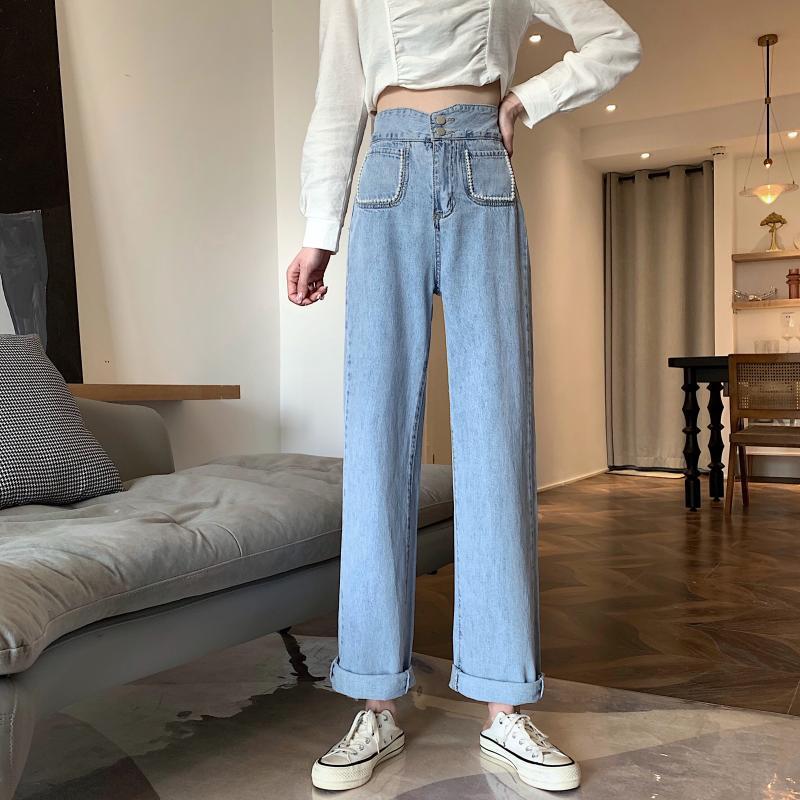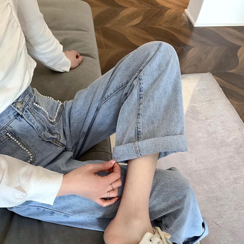 スプリングオータムジーンズ ルーズハイウェストロングパンツ 春物 秋物 1号婦人36657137972