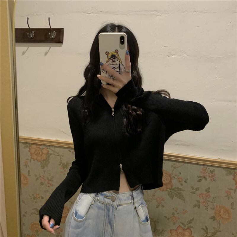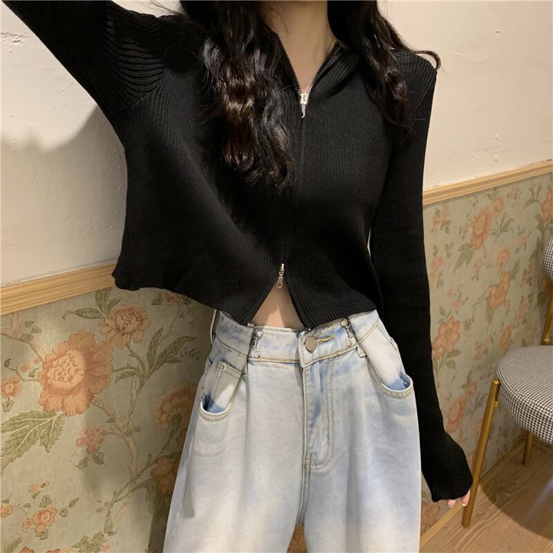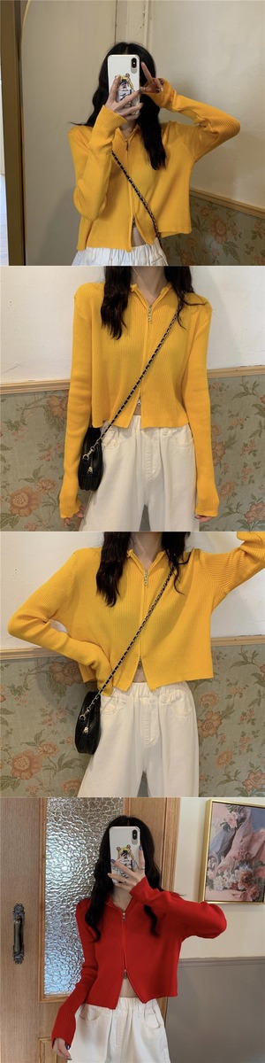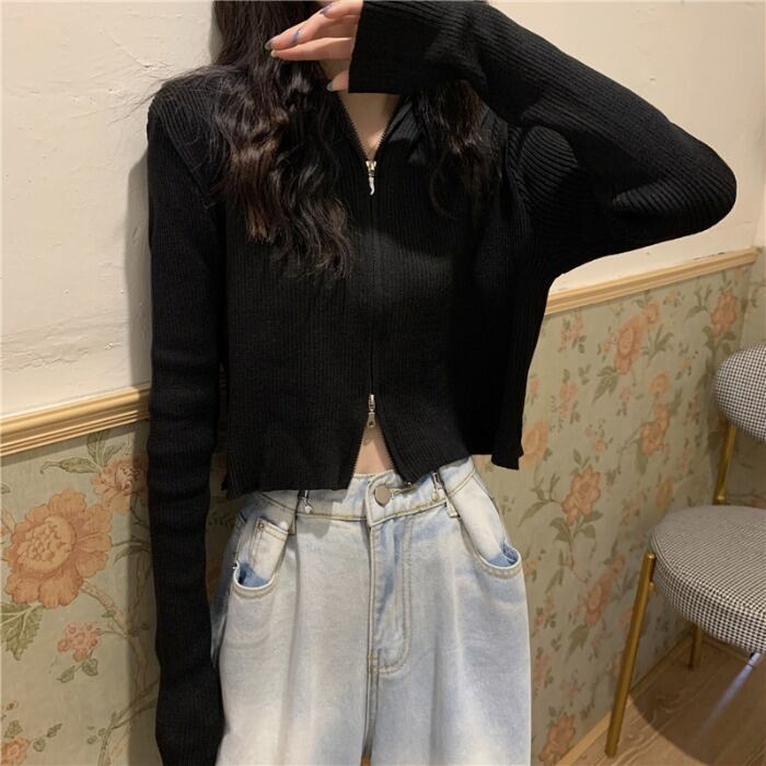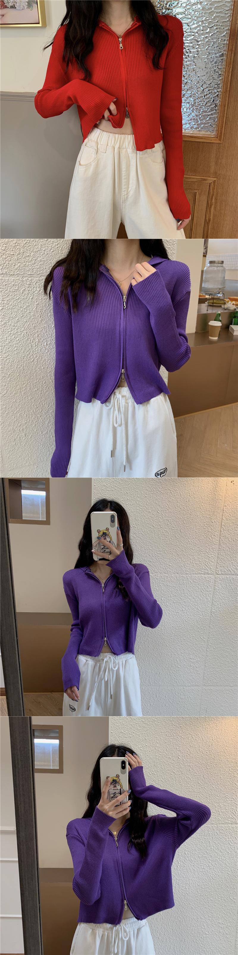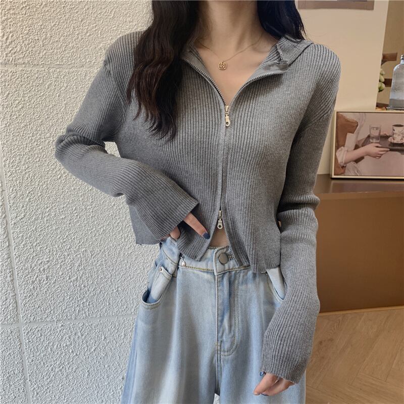 ダブルジッパーフードショートグレーニットカーディガンスプリングオータムジャケット ロング 春物 秋物 1号婦人28174905939