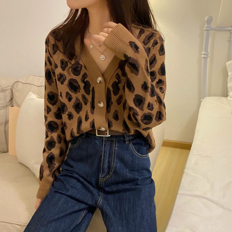 Vネックカーディガンスプリングオータムスタイルシャツ レオパードプリント柄セーター トップス ロング 春物 秋物 1号婦人80983358718