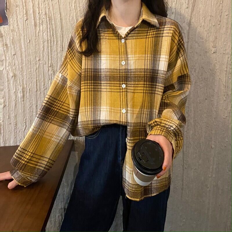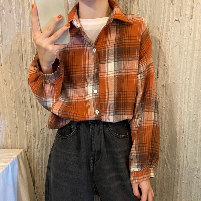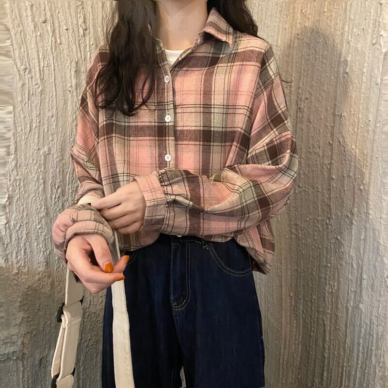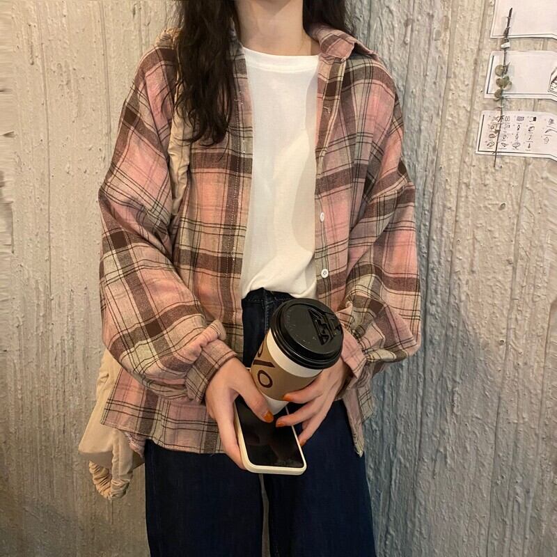 ルーズ薄手格子柄シャツ ジャケット スプリングオータムブラウス ロング 春物 秋物 1号婦人14033689594