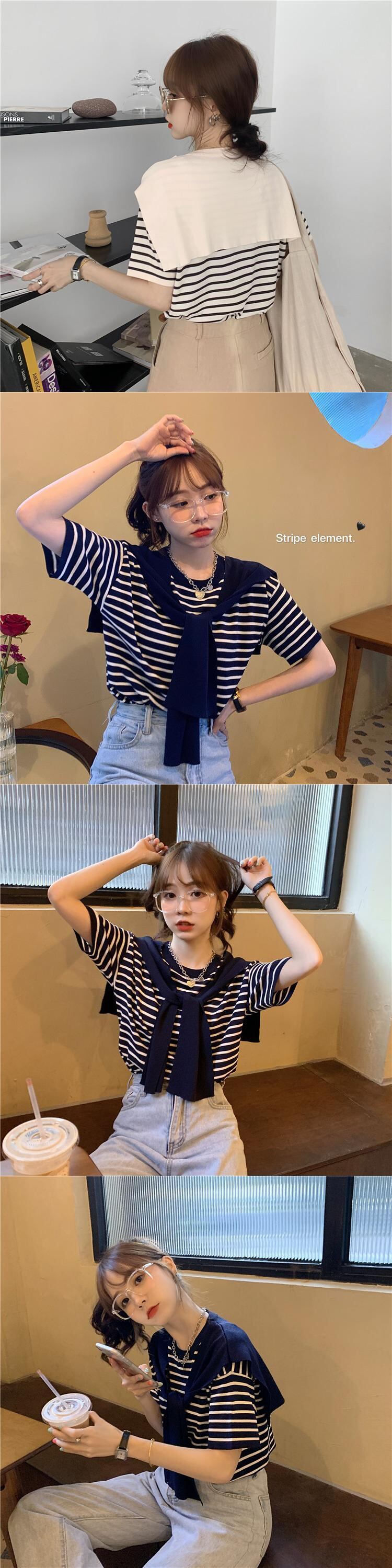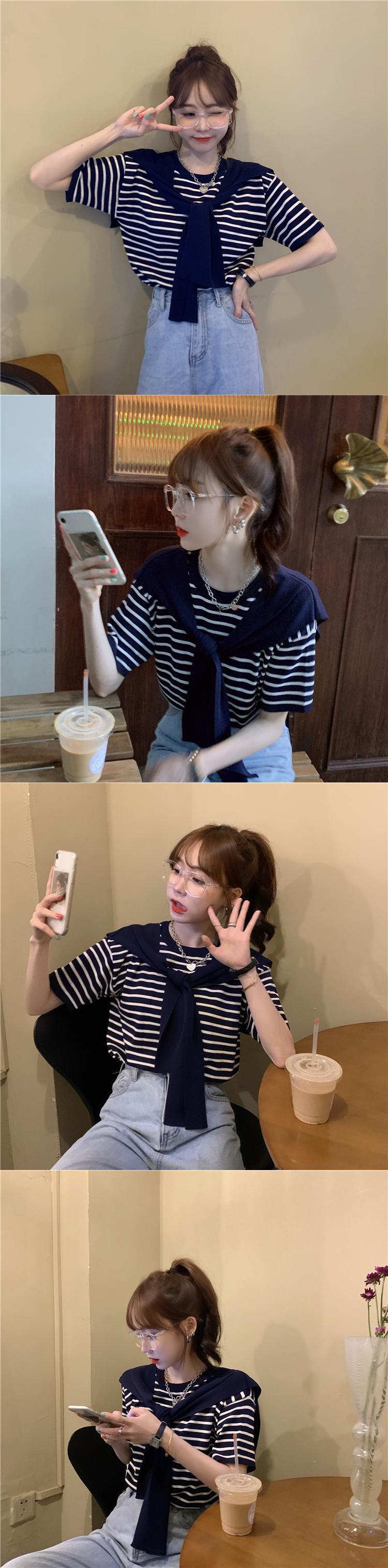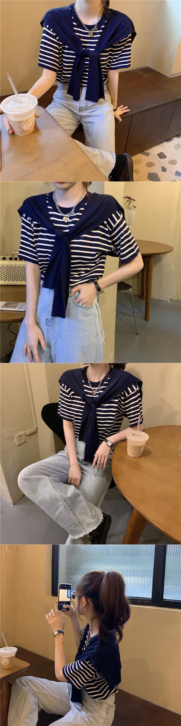 スタンダードストライプニットTシャツ スプリング薄手スタイルルーズ レトロ 春物 1号婦人79299725010