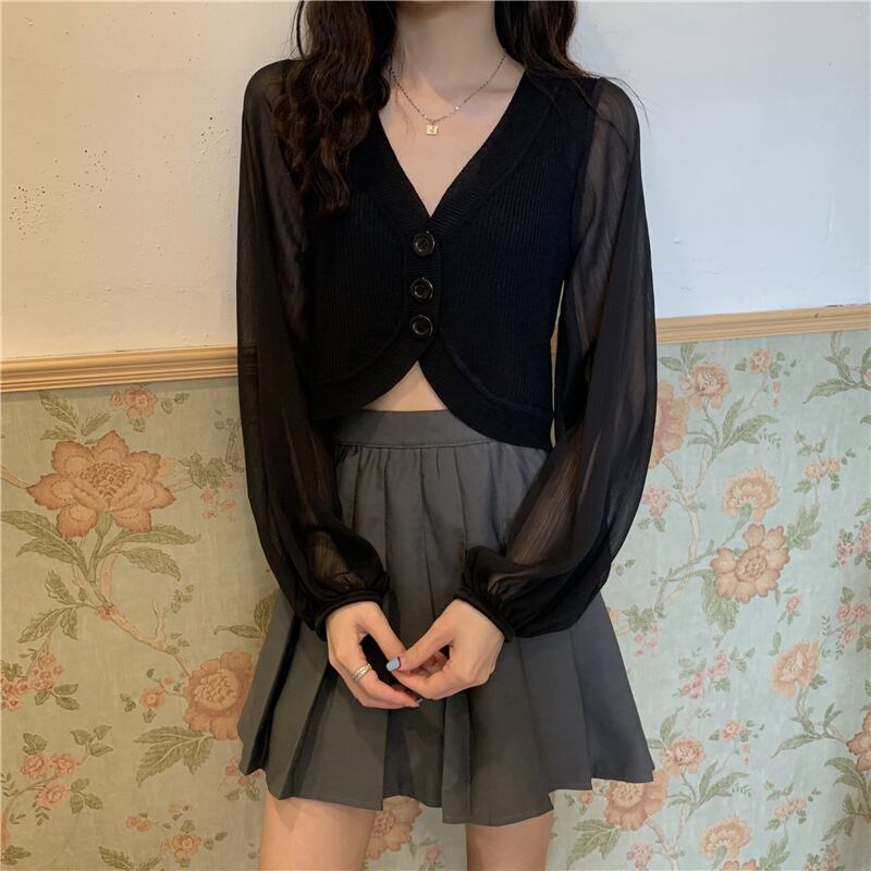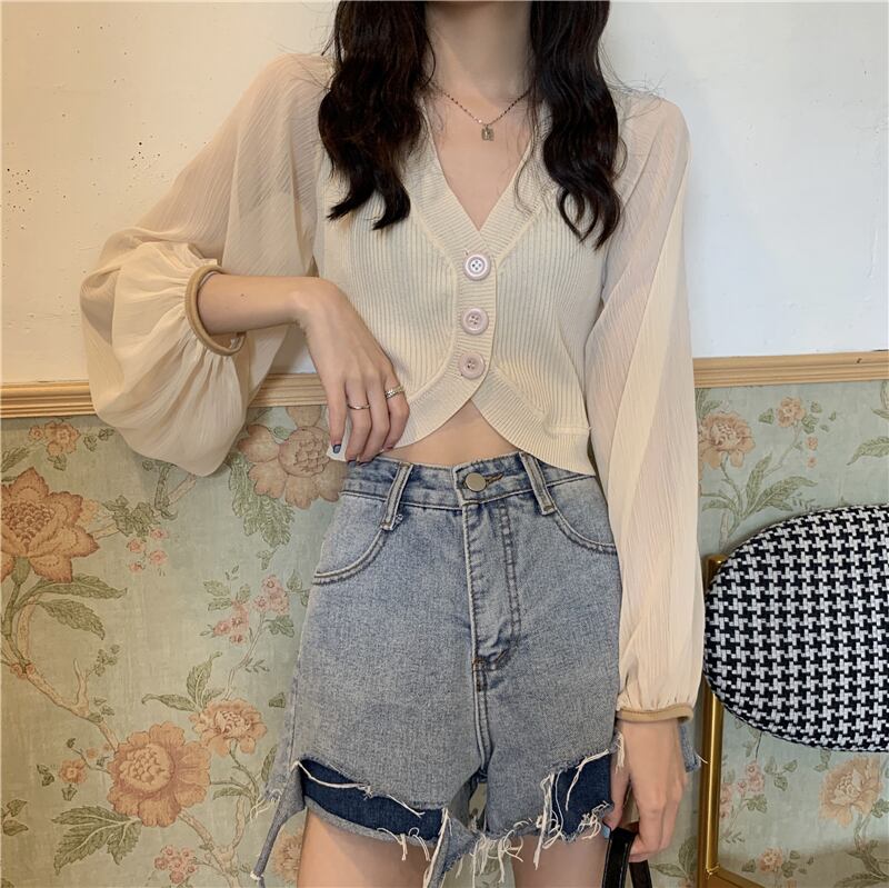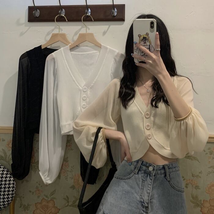 シフォンVネックカーディガンセーター スプリングサマーショートカジュアルシャツ ロング 春物 夏物 ステッチ 1号婦人92791743068