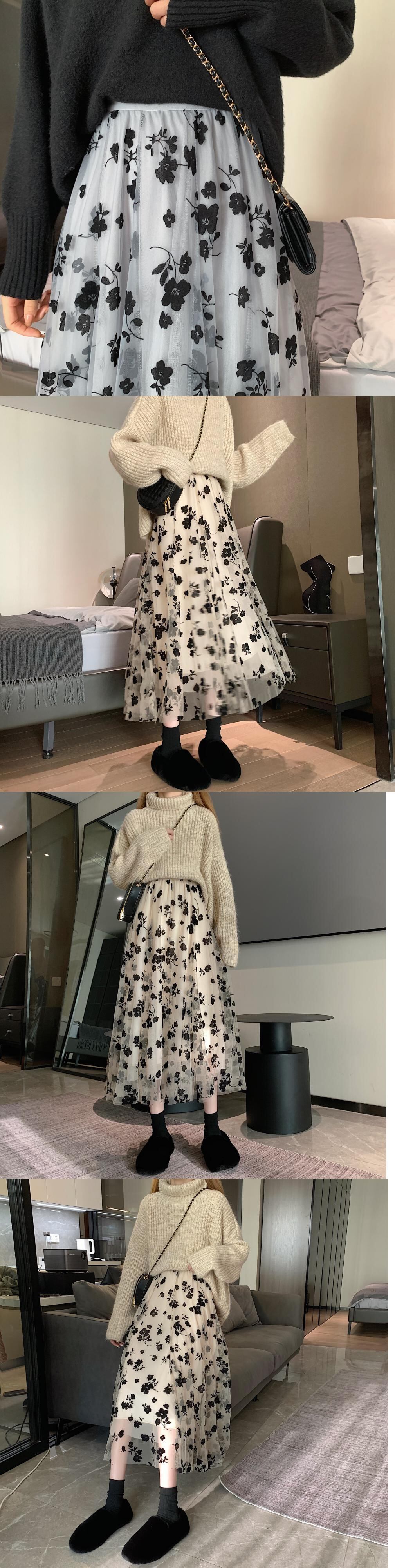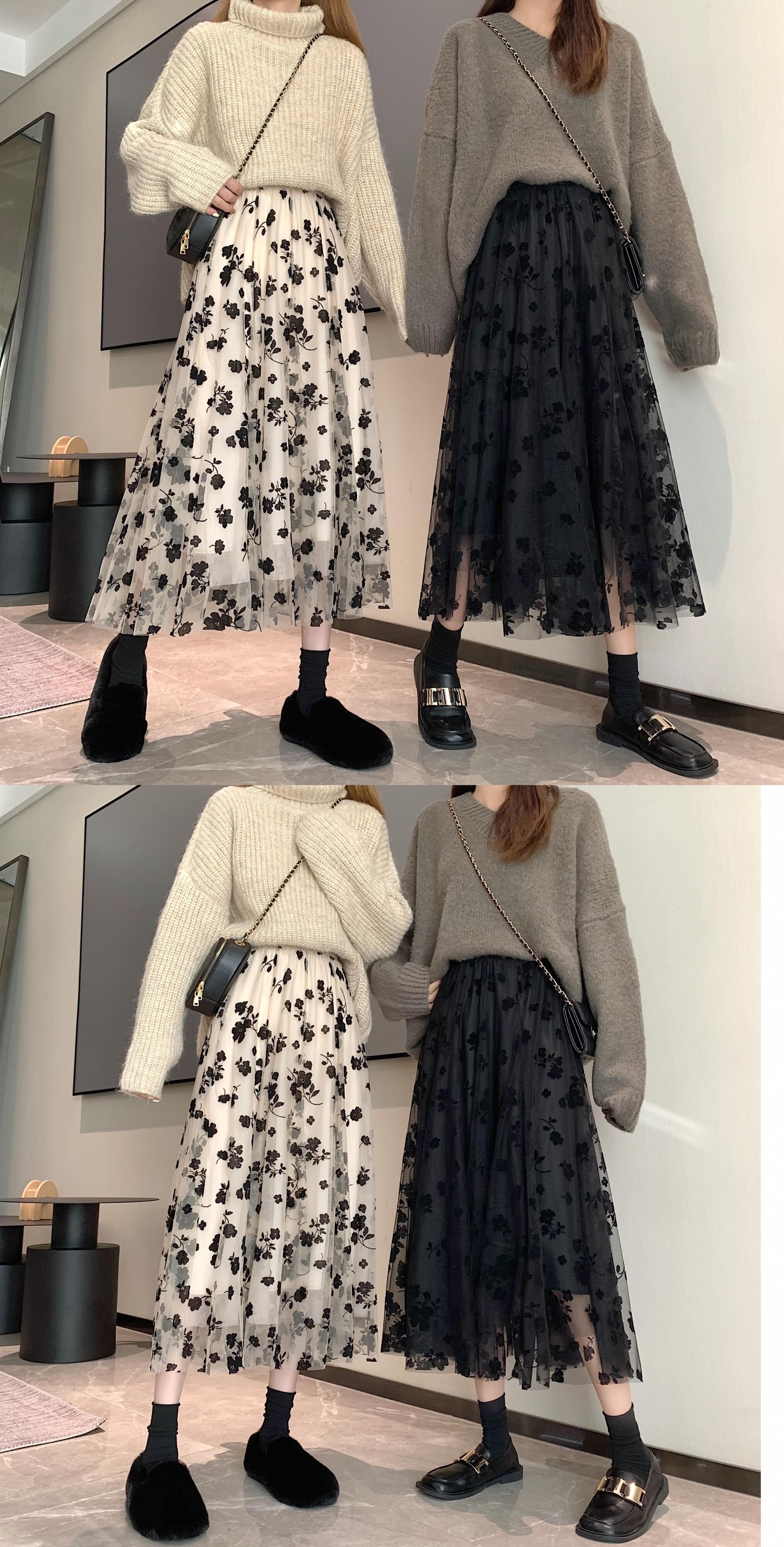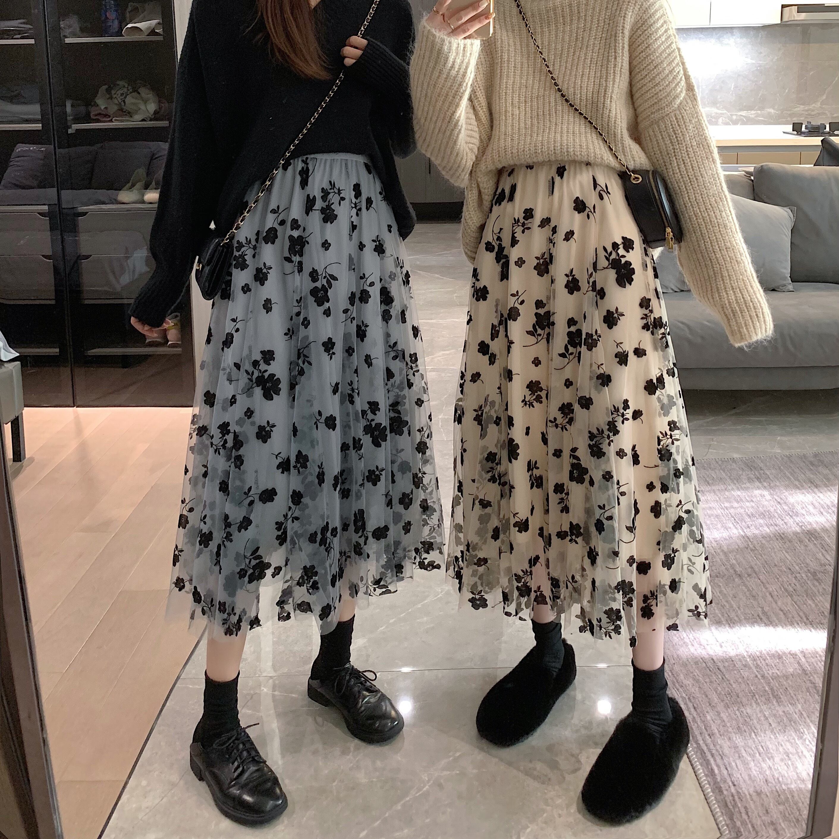 メッシュフローラルスカート ウィンターセーター レディースハイウェストウェストAライン 冬物 花柄 1号婦人57029076899