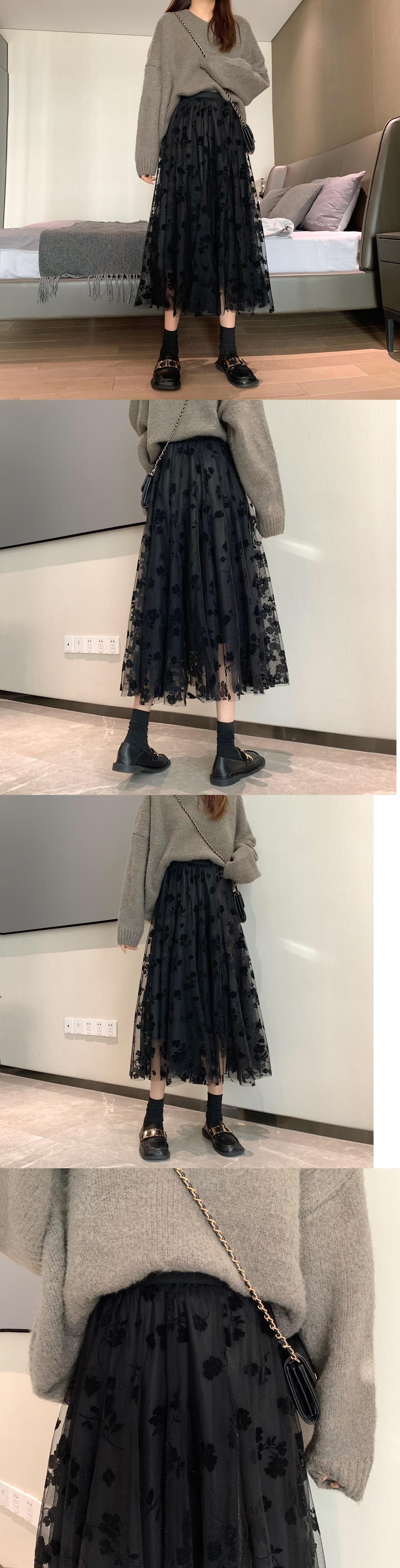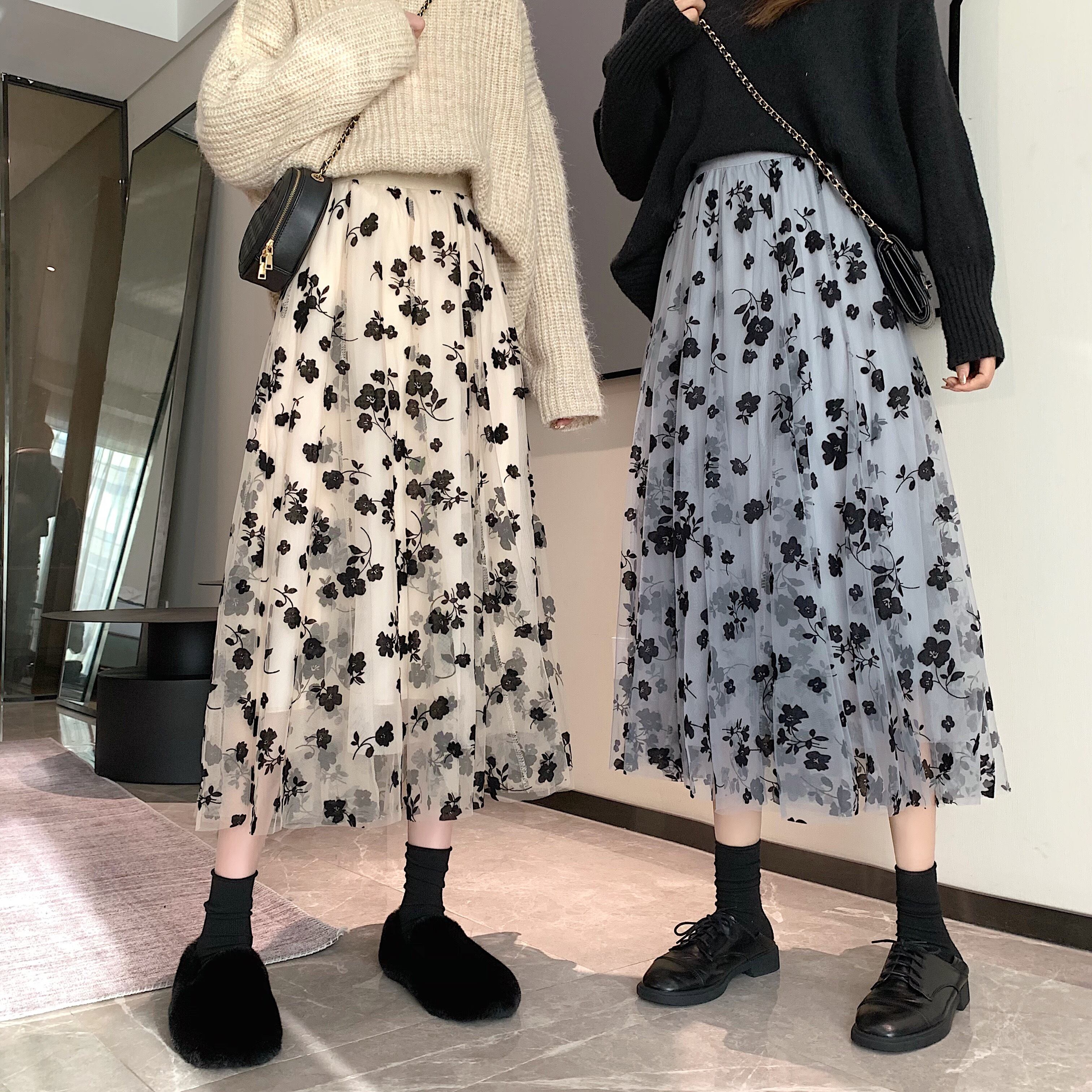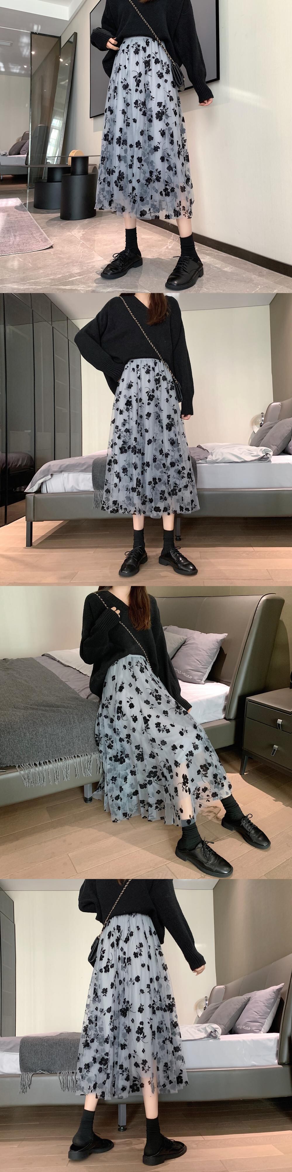 メッシュフローラルスカート ウィンターセーター レディースハイウェストウェストAライン 冬物 花柄 1号婦人57029076899