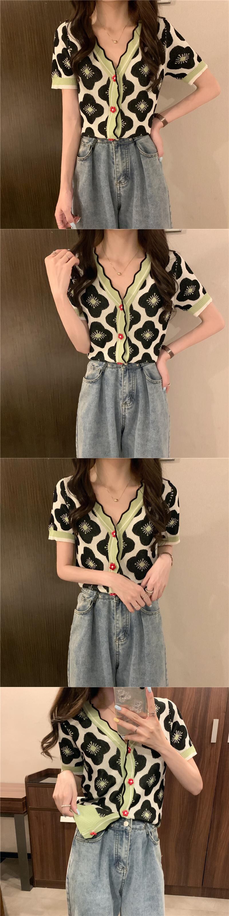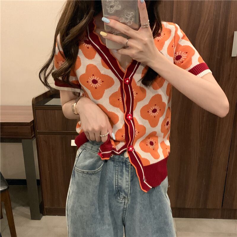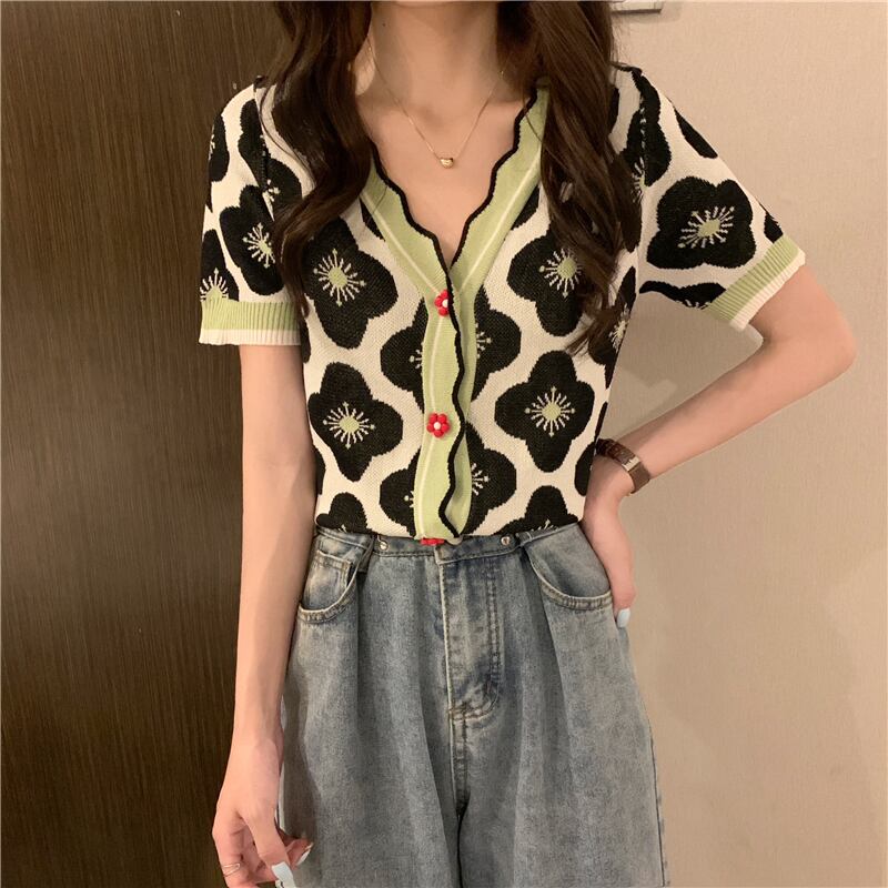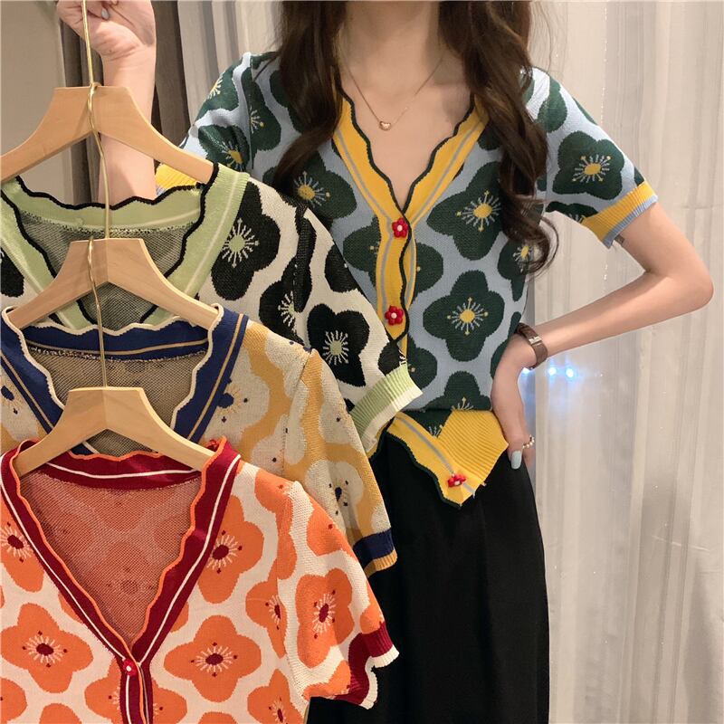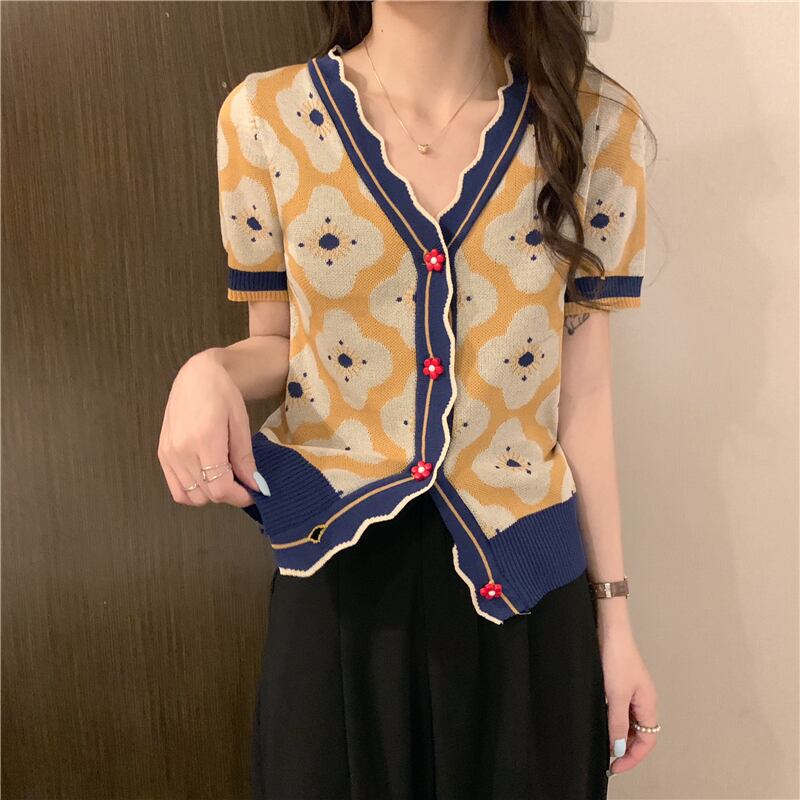 ニットセーター サマー薄手スタンダードカラーFlowerデザイン カーディガンルーズトップス レトロ 夏物 フラワーデザイン 1号婦人71353898927