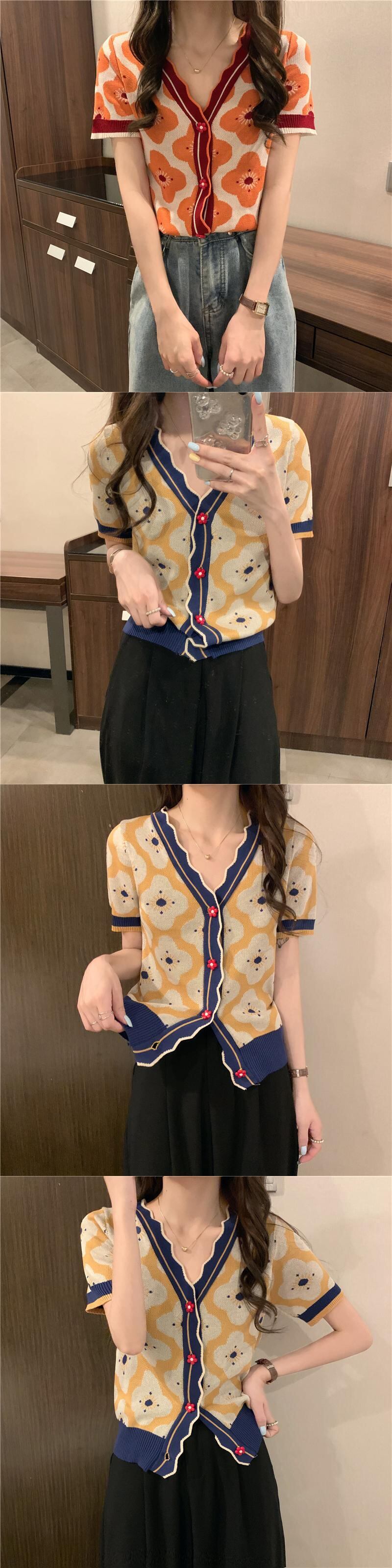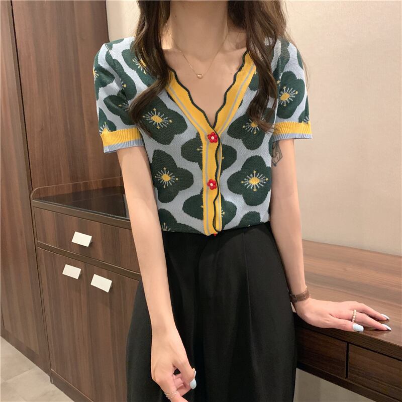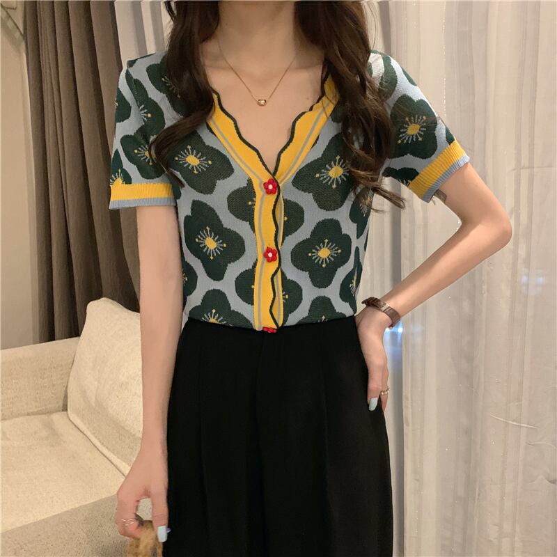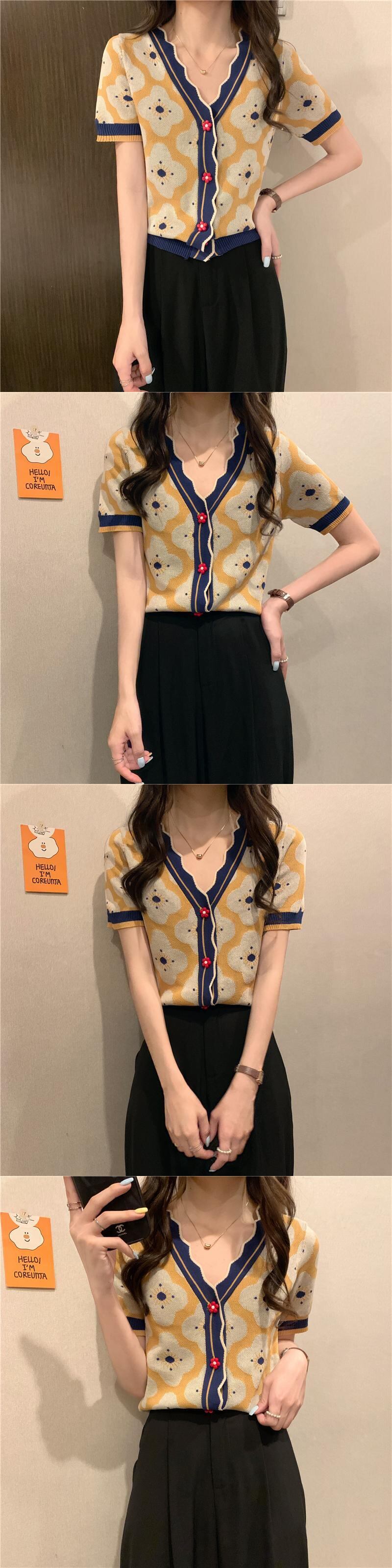ニットセーター サマー薄手スタンダードカラーFlowerデザイン カーディガンルーズトップス レトロ 夏物 フラワーデザイン 1号婦人71353898927