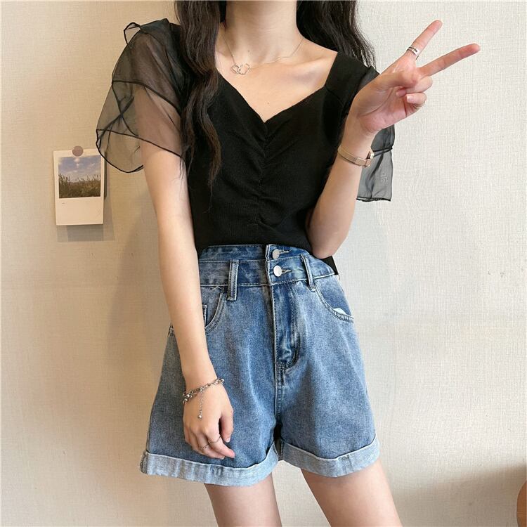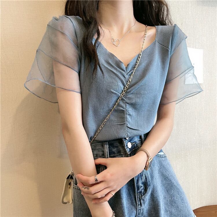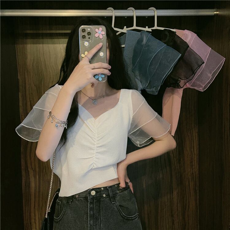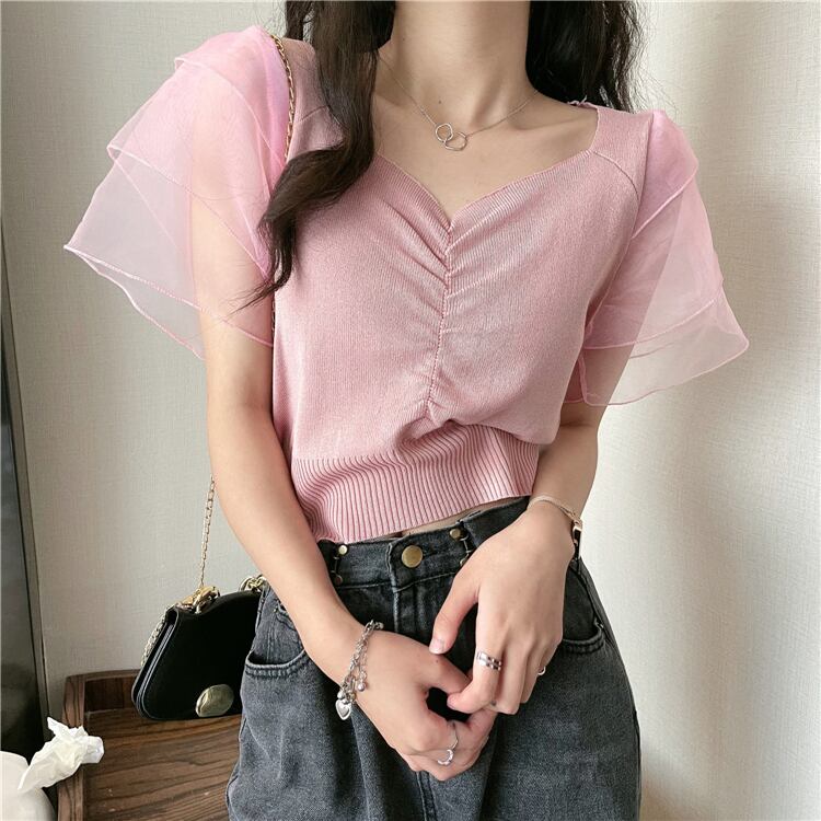 ニットセーター レディースサマー薄手スタイルメッシュショートプリーツVネックトップス 夏物 1号婦人15663795662