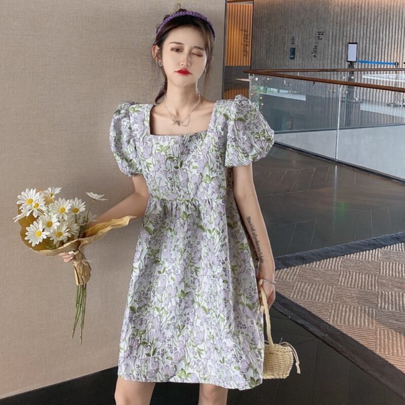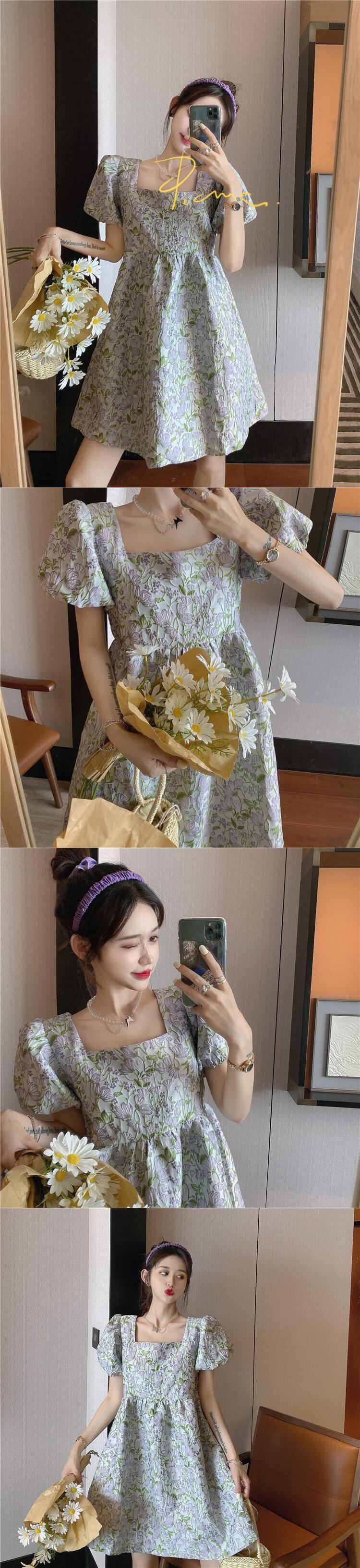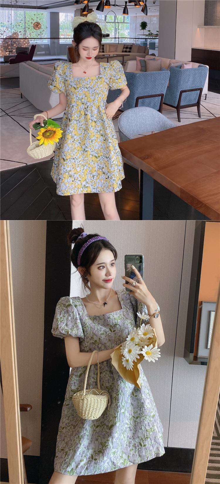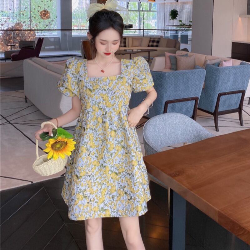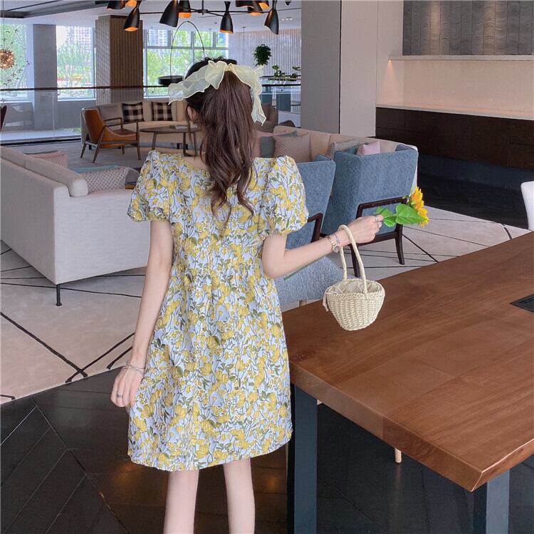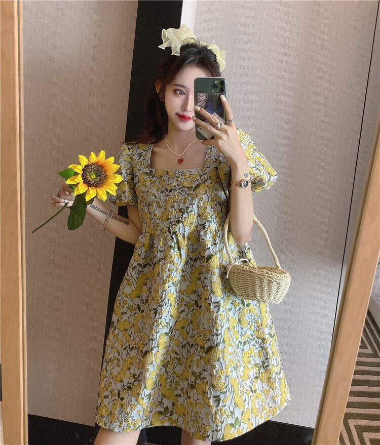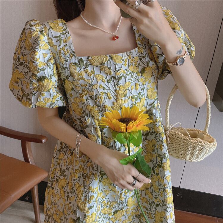 ドレス サマースタンダードカラールーズスリーブウェストフローラルスカート レトロ 大人ガーリー スウィート キュート カジュアル 夏物 花柄 スクウェア 1号婦人27218327918