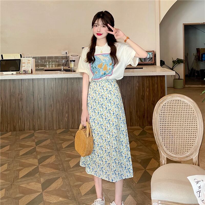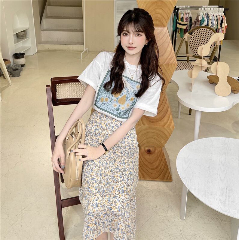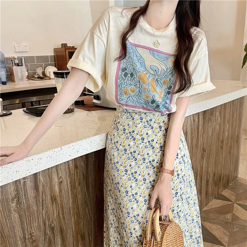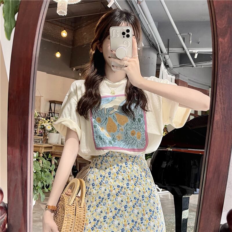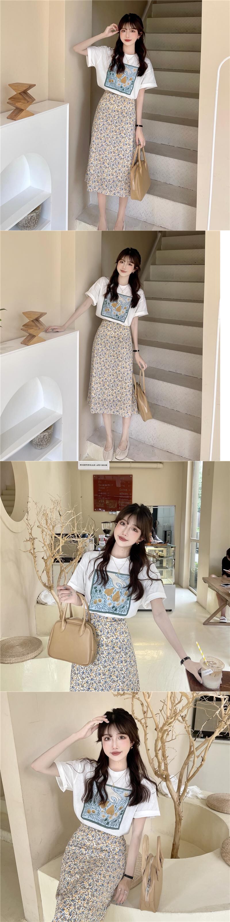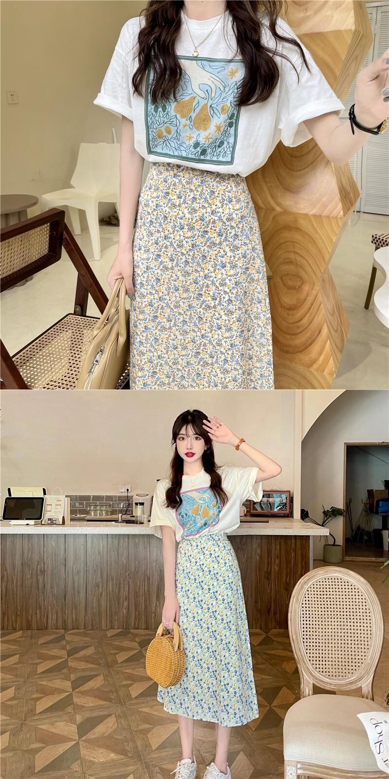 色:アプリコットT,ホワイトT,グリーンフローラルスカート,黄色の花柄スカート